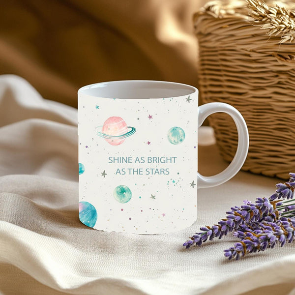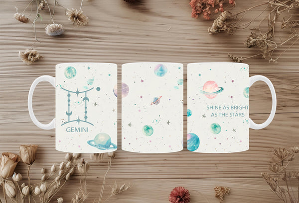 Celebrate your adaptable spirit and let your light shine with our "Shine As Bright As The Stars" Gemini Zodiac Coffee Mug! This enchanting mug features a whimsical design with pastel planets, twinkling stars, and delicate cosmic elements scattered across a soft, celestial background. On one side, it proudly displays the dualistic Gemini zodiac symbol and name, while the other side carries the inspiring message, "Shine As Bright As The Stars."