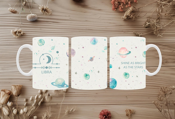 Bring balance and beauty to your day with our "Shine As Bright As The Stars" Libra Zodiac Coffee Mug! This enchanting mug features a whimsical design with pastel planets, twinkling stars, and delicate cosmic elements scattered across a soft, celestial background. On one side, it proudly displays the harmonious Libra zodiac symbol and name, while the other side carries the inspiring message, "Shine As Bright As The Stars."