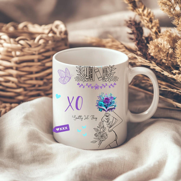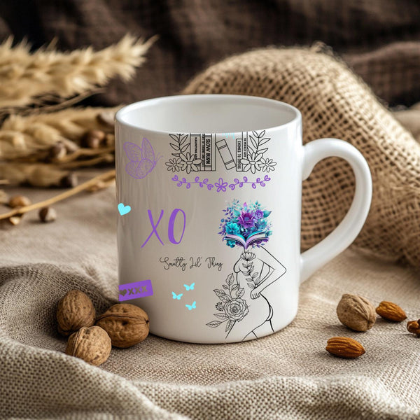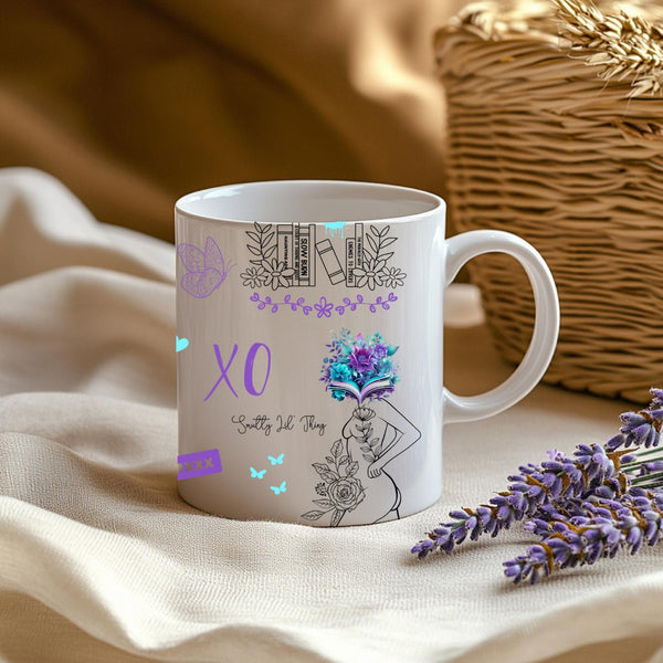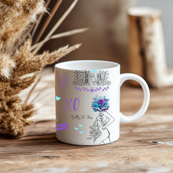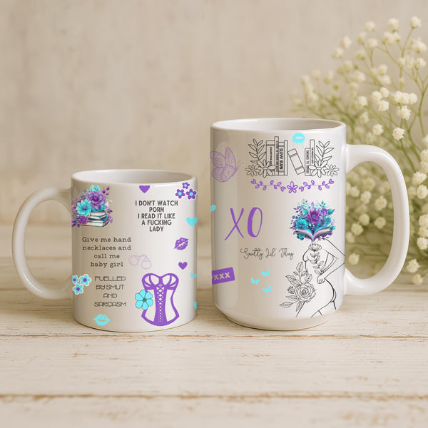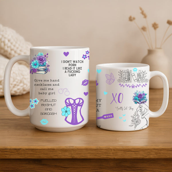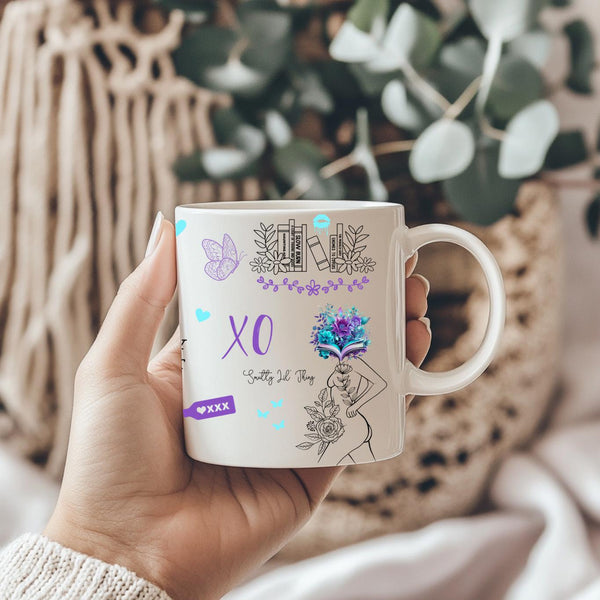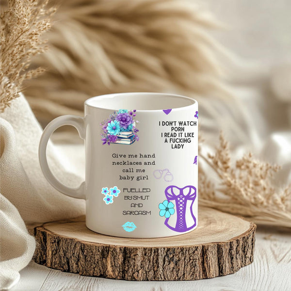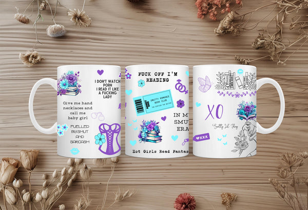Celebrate your love for all things smutty, romantic, and fantastical with this boldly designed mug! Featuring a vibrant collage of purple and teal accents, playful illustrations, and unapologetically direct phrases, this mug is perfect for the reader who loves their books as spicy as their coffee.