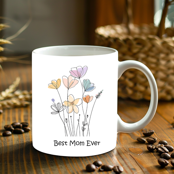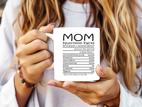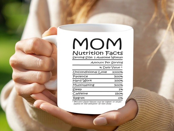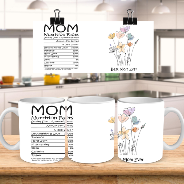 Celebrate the amazing mom in your life with this wonderfully unique "Mom Nutrition Facts" Coffee Mug! One side of the mug features a clever "Nutrition Facts" label, detailing the "ingredients" that make Mom so special, such as "Unconditional Love (1000%)," "Patience (500%)," "Hard Work (300%)," and "Multitasking (200%)," with a humorous disclaimer about daily values being higher based on the child's behavior. The other side beautifully complements this with a delicate floral design and the heartfelt message "Best Mom Ever." This mug is a perfect blend of humor and appreciation, making it an ideal gift for Mother's Day, birthdays, holidays, or simply to bring a smile to her face. It's available in both a convenient 11oz size and a more generous 15oz capacity to suit her preference. Give her a gift that's as special and multifaceted as she is!