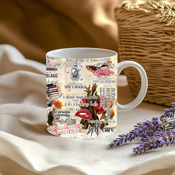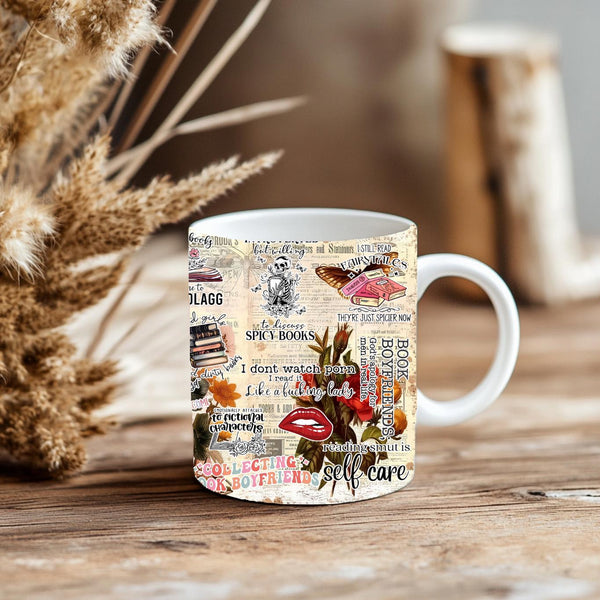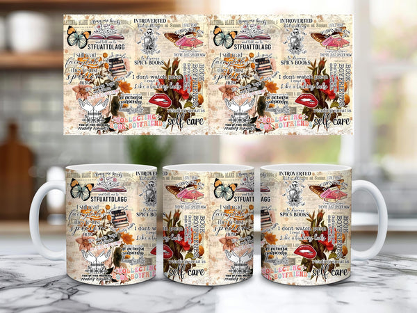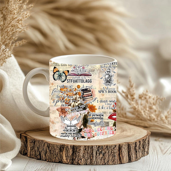 This beautifully intricate mug is an absolute feast for the eyes, perfect for the book lover who appreciates a maximalist, vintage aesthetic! The design features a layered collage of antique book pages, warm fall florals, butterflies, and bold graphics all centered around the passionate life of a dedicated reader.