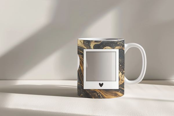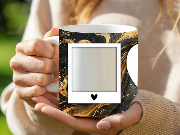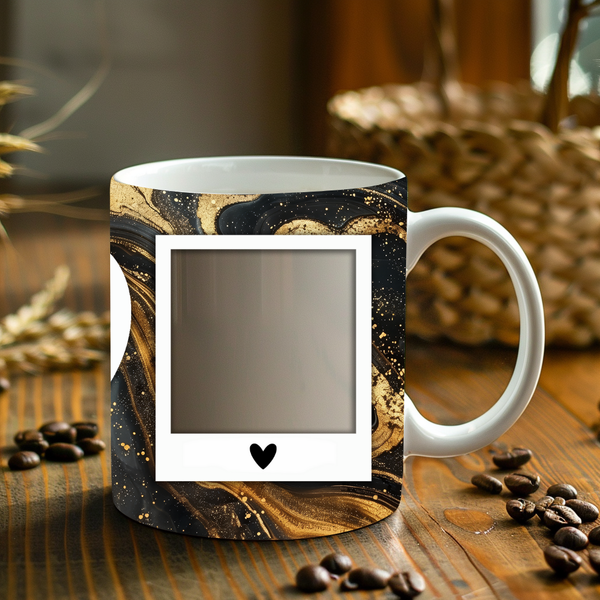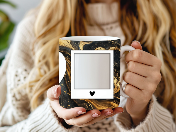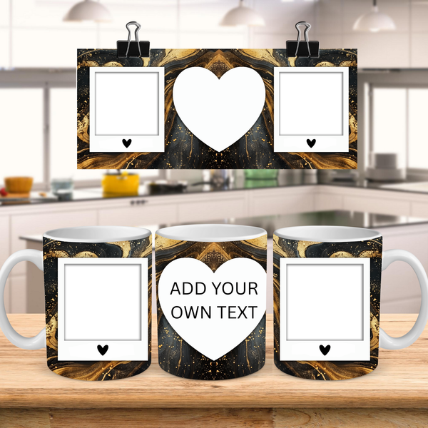 Create a truly unique and heartfelt gift with our customizable Photo & Text Coffee Mug! This stunning mug features a rich black marble design with luxurious gold veining and sparkling accents, providing a sophisticated backdrop for your special memories. It's thoughtfully designed to display two of your cherished photos within classic polaroid-style frames, each adorned with a charming heart detail. The centerpiece is a prominent heart-shaped frame where you can "ADD YOUR OWN TEXT," making it perfectly tailored for a personalized message, name, or date. Perfect for daily coffee or tea, this mug transforms your drinkware into a personalized keepsake or a thoughtful gift for birthdays, anniversaries, or just because. Available in both 11oz and 15oz sizes to suit your preference.