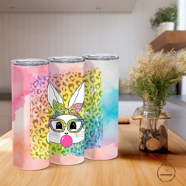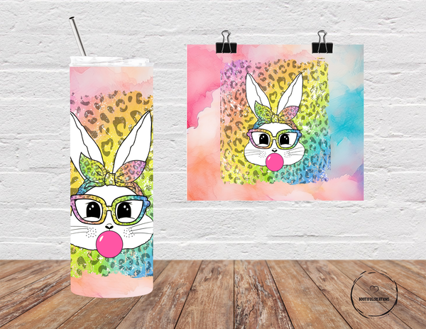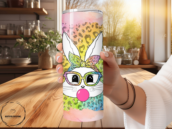 Experience your drink in style with our Colorful Leopard Print Bunny Tumbler! This tumbler features a playful bunny blowing bubble gum, adorned with a vibrant leopard print design. Keep your drink hot for up to 6 hours or cold for up to 24 hours. Personalize it with your name for a touch of uniqueness. Upgrade your tumbler game now!