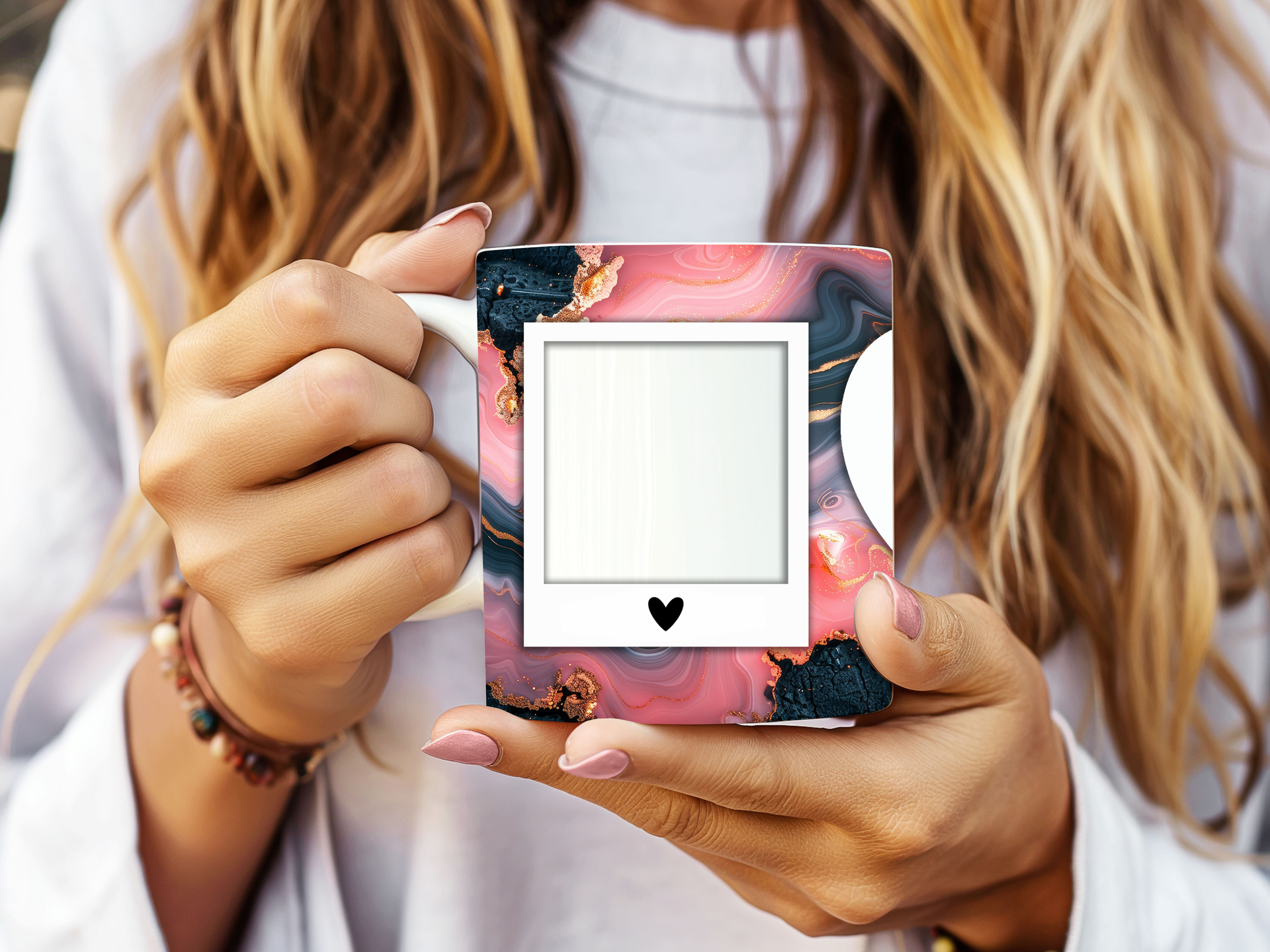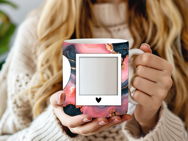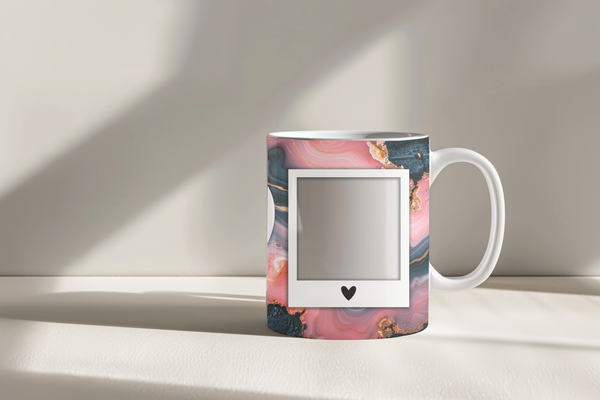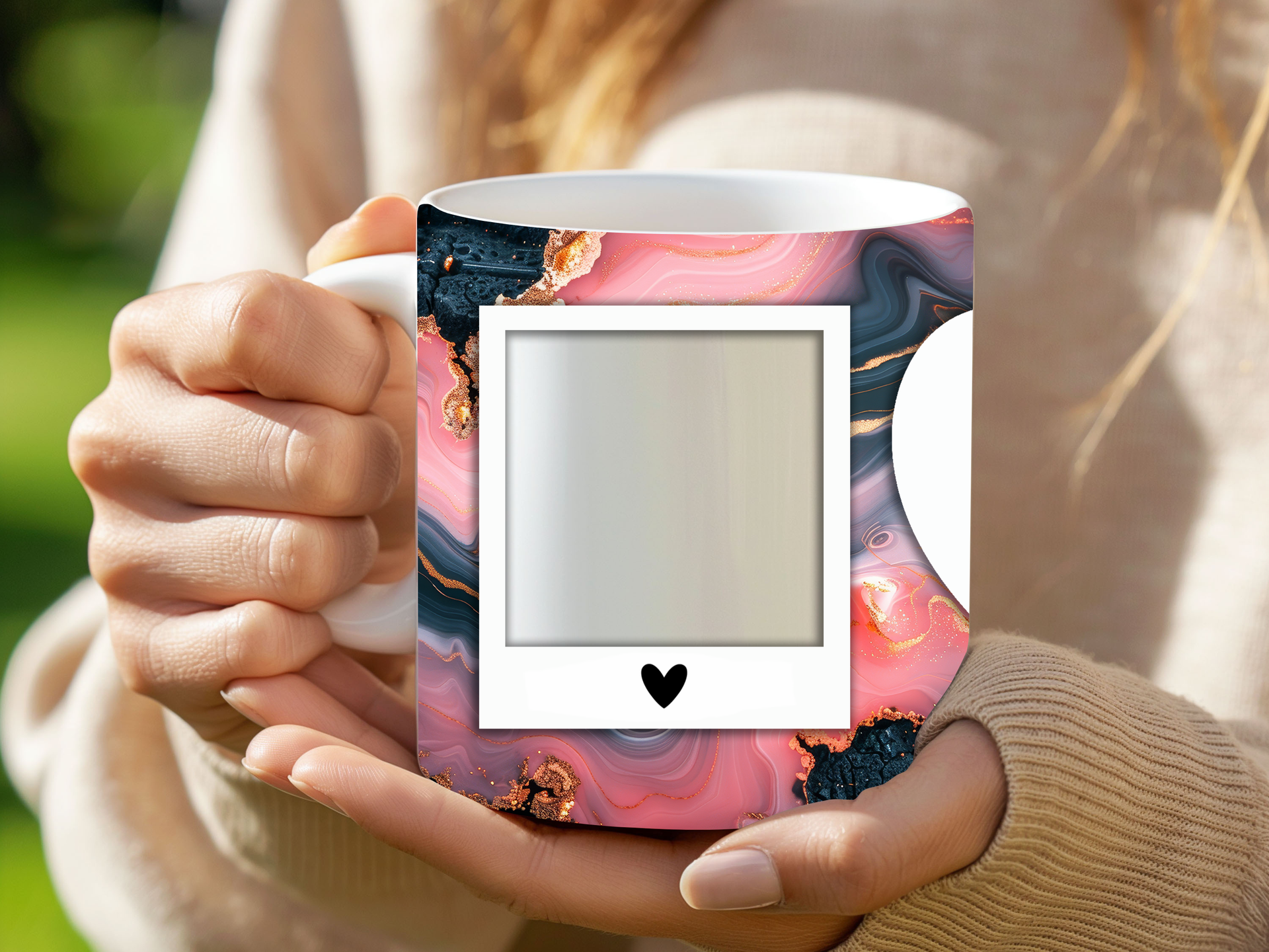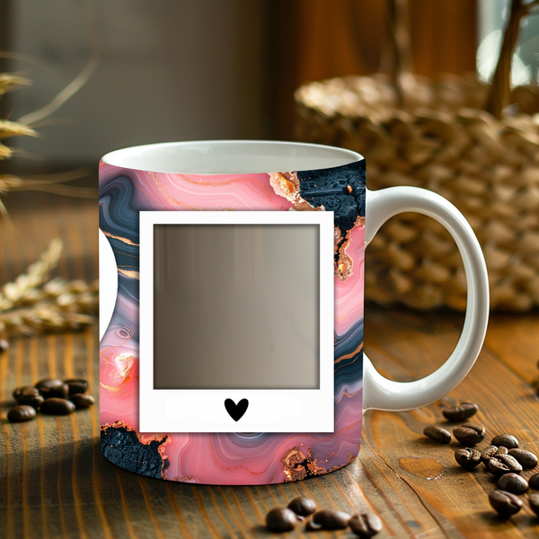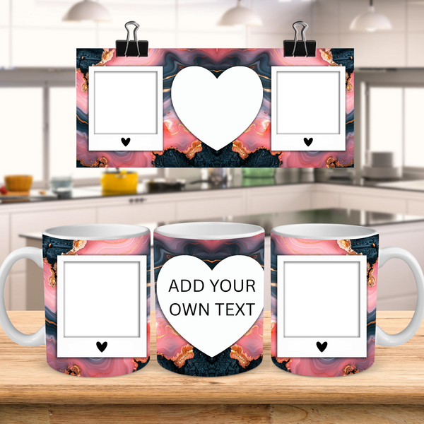 Showcase your cherished memories and heartfelt messages with our stunning customizable Photo & Text Coffee Mug! This elegant mug features a dynamic and artistic marble design, blending vibrant pinks, deep blues, and shimmering gold accents, creating a captivating backdrop for your personalization. It's thoughtfully designed to display two of your beloved photos within classic polaroid-style frames, each subtly adorned with a charming heart detail. The central heart shape is perfect for adding your own custom text, making it truly unique. Perfect for your daily coffee, tea, or any hot beverage, this mug transforms into a unique personal keepsake or a thoughtful gift for family and friends on any special occasion. It's available in both a convenient 11oz size and a more generous 15oz capacity to suit your preference. Simply add your desired photos and text to create a truly personalized and heartwarming mug that will be treasured for years to come!