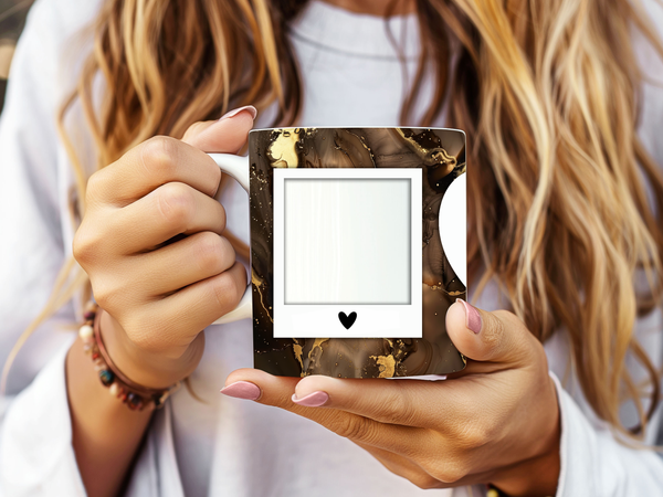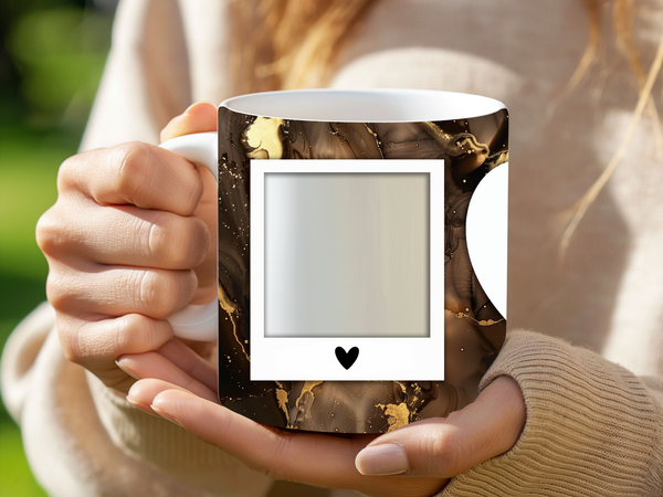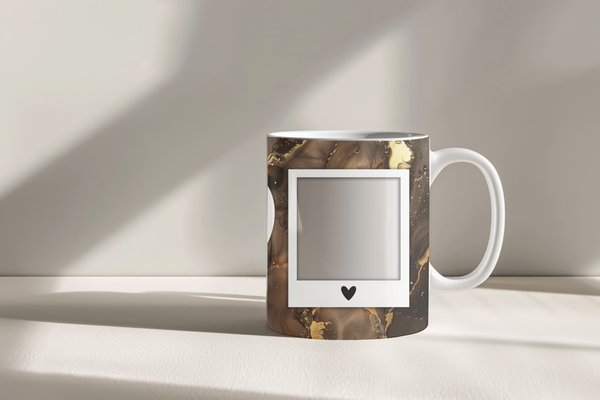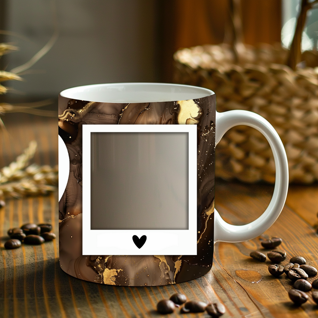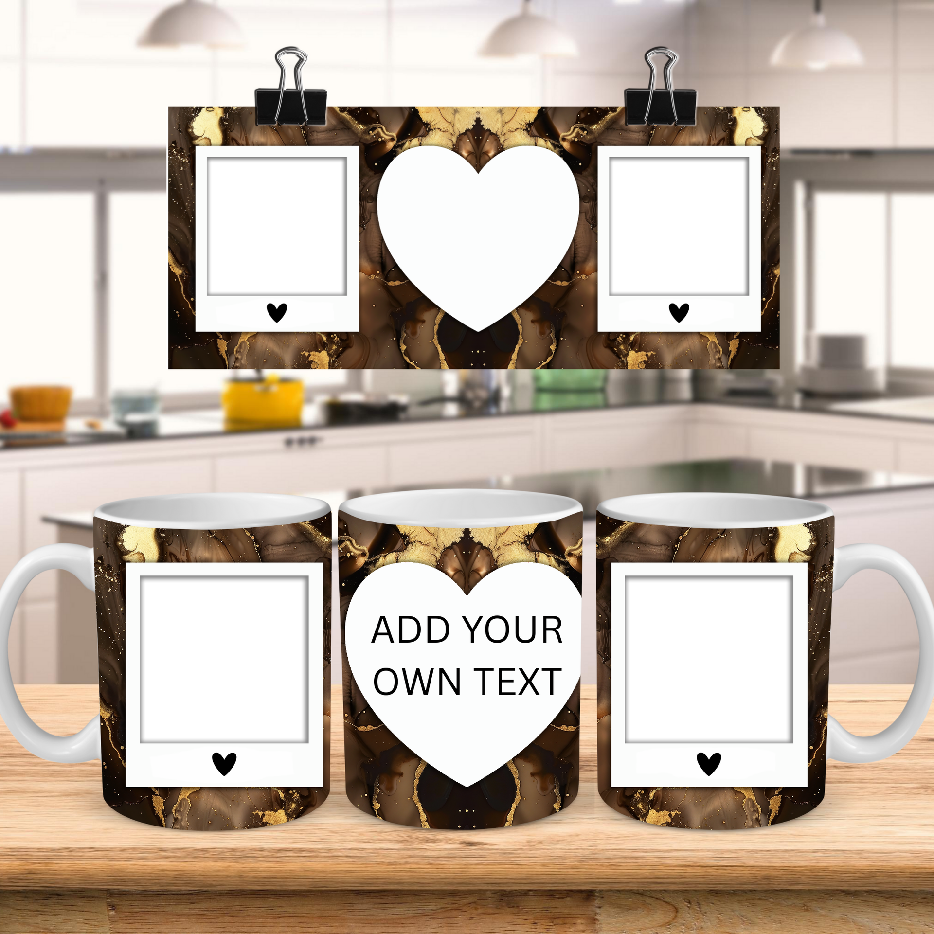 Showcase your cherished memories and heartfelt messages with our stunning customizable Photo & Text Coffee Mug! This elegant mug features a rich, earthy brown marble design, beautifully swirled with captivating gold accents, creating a warm and artistic backdrop for your personalization. It's thoughtfully designed to display two of your beloved photos within classic polaroid-style frames, each subtly adorned with a charming heart detail. The central heart shape is perfect for adding your own custom text, making it truly unique. Perfect for your daily coffee, tea, or any hot beverage, this mug transforms into a unique personal keepsake or a thoughtful gift for family and friends on any special occasion. It's available in both a convenient 11oz size and a more generous 15oz capacity to suit your preference. Simply add your desired photos and text to create a truly personalized and heartwarming mug that will be treasured for years to come!