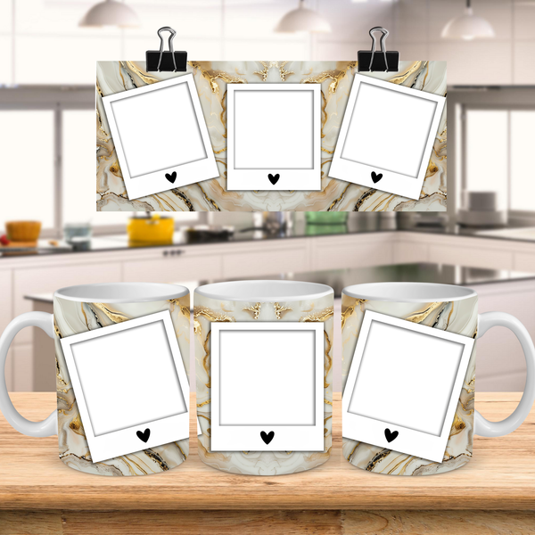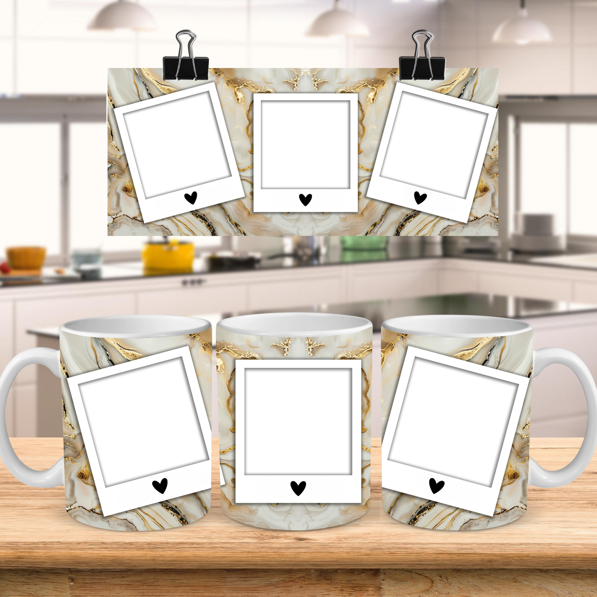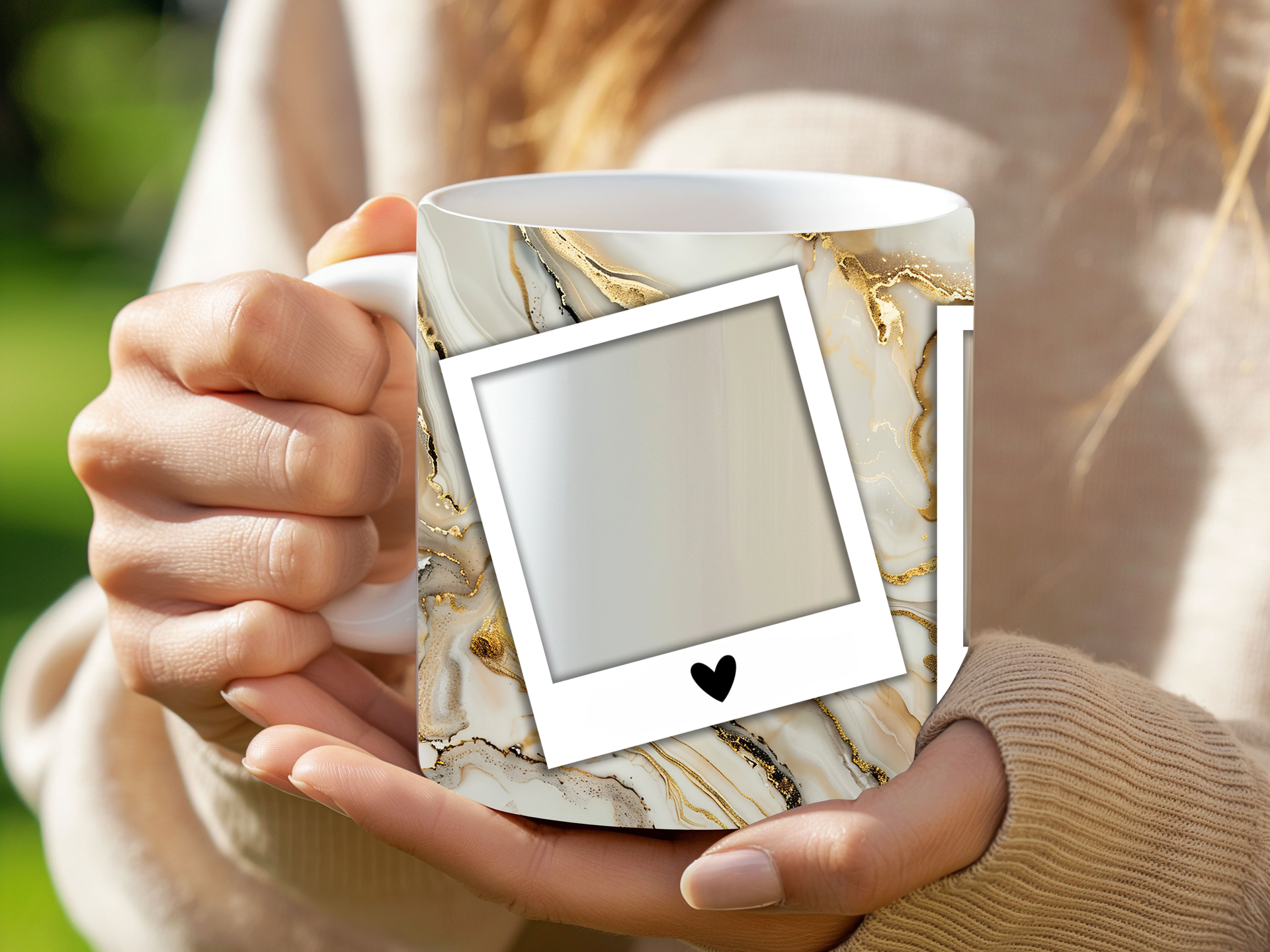 Showcase your cherished memories with our stunning customizable Photo Frame Coffee Mug! This elegant mug features a luxurious white marble design, beautifully accented with captivating gold veining, creating a sophisticated and artistic backdrop for your favorite moments. Each mug is thoughtfully designed to display three of your beloved photos within classic polaroid-style frames, each subtly adorned with a charming heart detail. Perfect for your daily coffee, tea, or any hot beverage, this mug transforms into a unique personal keepsake or a thoughtful gift for family and friends on any special occasion. It's available in both a convenient 11oz size and a more generous 15oz capacity to suit your preference. Simply add your desired photos to create a truly personalized and heartwarming mug that will be treasured for years to come!