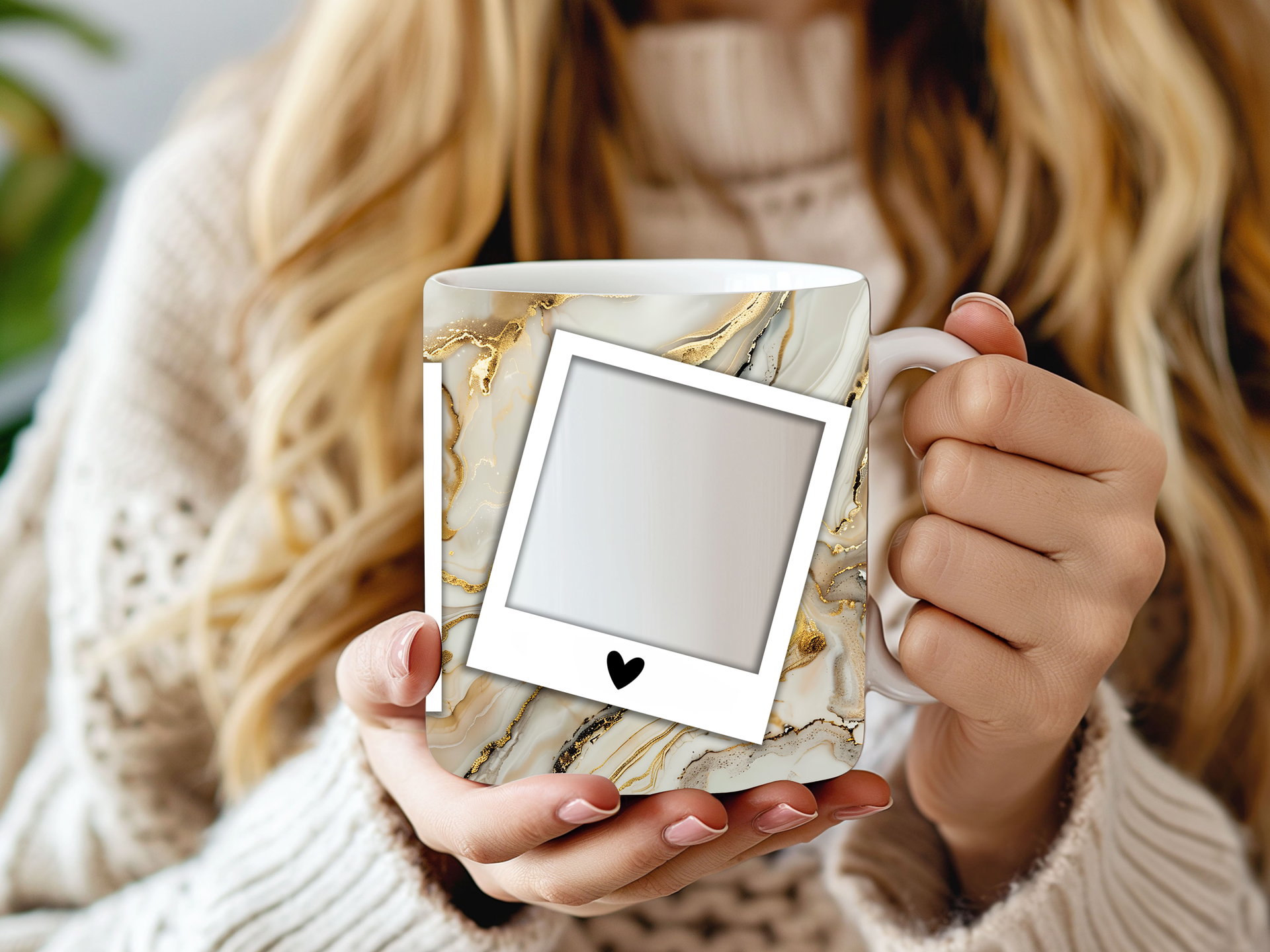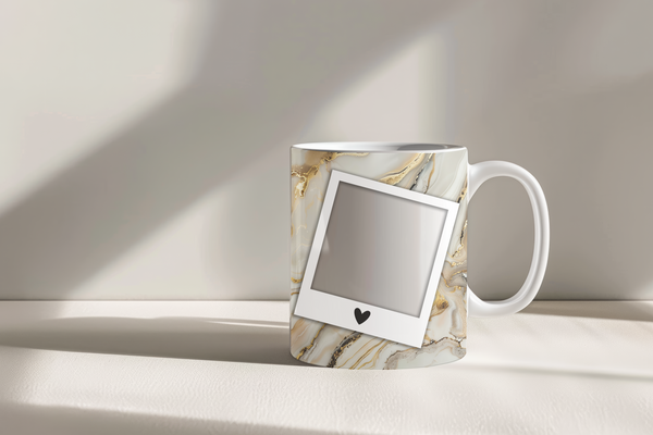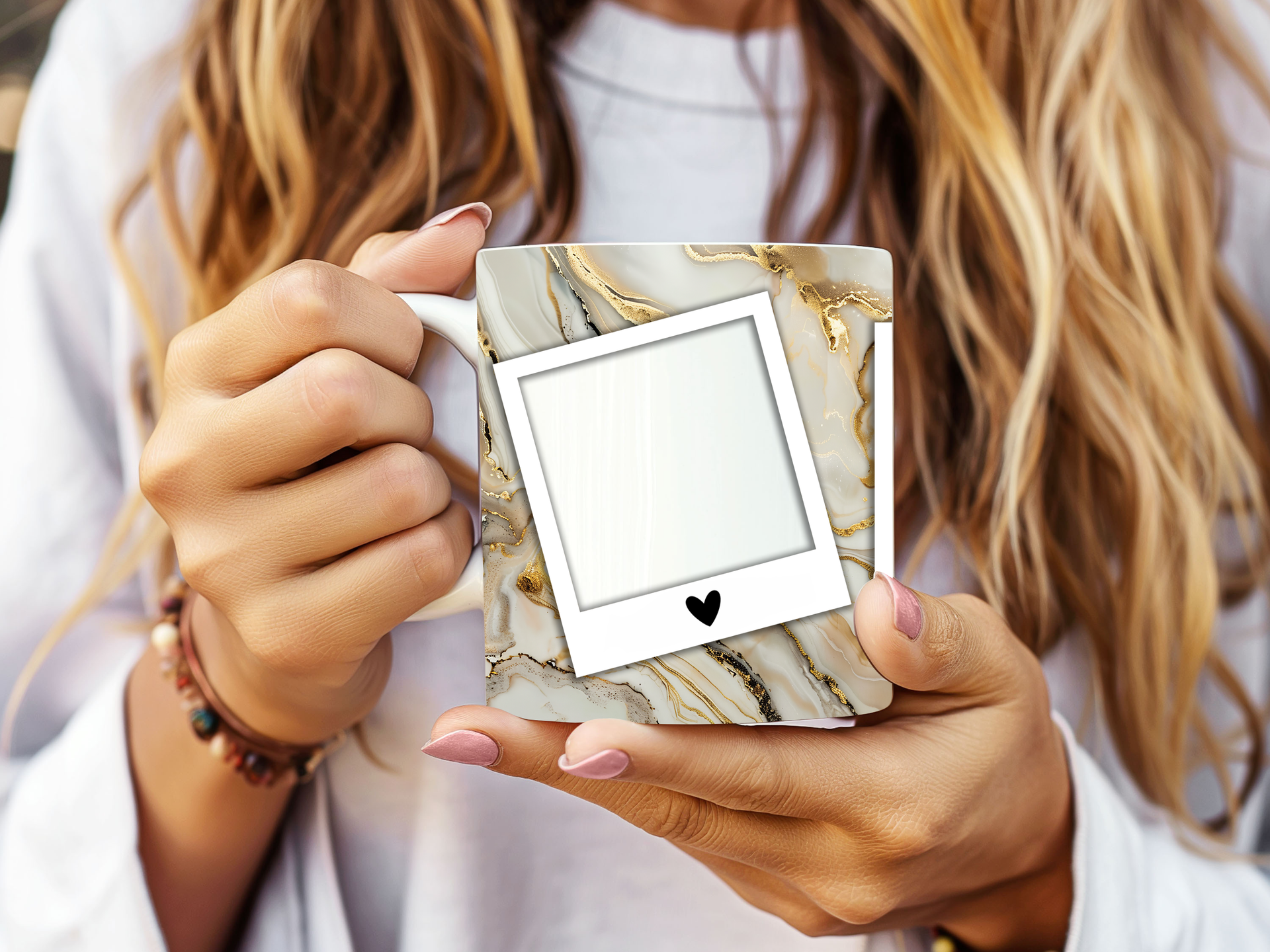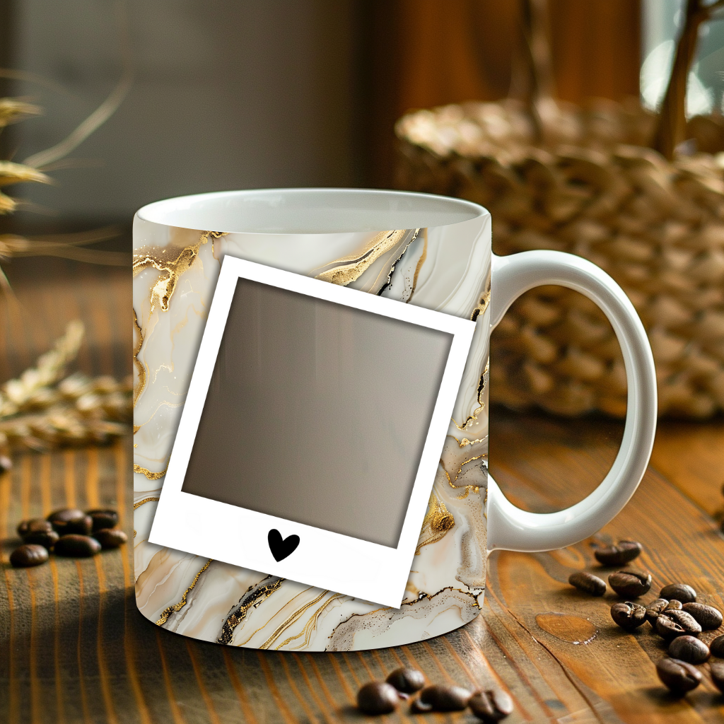 Showcase your cherished memories with our stunning customizable Photo Frame Coffee Mug! This elegant mug features a luxurious white marble design, beautifully accented with captivating gold veining, creating a sophisticated and artistic backdrop for your favorite moments. Each mug is thoughtfully designed to display three of your beloved photos within classic polaroid-style frames, each subtly adorned with a charming heart detail. Perfect for your daily coffee, tea, or any hot beverage, this mug transforms into a unique personal keepsake or a thoughtful gift for family and friends on any special occasion. It's available in both a convenient 11oz size and a more generous 15oz capacity to suit your preference. Simply add your desired photos to create a truly personalized and heartwarming mug that will be treasured for years to come!