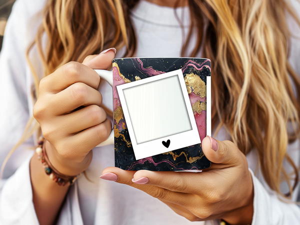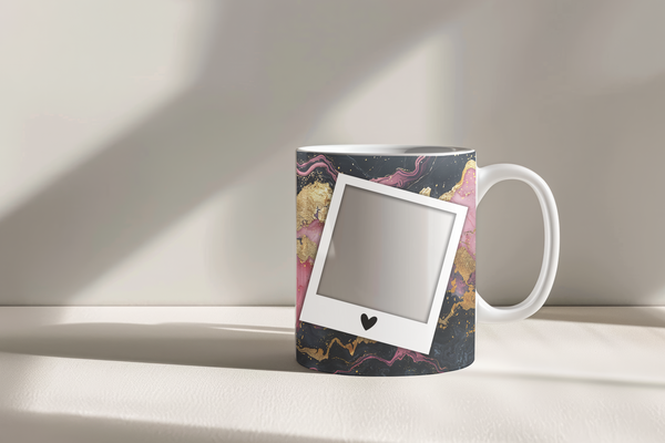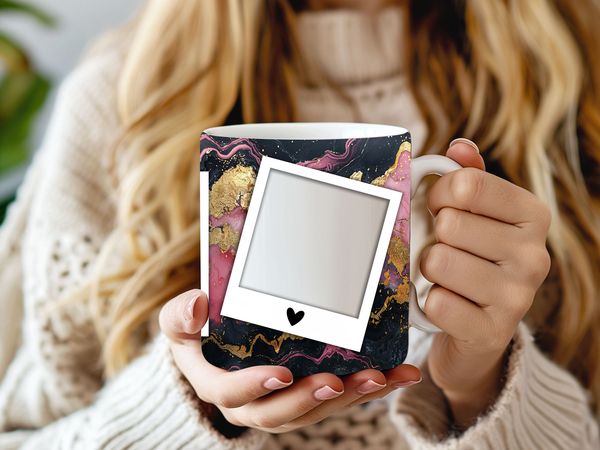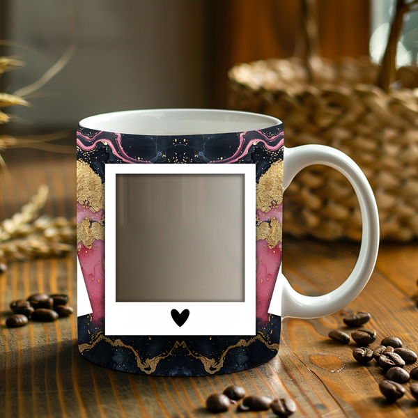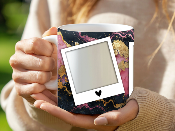 Showcase your cherished memories with our stunning customizable Photo Frame Coffee Mug! This elegant mug features a striking pink and gold marble design, creating a vibrant and artistic backdrop for your favorite moments. Each mug is thoughtfully designed to display three of your beloved photos within classic polaroid-style frames, each subtly adorned with a charming heart detail. Perfect for your daily coffee, tea, or any hot beverage, this mug transforms into a unique personal keepsake or a thoughtful gift for family and friends on any special occasion. It's available in both a convenient 11oz size and a more generous 15oz capacity to suit your preference. Simply add your desired photos to create a truly personalized and heartwarming mug that will be treasured for years to come!