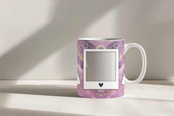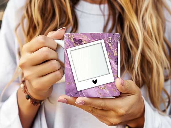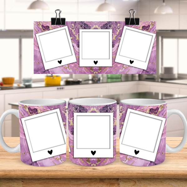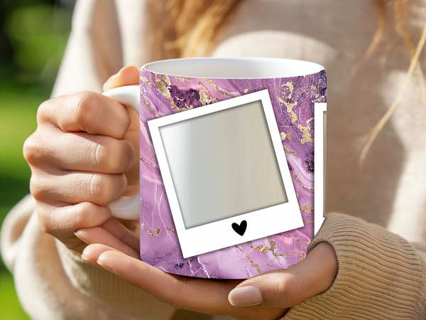 Showcase your cherished memories with our stunning customizable Photo Frame Coffee Mug! This elegant mug features a rich purple marble design, beautifully swirled with captivating gold accents, creating a luxurious and artistic backdrop for your favorite moments. Each mug is thoughtfully designed to display three of your beloved photos within classic polaroid-style frames, each subtly adorned with a charming heart detail. Perfect for your daily coffee, tea, or any hot beverage, this mug transforms into a unique personal keepsake or a thoughtful gift for family and friends on any special occasion. It's available in both a convenient 11oz size and a more generous 15oz capacity to suit your preference. Simply add your desired photos to create a truly personalized and heartwarming mug that will be treasured for years to come!