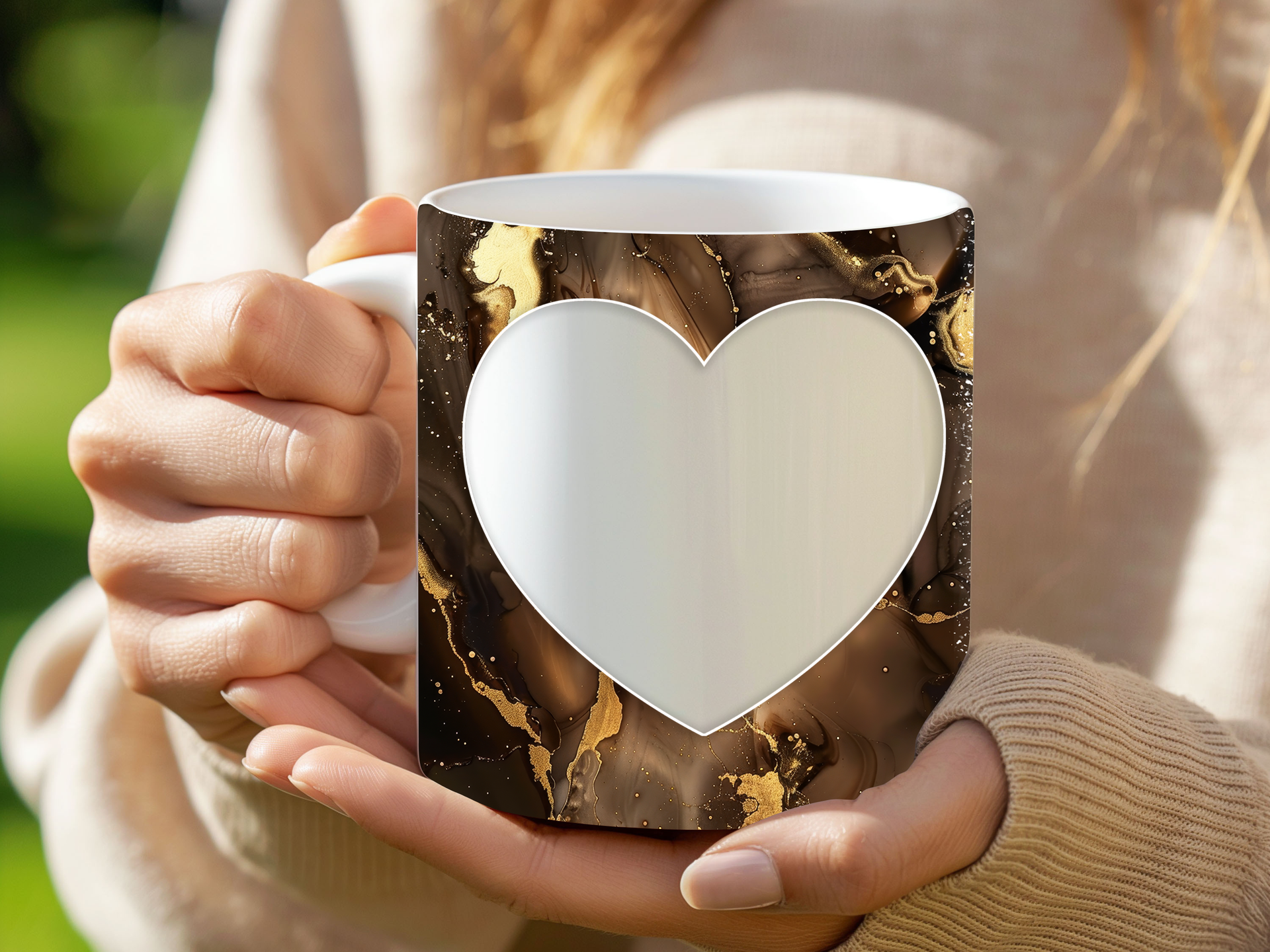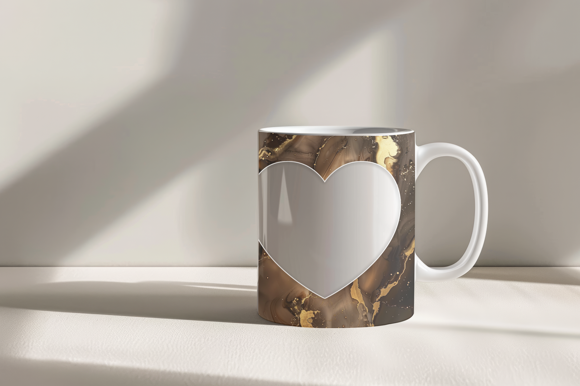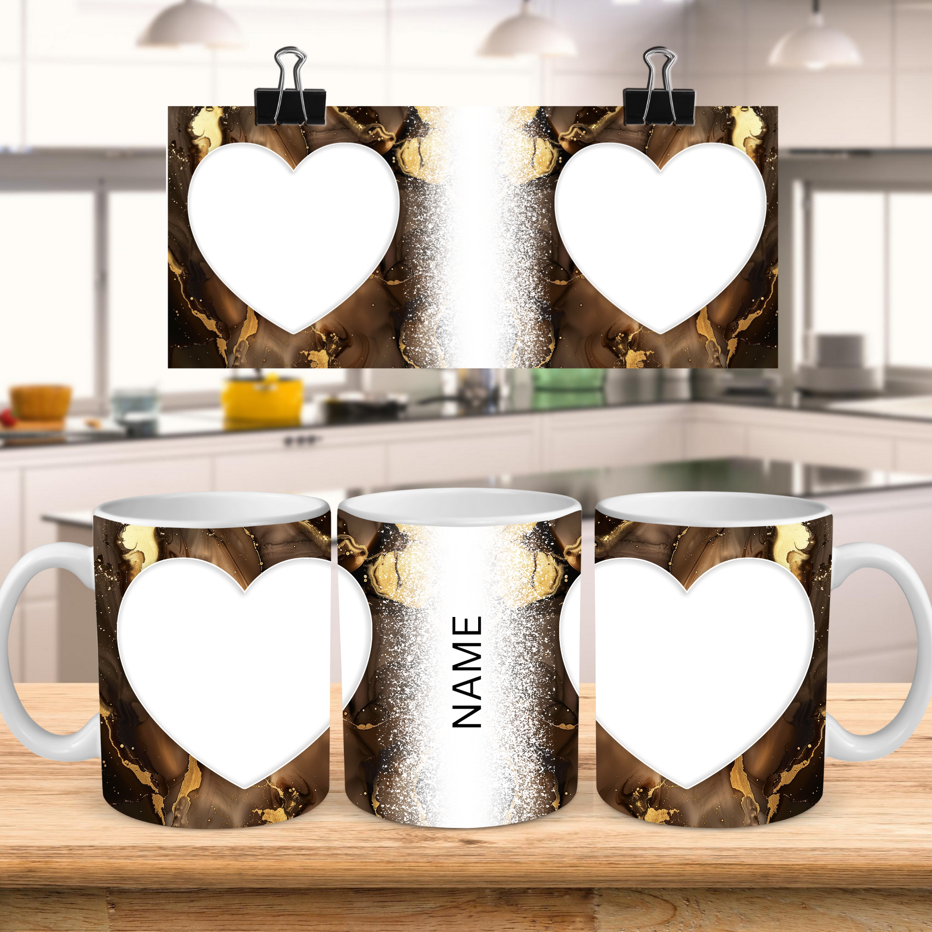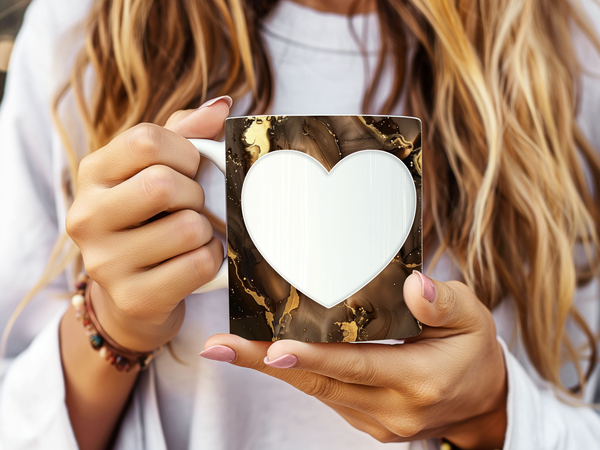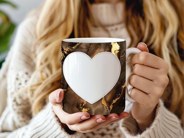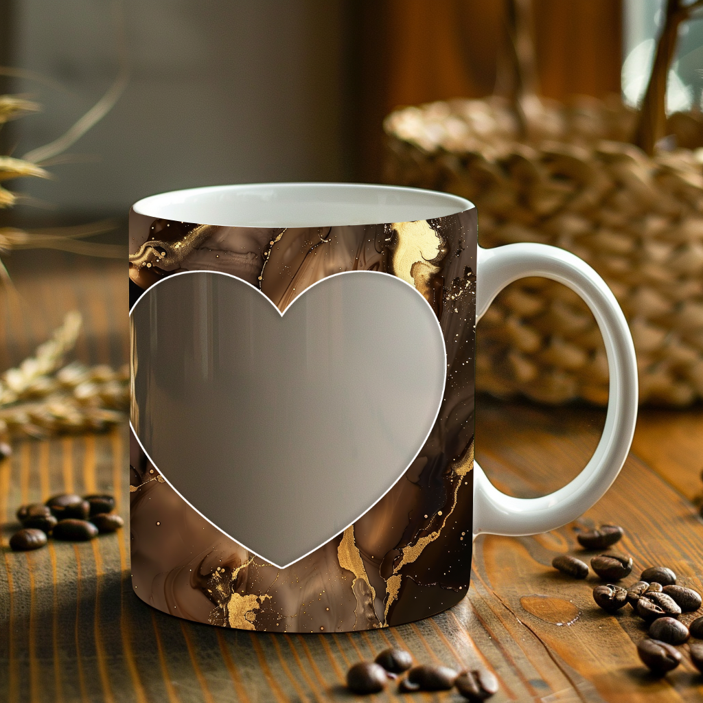 Showcase your cherished memories and a special name with our stunning customizable Photo & Name Coffee Mug! This elegant mug features a rich brown marble design, beautifully swirled with captivating gold accents, creating a luxurious and artistic backdrop for your personalization. It's thoughtfully designed to display two of your beloved photos within classic heart-shaped cutouts, symbolizing love and connection. The central design features a prominent vertical space for adding a custom name, making it truly unique and personal. Perfect for your daily coffee, tea, or any hot beverage, this mug transforms into a unique personal keepsake or a thoughtful gift for family and friends on any special occasion. It's available in both a convenient 11oz size and a more generous 15oz capacity to suit your preference. Simply add your desired photos and name to create a truly personalized and heartwarming mug that will be treasured for years to come!