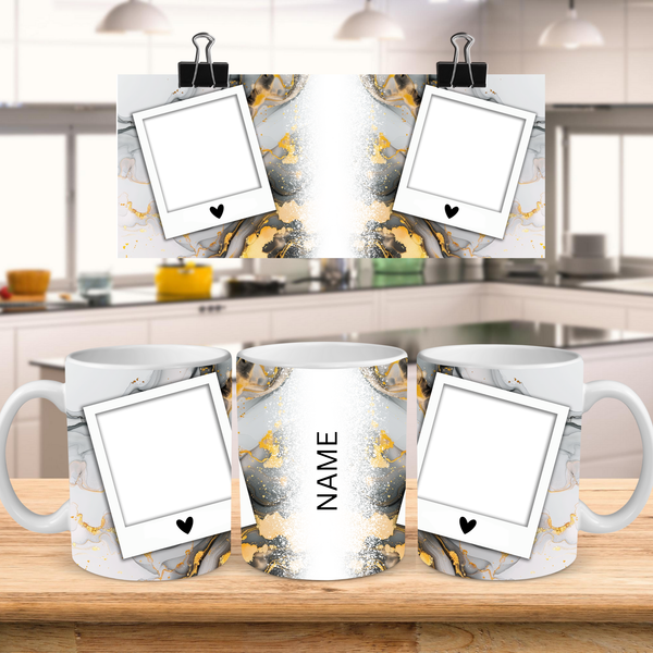 Customizable Photo & Name Coffee Mug - Elegant Grey & Gold Marble Design