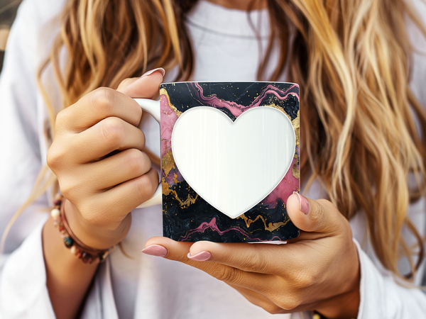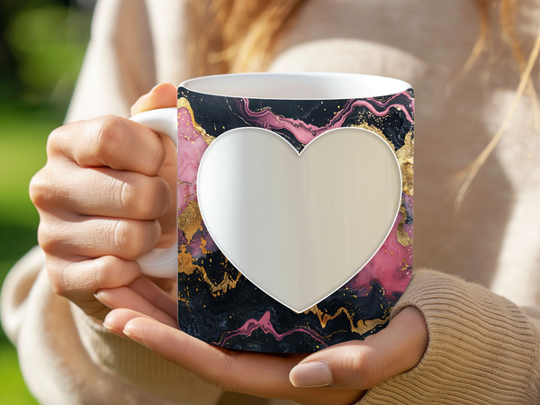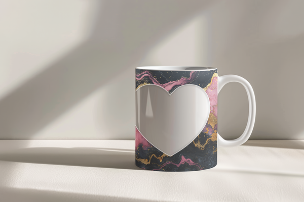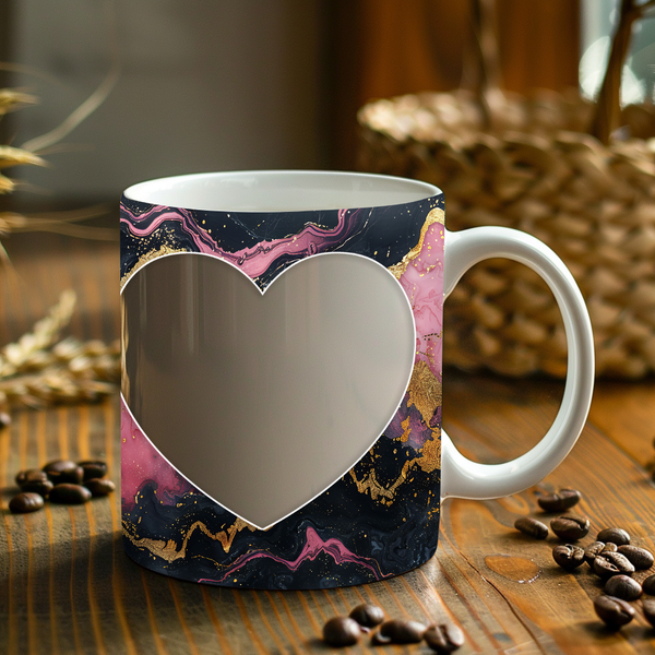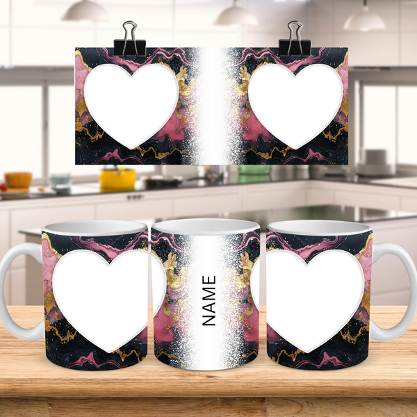 Showcase your cherished memories and a special name with our stunning customizable Photo & Name Coffee Mug! This elegant mug features a dynamic and artistic marble design, blending vibrant pinks, deep blacks, and shimmering gold accents, creating a captivating backdrop for your personalization. It's thoughtfully designed to display two of your beloved photos within classic heart-shaped cutouts, symbolizing love and connection. The central design features a prominent vertical space for adding a custom name, making it truly unique and personal. Perfect for your daily coffee, tea, or any hot beverage, this mug transforms into a unique personal keepsake or a thoughtful gift for family and friends on any special occasion. It's available in both a convenient 11oz size and a more generous 15oz capacity to suit your preference. Simply add your desired photos and name to create a truly personalized and heartwarming mug that will be treasured for years to come!