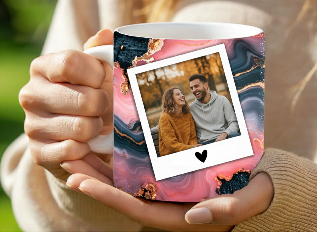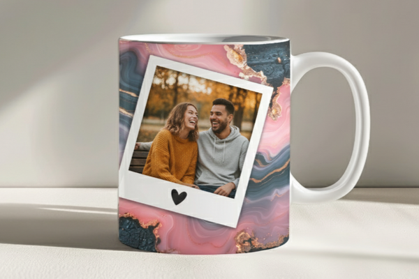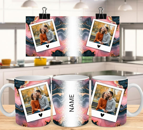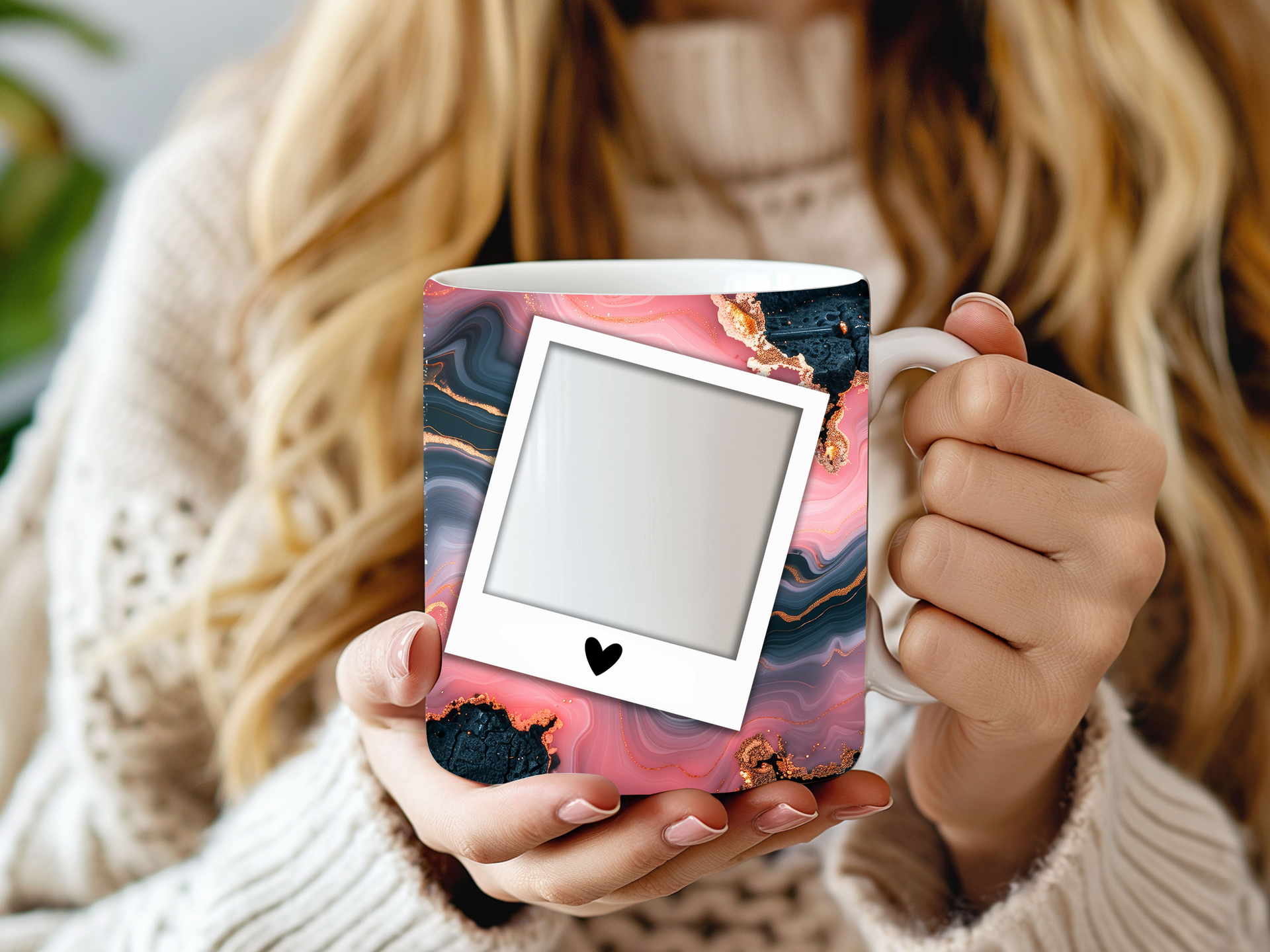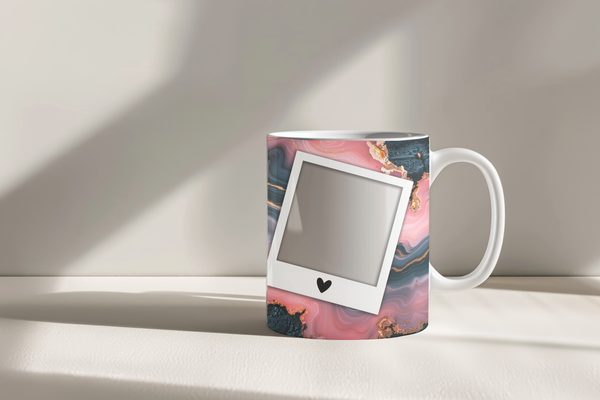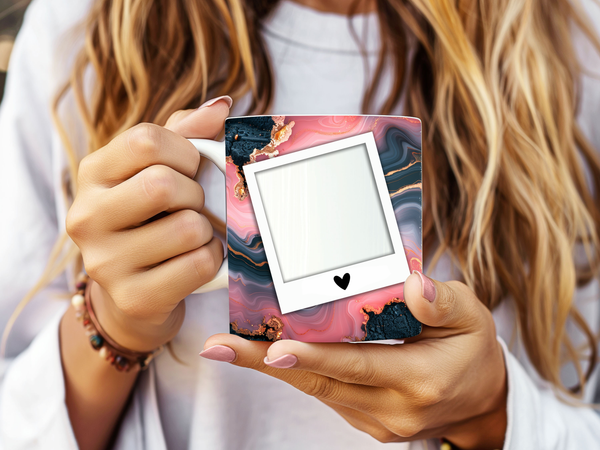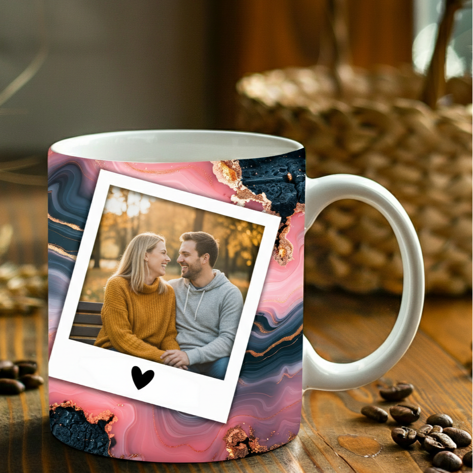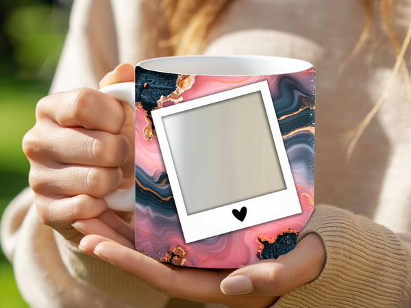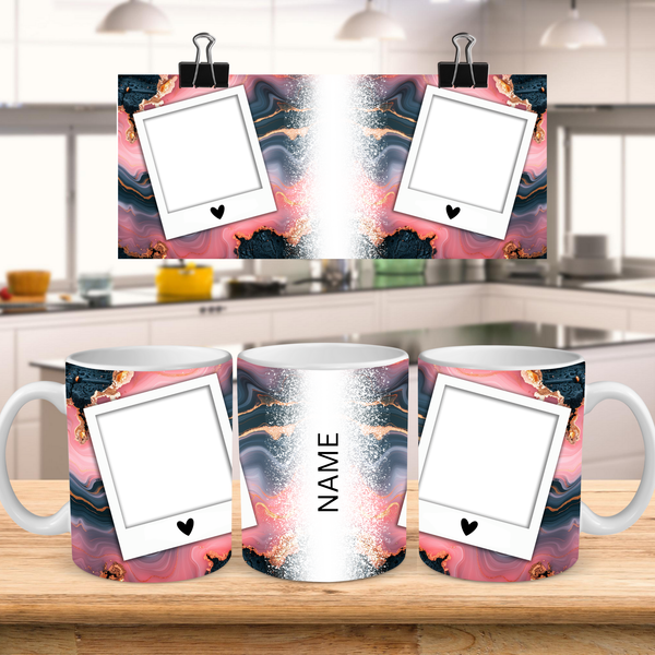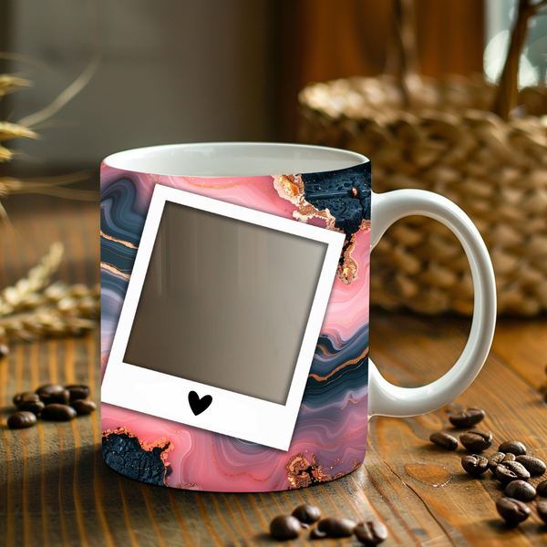 Start your day with a splash of vibrant style and cherished memories using our Dynamic Pink & Blue Marble Personalized Photo Mug. This eye-catching mug features an intricate abstract design, swirling with beautiful shades of pink, deep blue, and luxurious gold accents. Two classic polaroid-style frames, each adorned with a sweet little heart, are perfectly positioned to display your favorite photos, adding a truly personal touch. Crafted from durable ceramic and available in both the popular 11oz and generous 15oz sizes to suit any preference.