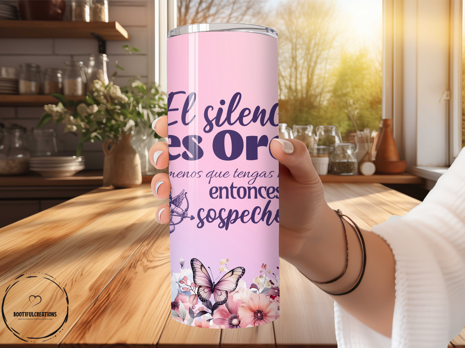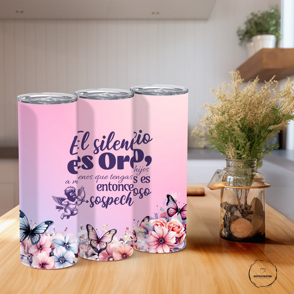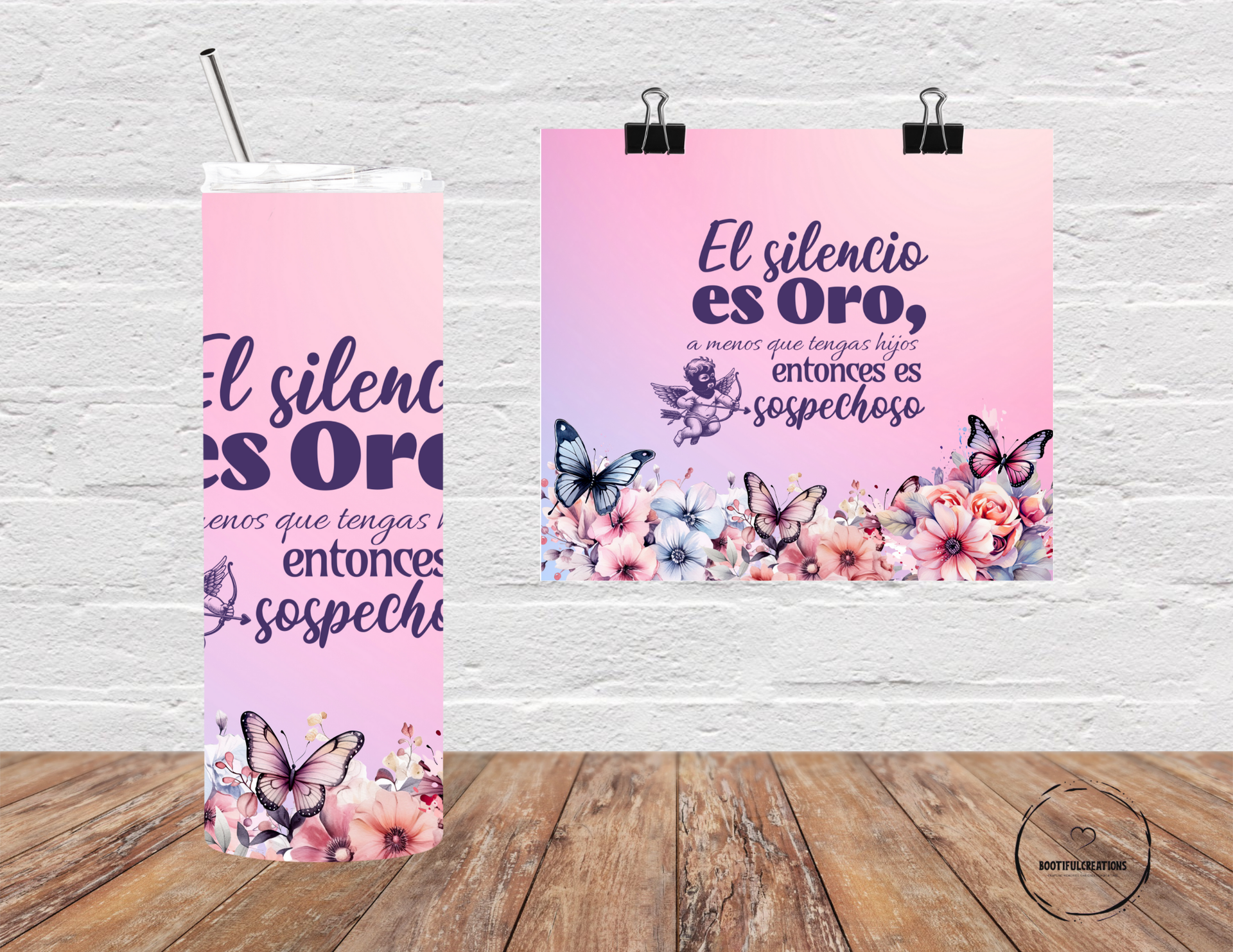 Stay hydrated in style with our El Silencio es Oro Tumbler. Featuring a beautiful floral and butterfly design and the witty phrase "El silencio es Oro, a menos que tengas hijos entonces es sospechoso", this tumbler keeps your drinks hot for up to 6 hours and cold for up to 24 hours. Personalize it with a name for a truly unique touch. Perfect for busy parents on-the-go!