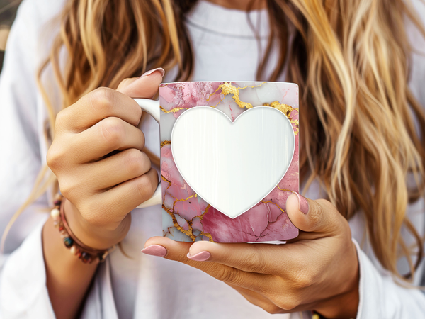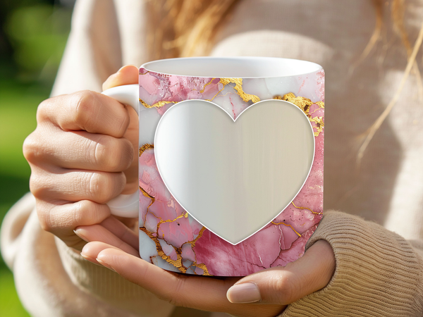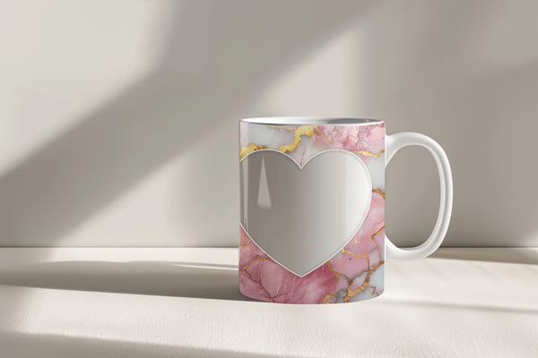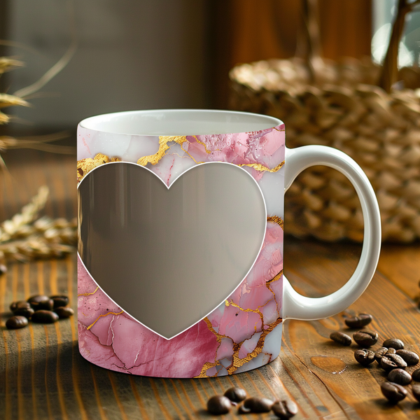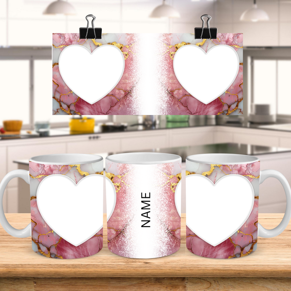 Indulge in a blend of elegance and personal sentiment with our Elegant Pink Marble Heart Photo Mug. This stunning mug features a beautiful soft pink marble pattern adorned with luxurious gold veining, creating a sophisticated and romantic backdrop. Two prominent heart-shaped frames are ready to showcase your most cherished photos, while the sparkling white and pink gradient central stripe provides a stylish contrast and a dedicated space for a personalized name. Available in both popular 11oz and generous 15oz sizes to suit every preference.