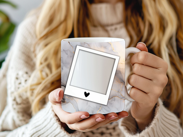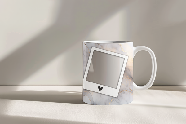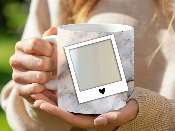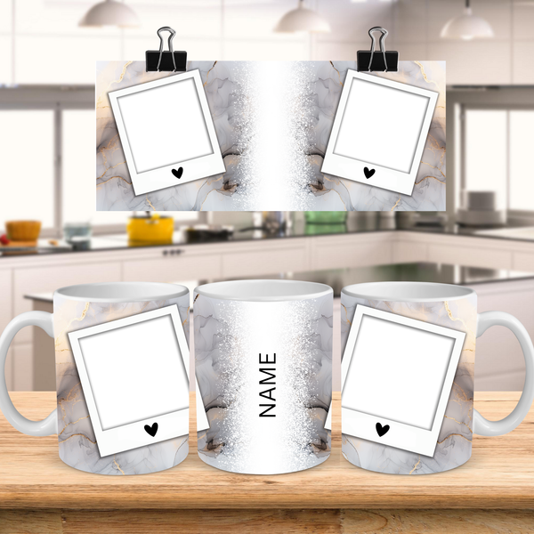 Indulge in your favorite beverages with our elegant White & Gold Marble Personalized Photo Coffee Mug. This sophisticated design features a delicate blend of white, grey, and soft gold marble patterns, highlighted by a shimmering white and silver vertical stripe. Each mug is thoughtfully designed with two classic polaroid-style frames, complete with a charming heart detail, ready for your most cherished photos. The central stripe offers a dedicated space for a personalized name, making this mug a truly unique and heartfelt item. Available in both 11oz and 15oz sizes, it's a perfect blend of style and sentiment, ideal for personal use or as a memorable gift for any occasion.