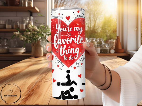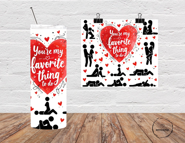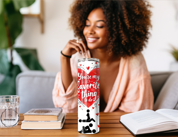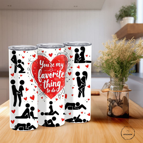 Indulge in pure joy with our Favorite Thing to Do Tumbler! Relax and sip for up to 6 hours hot or 24 hours cold. Adorned with fun and flirty sexual positions and hearts, this tumbler can also be personalized with a name. Get yours now and make every sip special!