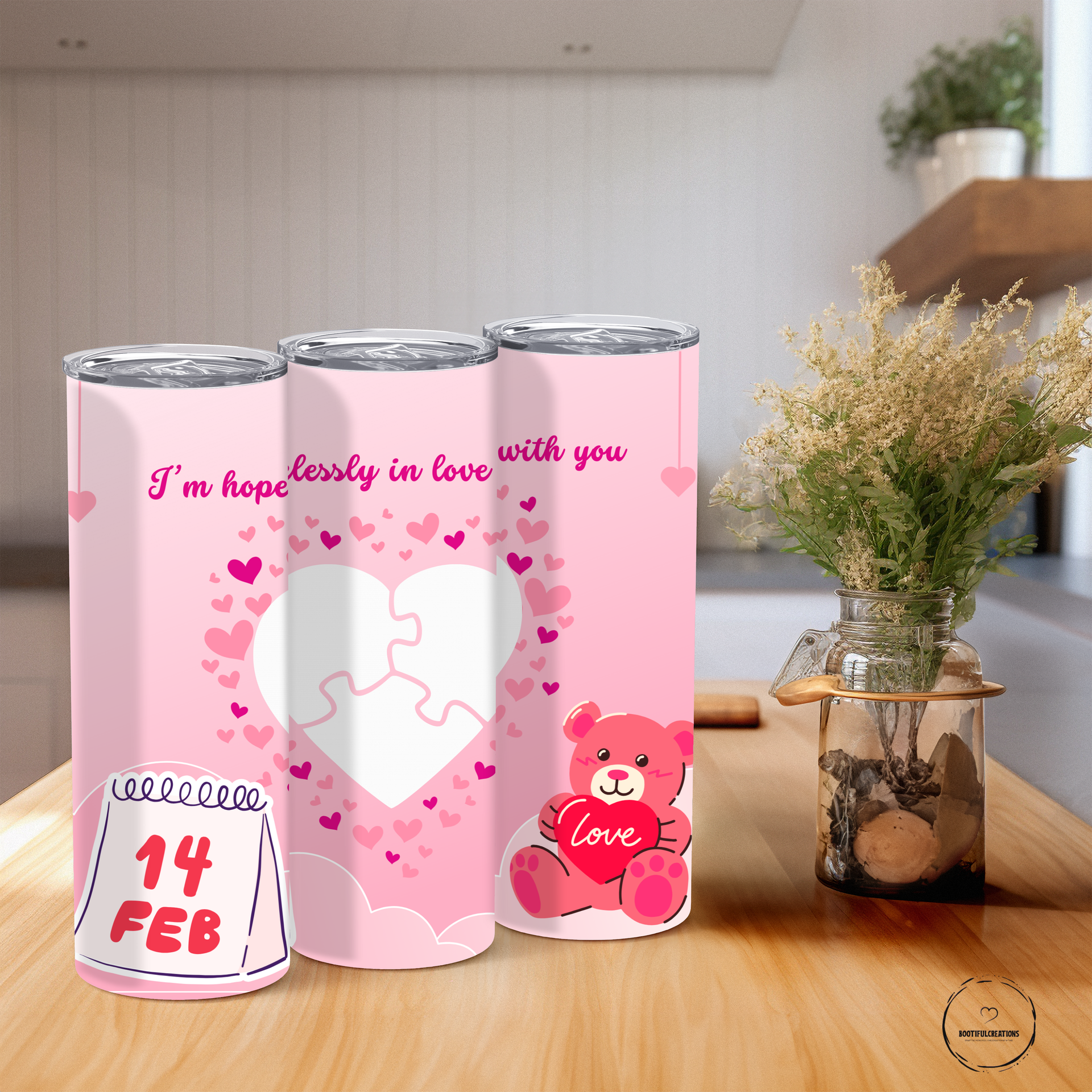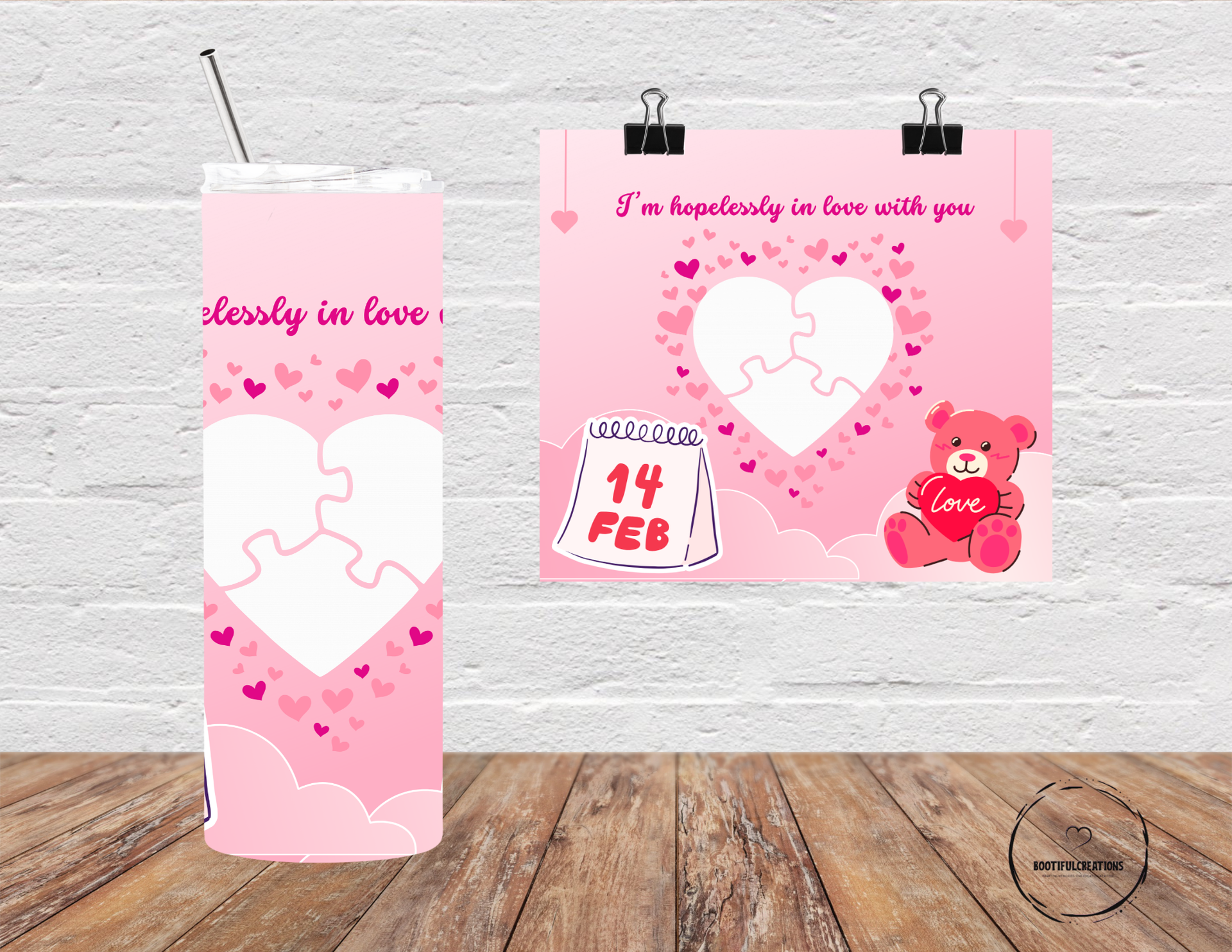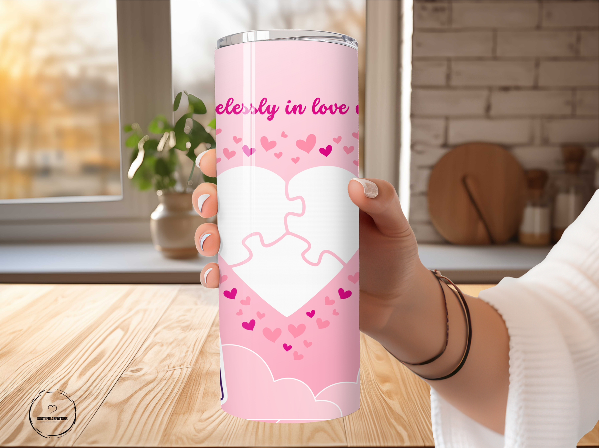 Experience true love with the Hopelessly in Love Valentine's Day Photo Tumbler. Adorned with small hearts and a pink gradient background, this tumbler features three interlocking puzzle pieces for personalized photos to symbolize your love and connection. Keep your drinks hot for up to 6 hours or cold for up to 24 hours. Personalize it with a name and show your special someone how much they mean to you.