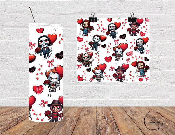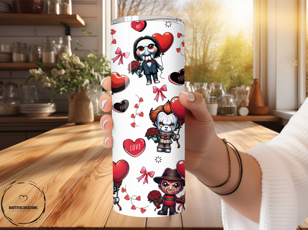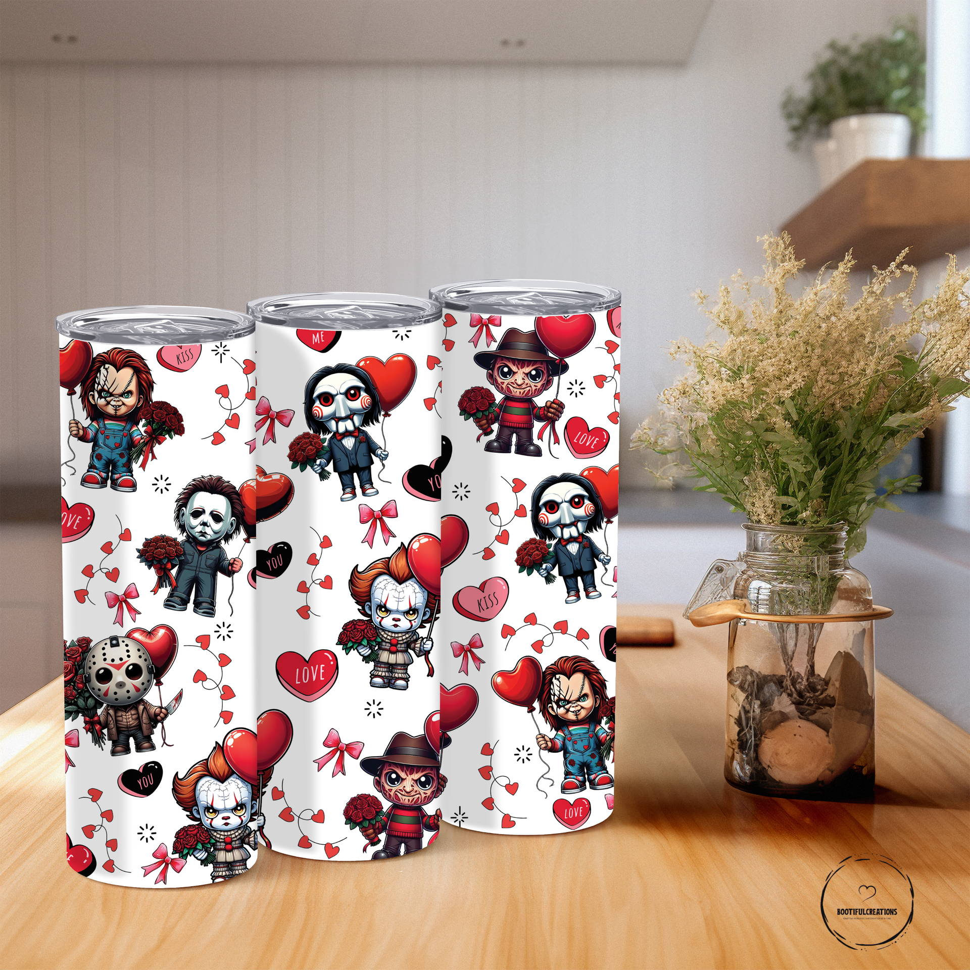 Indulge in your love for horror movies with this limited edition Valentine's Day tumbler featuring adorable chibi-style characters. Keep your drink hot for up to 6 hours or cold for up to 24 hours. Personalize it with a name for the ultimate horror movie fan gift!