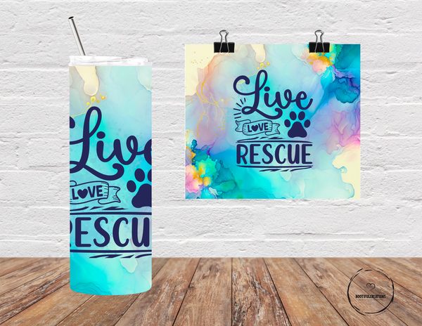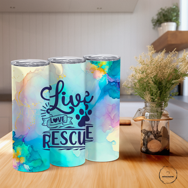 Stay hydrated with the Live Love Rescue Tumbler! Keep your drink hot for up to 6 hours or cold for up to 24 hours. Show your love for rescue animals with the unique "Live Love Rescue" design. Personalize it with a name for an extra special touch.