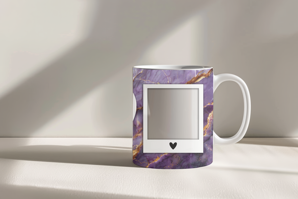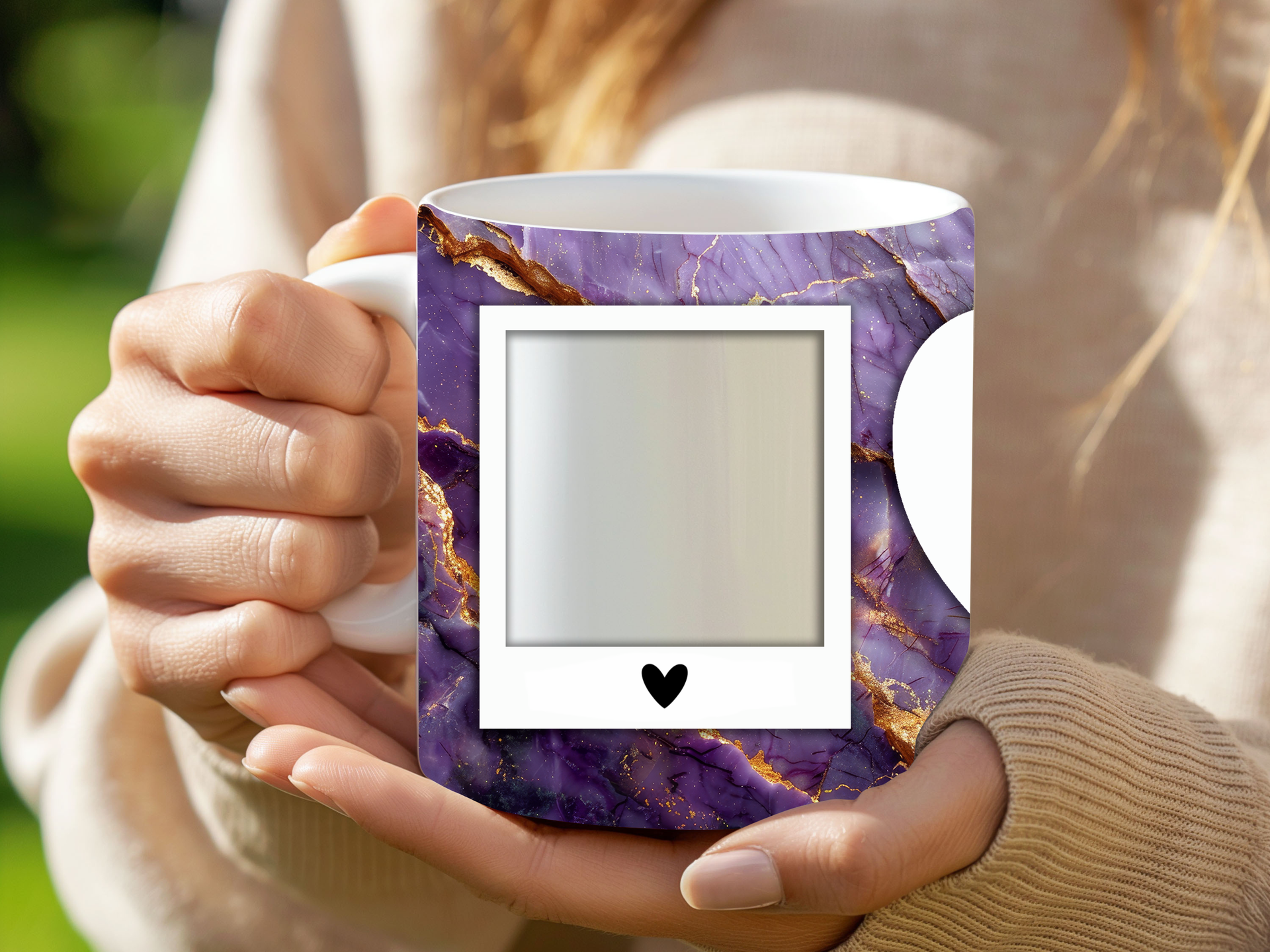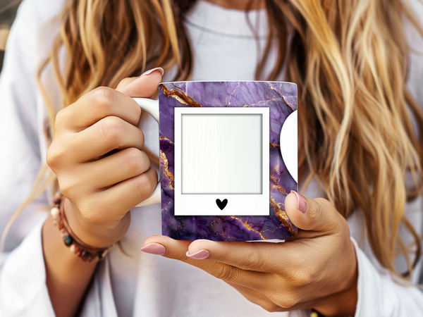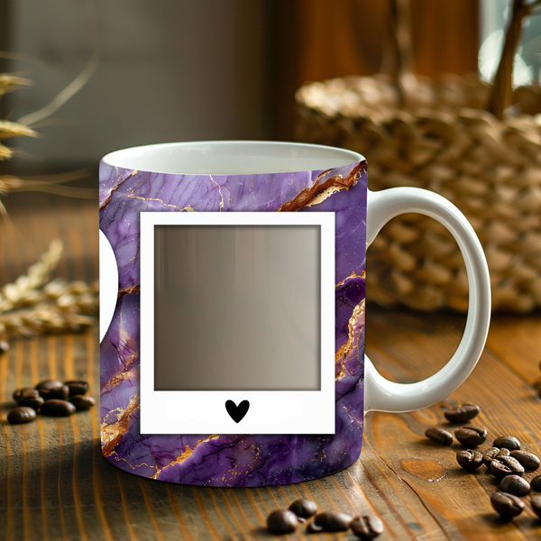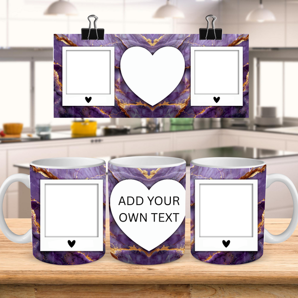Showcase your cherished memories and heartfelt messages with our stunning customizable Photo & Text Coffee Mug! This elegant mug features a rich purple marble design, beautifully swirled with captivating gold accents, creating a luxurious and artistic backdrop for your personalization. It's thoughtfully designed to display two of your beloved photos within classic polaroid-style frames, each subtly adorned with a charming heart detail. The central heart shape is perfect for adding your own custom text, making it truly unique. Perfect for your daily coffee, tea, or any hot beverage, this mug transforms into a unique personal keepsake or a thoughtful gift for family and friends on any special occasion. It's available in both a convenient 11oz size and a more generous 15oz capacity to suit your preference. Simply add your desired photos and text to create a truly personalized and heartwarming mug that will be treasured for years to come!