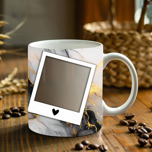Discover the perfect blend of modern design and personal sentiment with our Black & Gold Marble Photo Mug. This eye-catching mug boasts a dynamic marble pattern in striking black and gold, beautifully complemented by a radiant white and silver vertical panel. Two polaroid-style frames, each adorned with a subtle heart, invite you to add your favorite memories, while the central panel can be customized with a name for an extra personal touch. Whether you're enjoying your morning brew or looking for a memorable gift for a loved one, this durable ceramic mug is available in 11oz and 15oz capacities to suit every need.