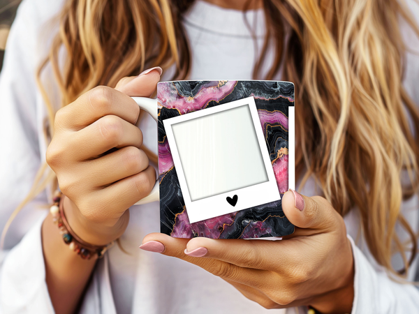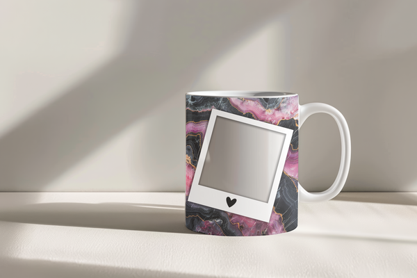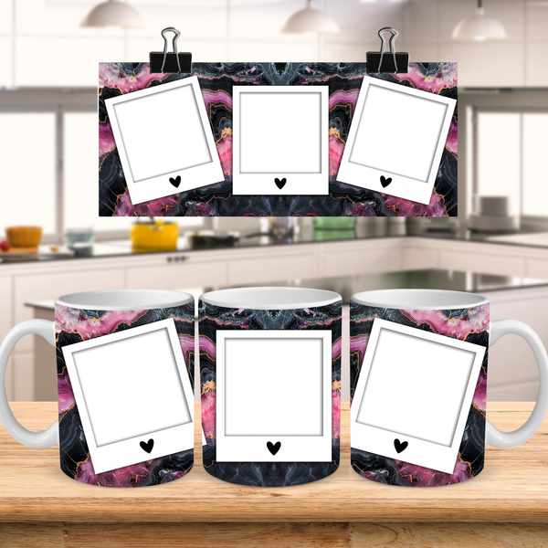 Showcase your cherished memories with our stunning customizable Photo Frame Coffee Mug! This elegant mug features a striking abstract design of black and gold marble, beautifully accented with vibrant pink swirls, creating a sophisticated and artistic backdrop for your favorite moments. Each mug is thoughtfully designed to display three of your beloved photos within classic polaroid-style frames, each subtly adorned with a charming heart detail. Perfect for your daily coffee, tea, or any hot beverage, this mug transforms into a unique personal keepsake or a thoughtful gift for family and friends on any special occasion. It's available in both a convenient 11oz size and a more generous 15oz capacity to suit your preference. Simply add your desired photos to create a truly personalized and heartwarming mug that will be treasured for years to come!