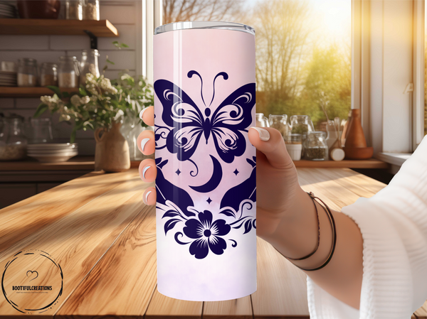 Embrace the enchanting beauty of the Mystical Butterfly and Floral Design Tumbler! Adorned with a captivating butterfly crescent moon and delicate florals in dark blue over a soft pink backdrop, this tumbler keeps drinks hot for up to 6 hours and cold for up to 24 hours. Personalize with a name for a magical touch. Order now and elevate your beverage experience!
