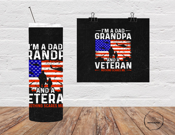 Stay fearless with the Nothing Scares Me Tumbler. Show off your titles as Dad, Grandpa, and Veteran with pride. Keep your drinks hot for up to 6 hours, and cold for up to 24 hours. Personalize it with your name for a truly unique touch. Conquer your day with confidence!
