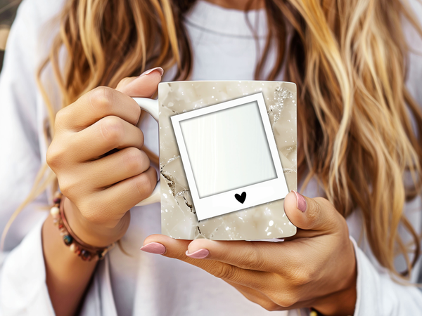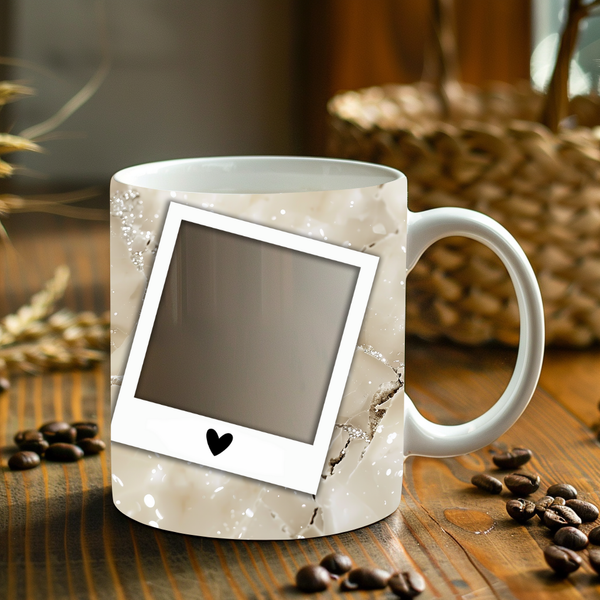 Showcase your cherished memories and a special name with our stunning customizable Photo & Name Coffee Mug! This elegant mug features a shimmering white background, subtly enhanced with hints of gold and a luminous sparkle, creating a radiant and artistic backdrop for your personalization. It's thoughtfully designed to display two of your beloved photos within classic polaroid-style frames, each subtly adorned with a charming heart detail. The central design features a prominent vertical space for adding a custom name, making it truly unique and personal. Perfect for your daily coffee, tea, or any hot beverage, this mug transforms into a unique personal keepsake or a thoughtful gift for family and friends on any special occasion. It's available in both a convenient 11oz size and a more generous 15oz capacity to suit your preference. Simply add your desired photos and name to create a truly personalized and heartwarming mug that will be treasured for years to come!