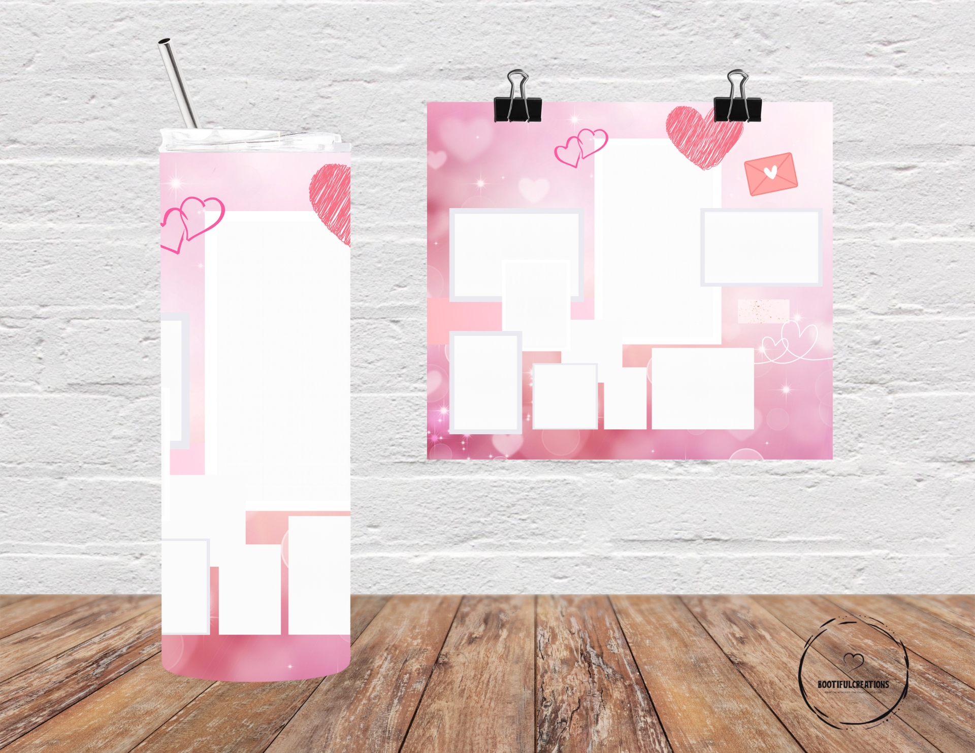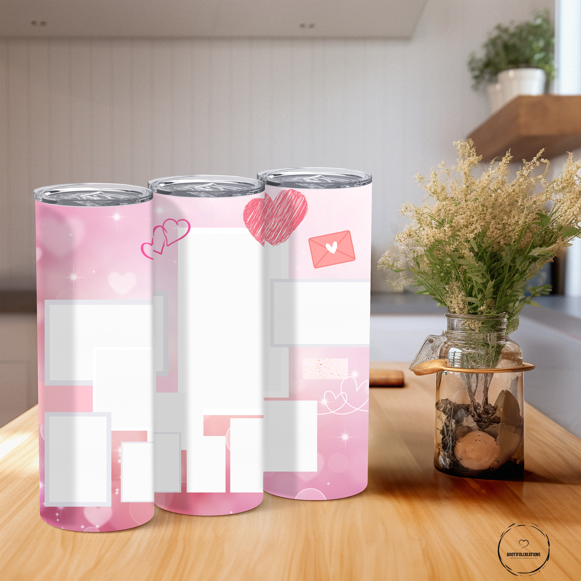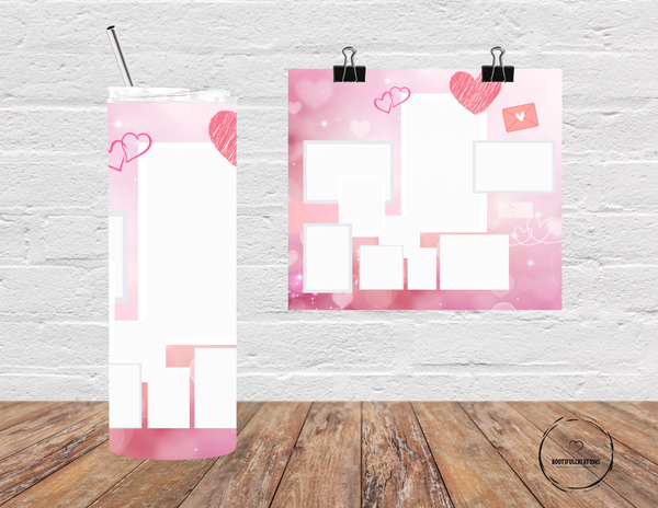 This elegant tumbler features a soft gradient of pink hues, creating a dreamy and affectionate ambiance. The design includes multiple blank spaces for personal photos and can be personalized with a name. Enjoy your favorite beverage hot for up to 6 hours or cold for up to 24 hours!