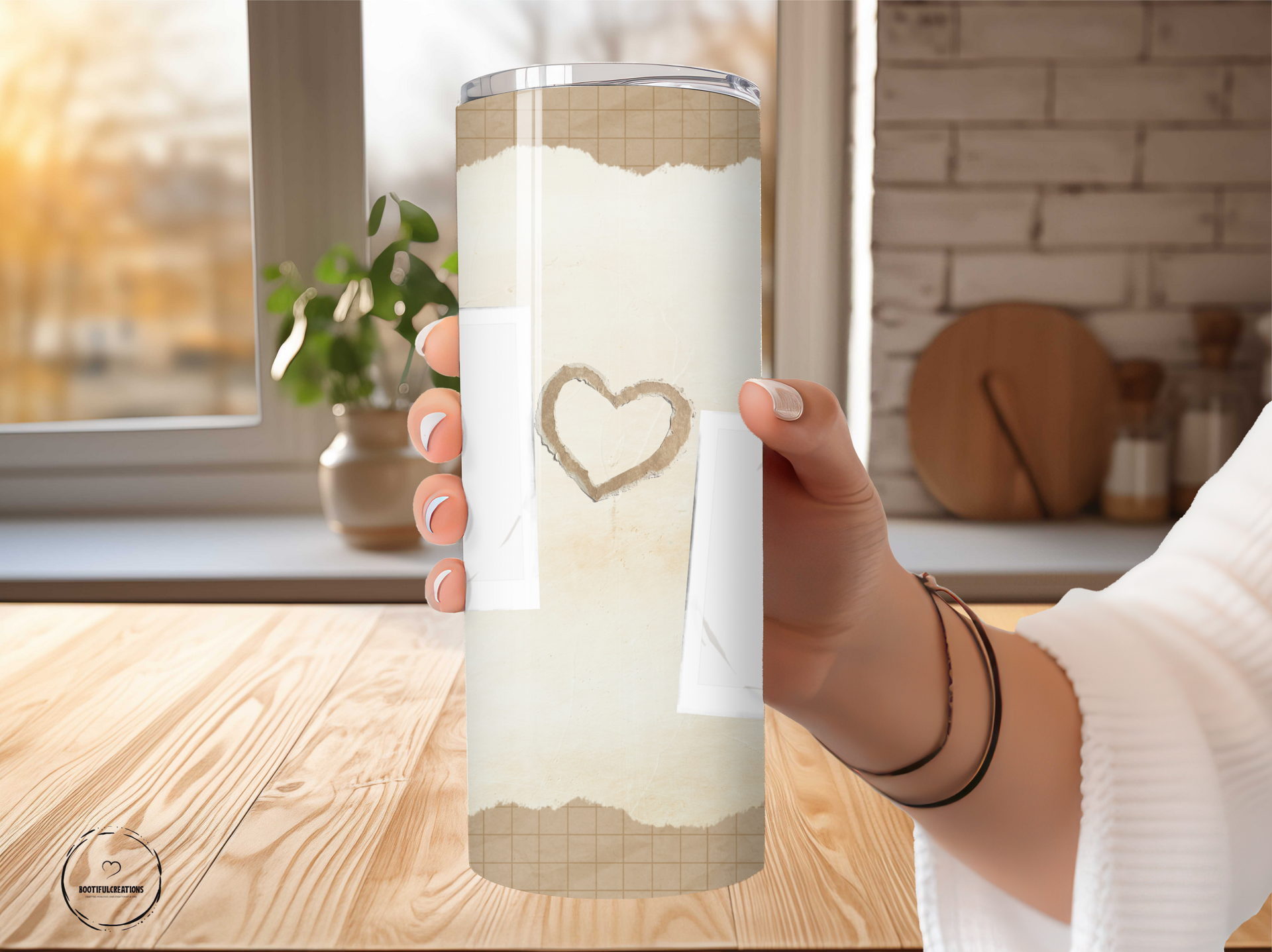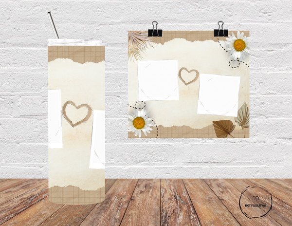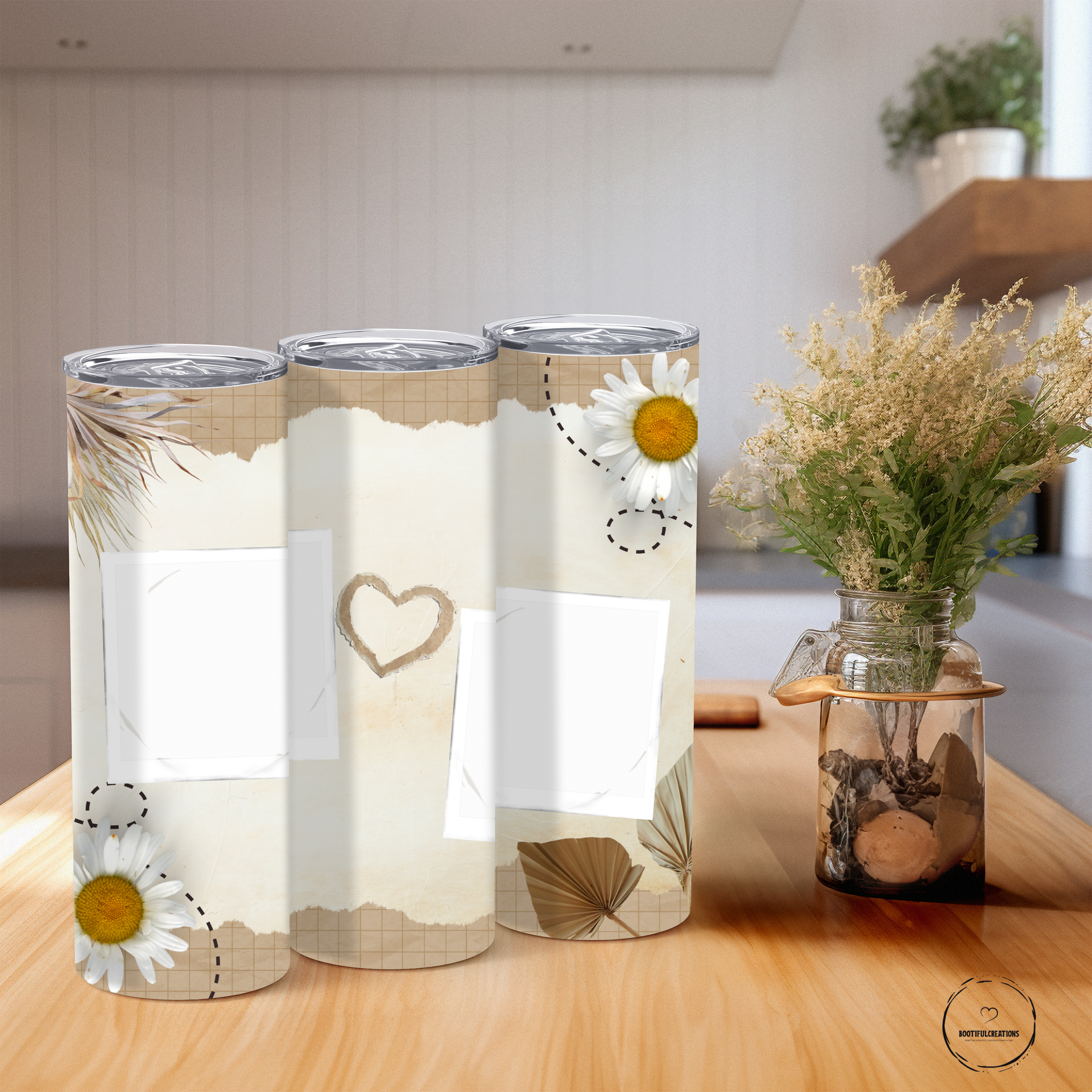 Capture beautiful moments with our Rustic Heart and Daisy Photo Tumbler. The beige background and torn-paper effect create a vintage look. Personalize with your own pictures in two photo frames. Stay warm for up to 6 hours and refreshed for 24 hours with this tumbler. Add a touch of nature and warmth to your daily routine. Can be personalized with a name.