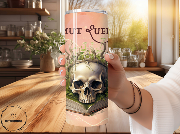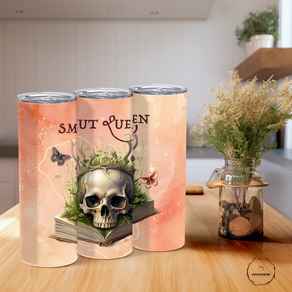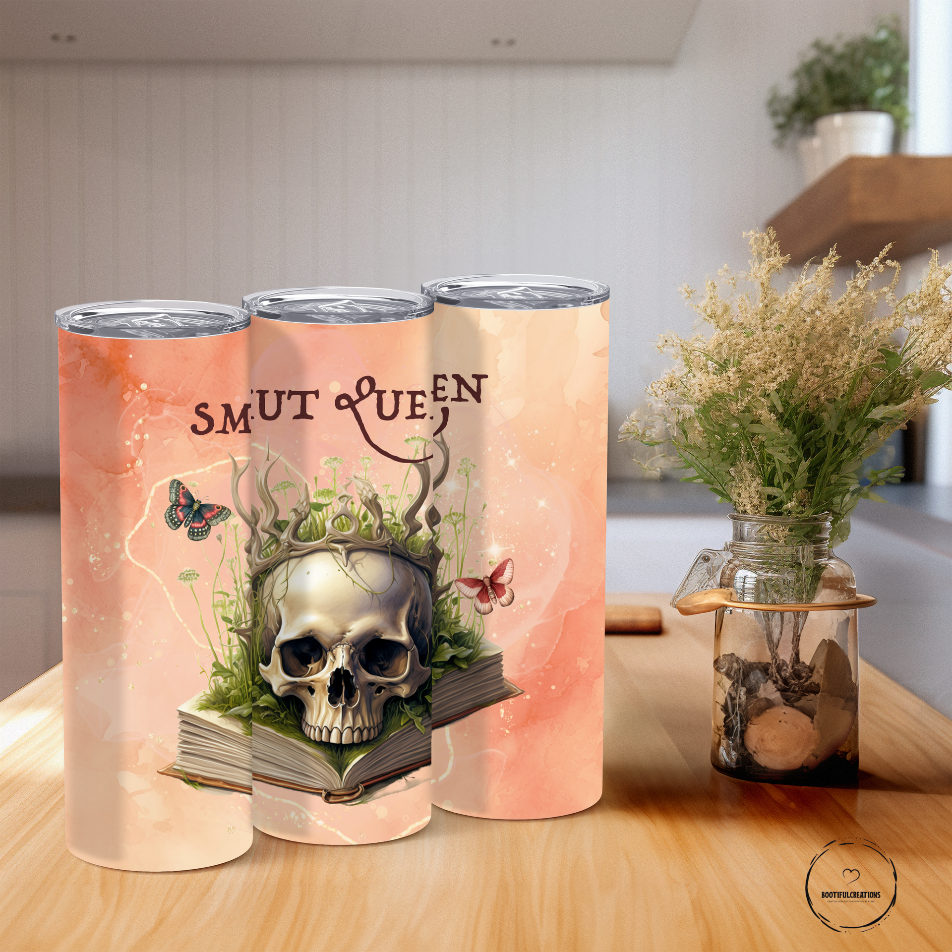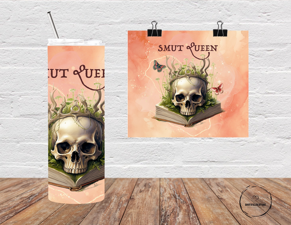 Indulge in your love for literature with the Smut Queen Tumbler! This sleek tumbler features a skull adorned with lush grass emerging from an open book, with the words "Smut Queen" proudly displayed. Keep your drinks hot for up to 6 hours or cold for 24 hours, and personalize it with your name. Perfect for the book lover in your life!