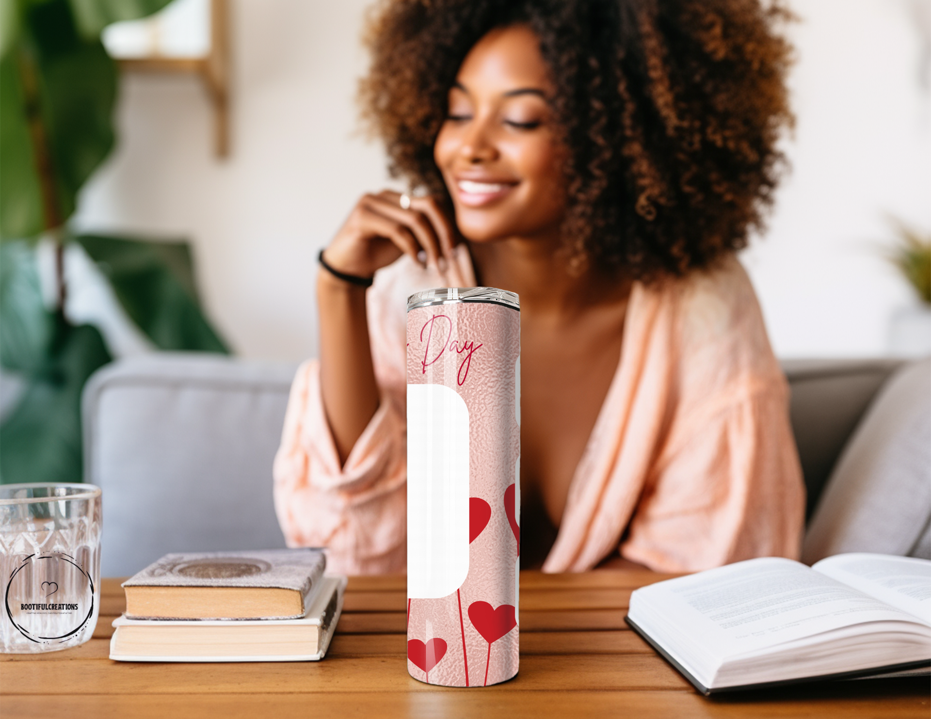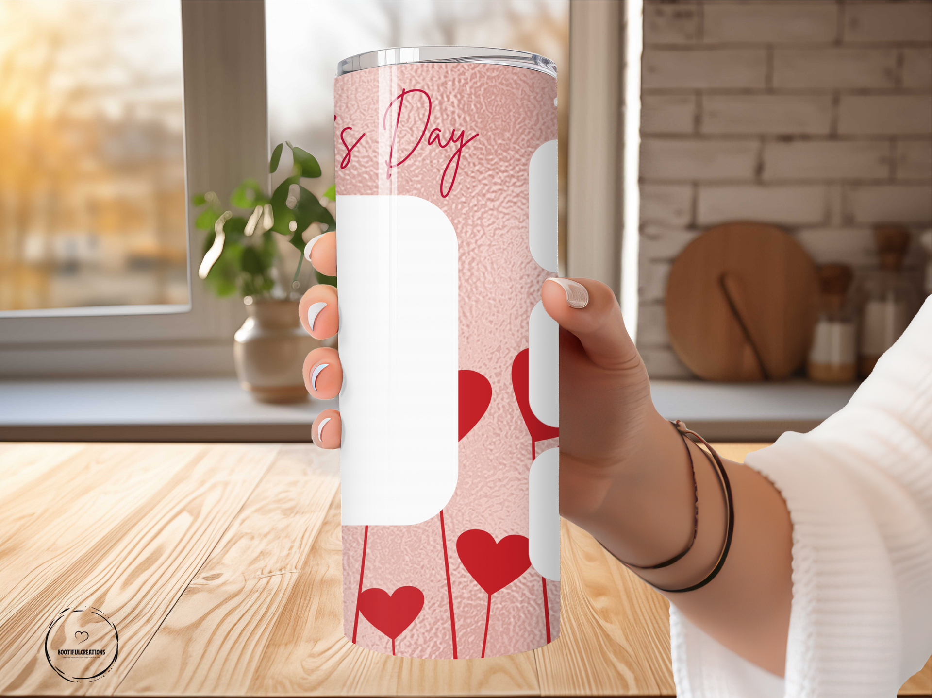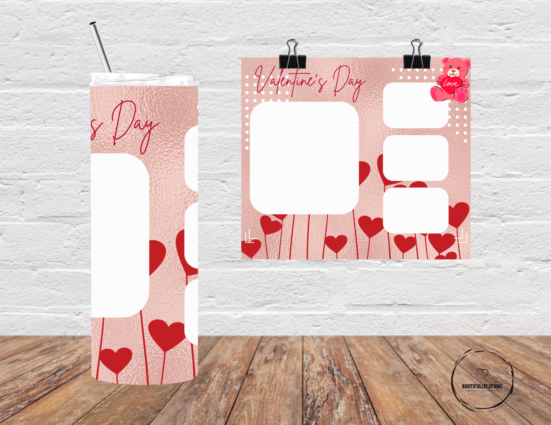 Celebrate love with our Valentine's Day Heart Balloon Photo Tumbler! The pink textured background and red heart-shaped balloons add a touch of romance. Keep beverages hot for 6 hours and cold for 24 hours. Personalize with a name and showcase your special moments in the four photo spaces.