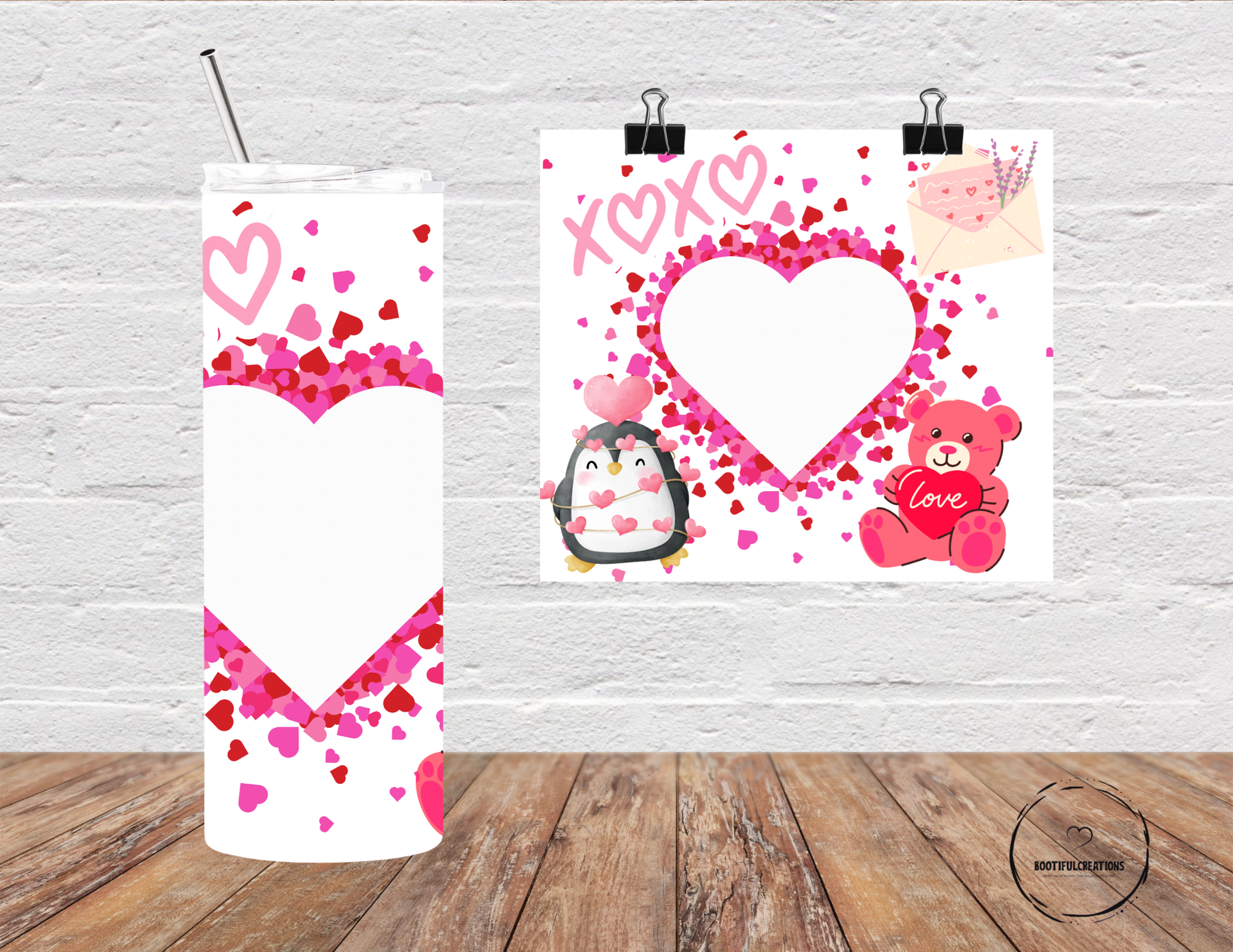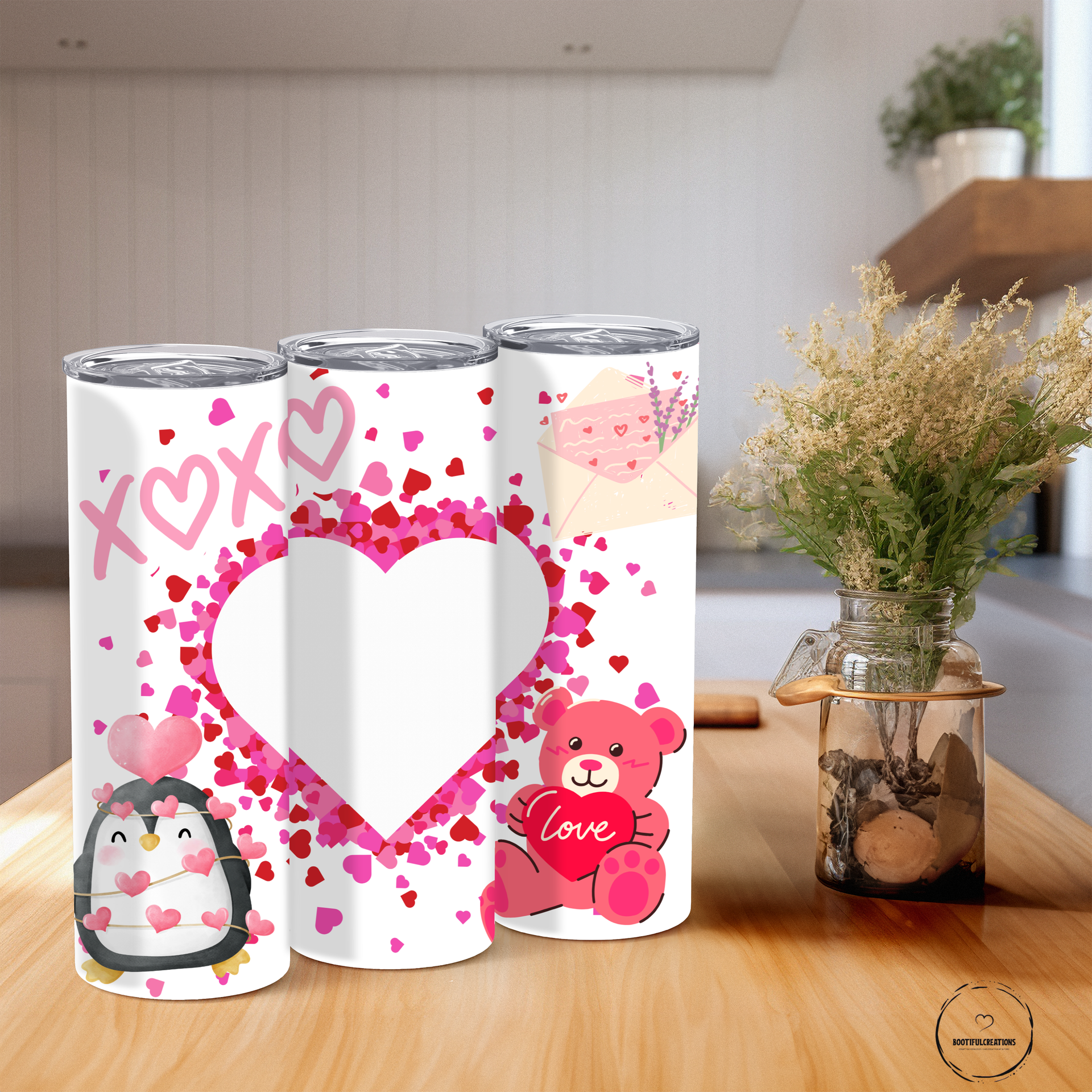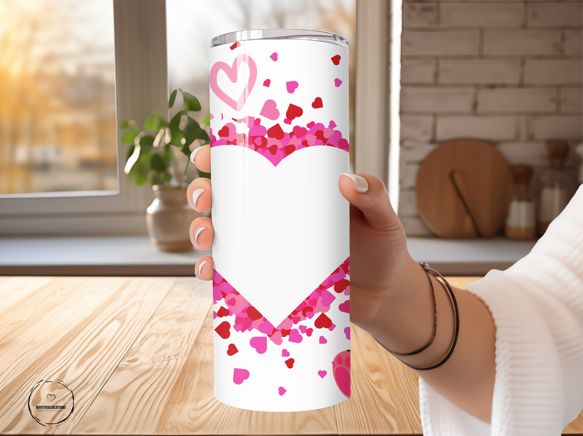 Fall in love with our Valentine's Day Love Heart Photo Tumbler! Show off your special someone with the large white heart in the center, surrounded by pink and red heart confetti. Keep your drink hot for up to 6 hours or cold for up to 24 hours. Personalize it with a name for an extra touch of love!