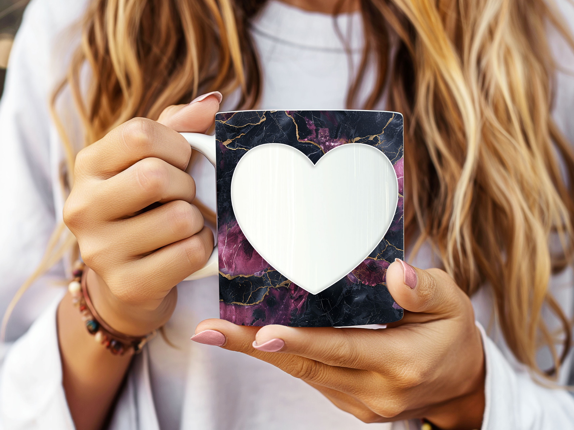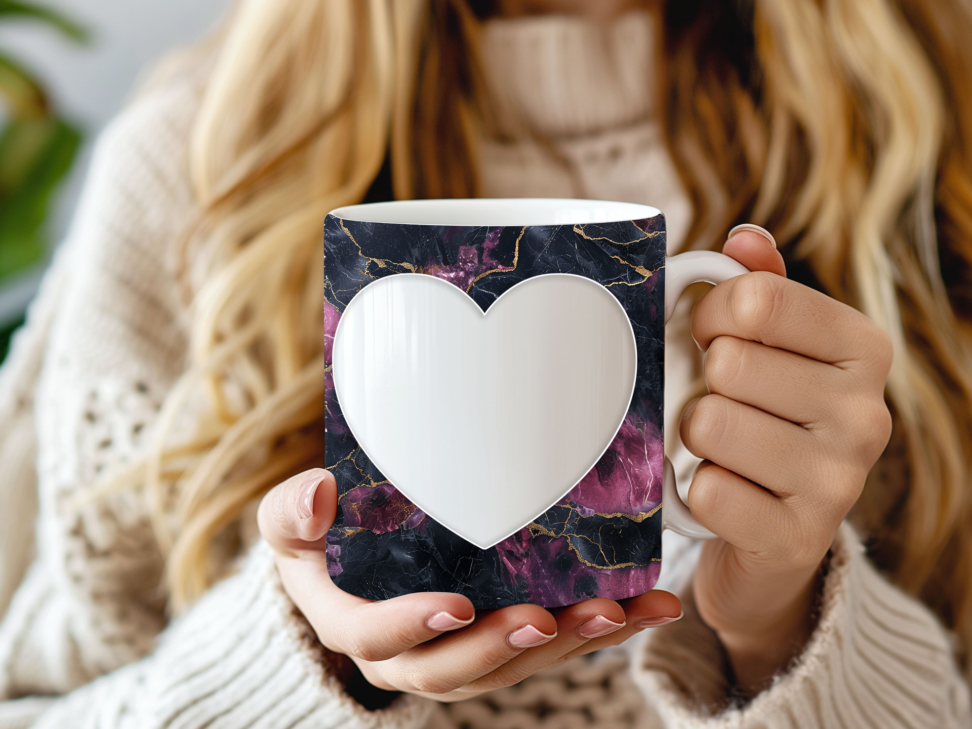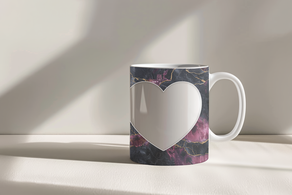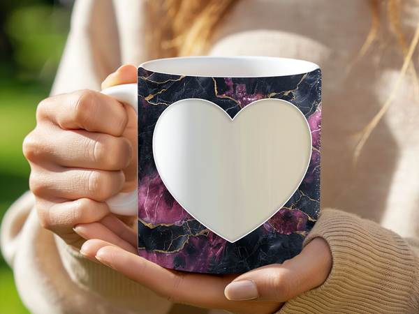 Showcase your cherished memories and heartfelt messages with our stunning customizable Photo & Text Coffee Mug! This elegant mug features a striking dark background with vibrant purple and pink marble patterns, beautifully accented with shimmering gold, creating a captivating and artistic backdrop for your personalization. It's thoughtfully designed to display two of your beloved photos within classic polaroid-style frames, each subtly adorned with a charming heart detail. The central heart shape is perfect for adding your own custom text, making it truly unique. Perfect for your daily coffee, tea, or any hot beverage, this mug transforms into a unique personal keepsake or a thoughtful gift for family and friends on any special occasion. It's available in both a convenient 11oz size and a more generous 15oz capacity to suit your preference. Simply add your desired photos and text to create a truly personalized and heartwarming mug that will be treasured for years to come!