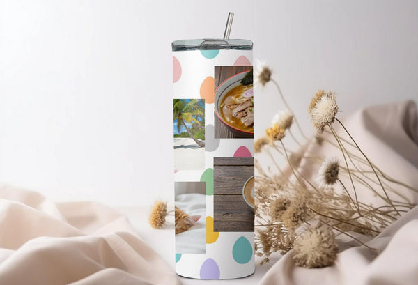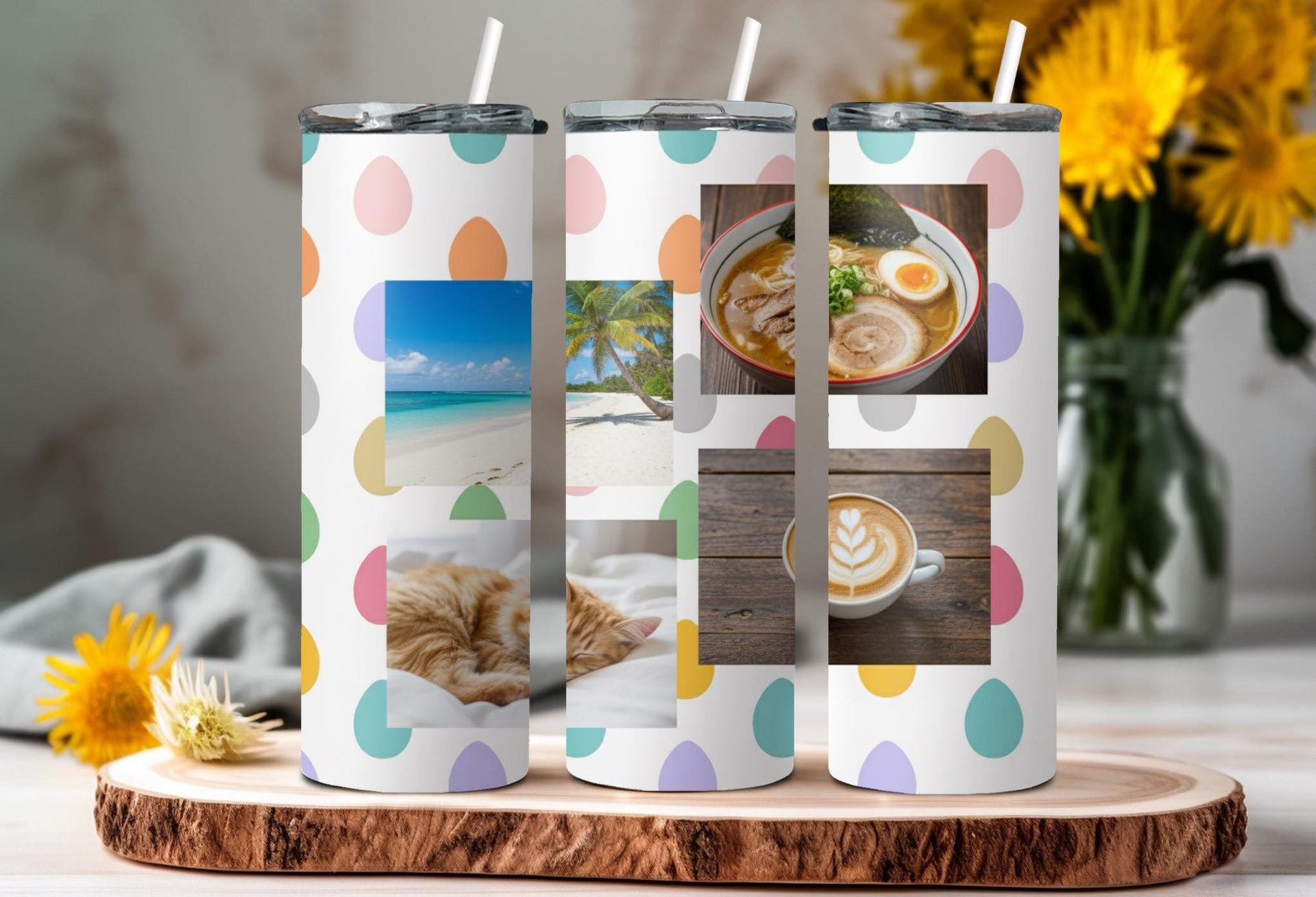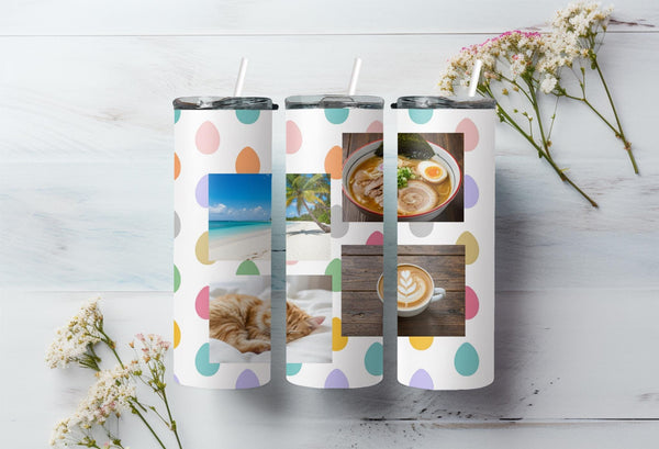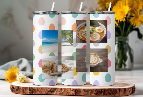 Celebrate the spring season with our vibrant and playful polka dot pattern tumbler! Perfect for all your hot or cold drinks, this tumbler keeps beverages at the perfect temperature for up to 6 hours hot and 24 hours cold. Customize with a name and showcase your favorite memories with 4 white spaces for photos.