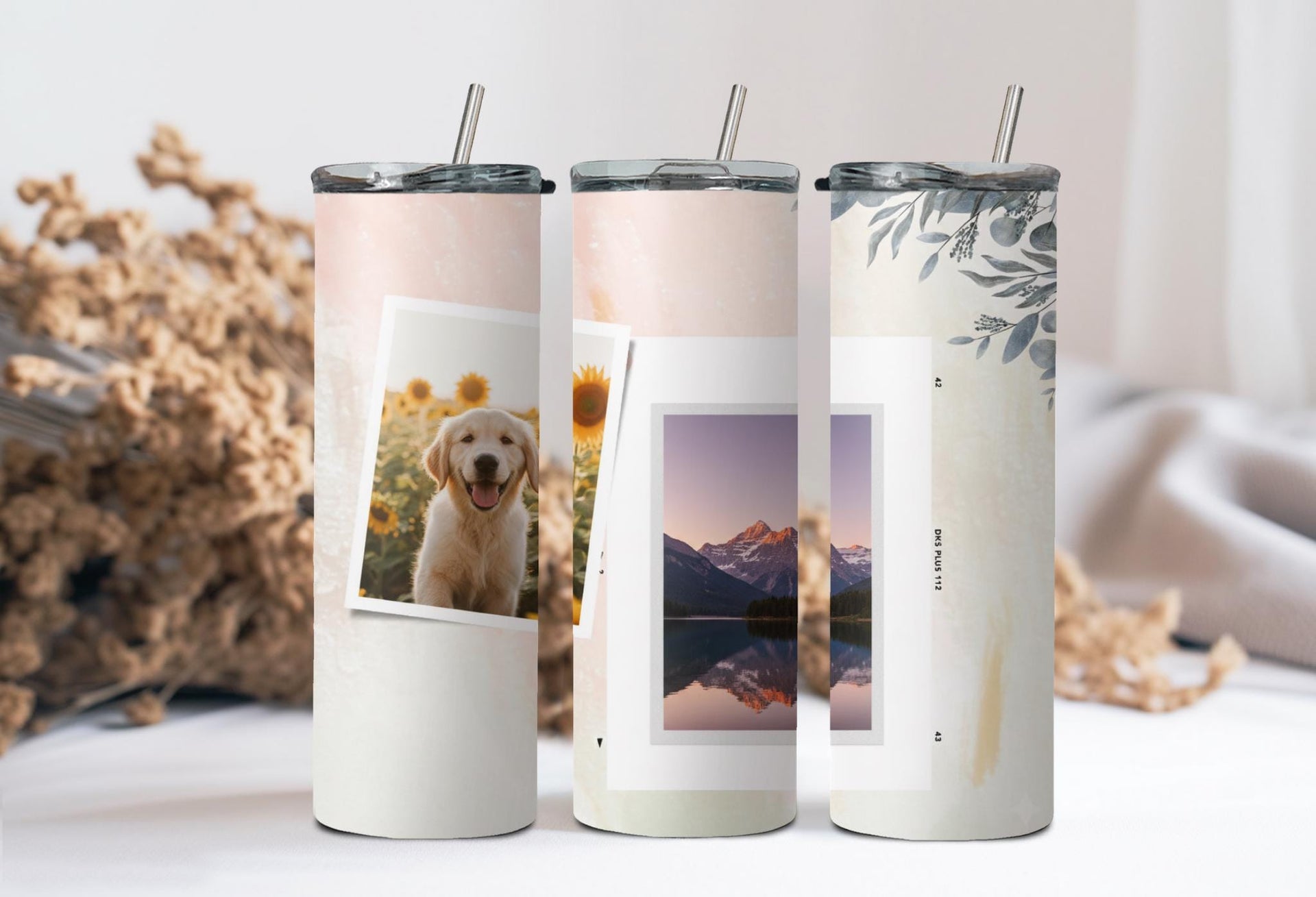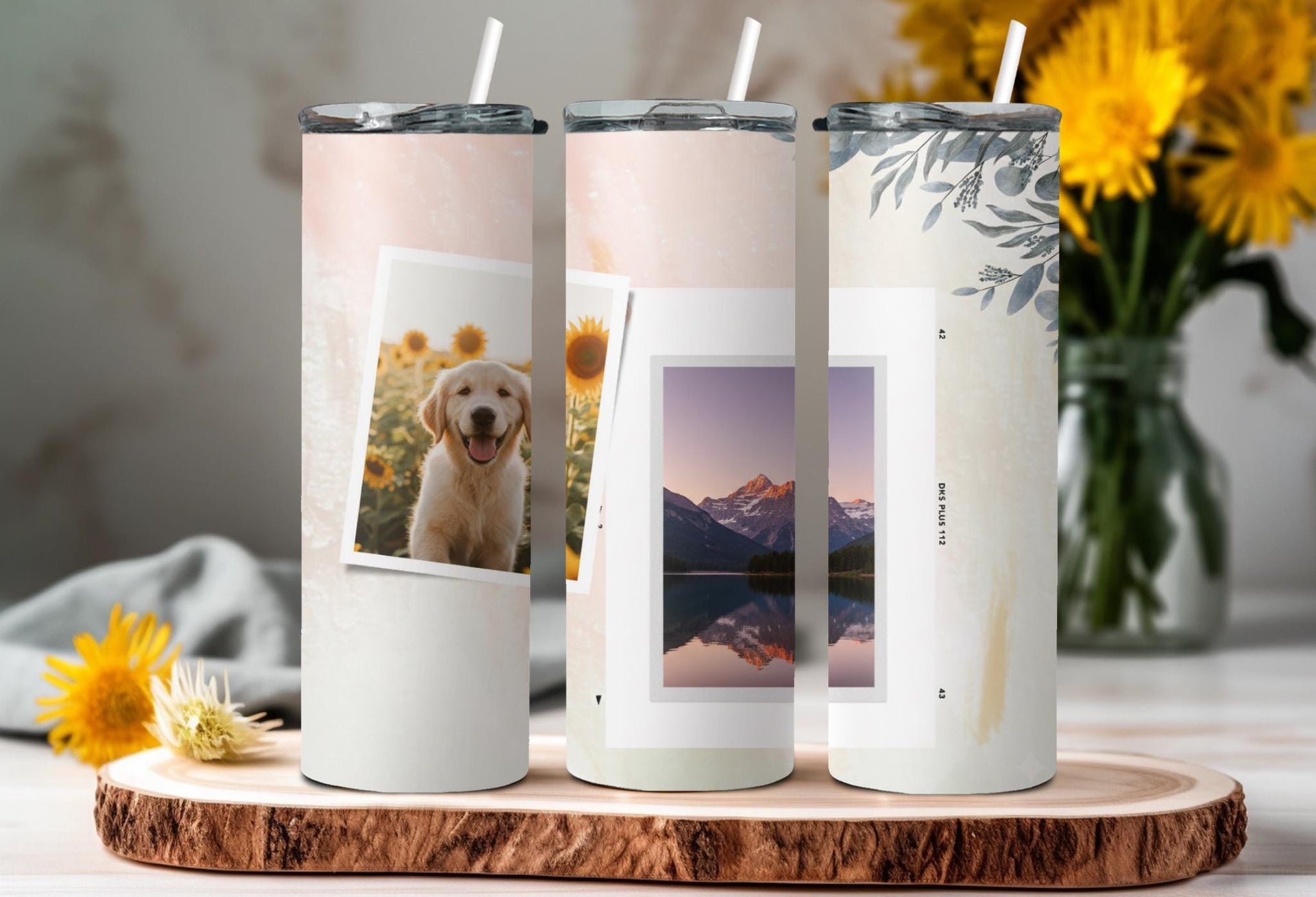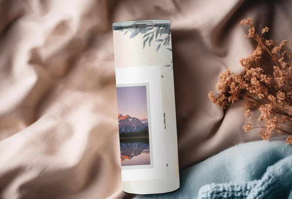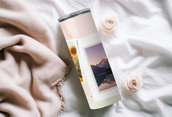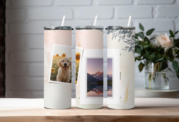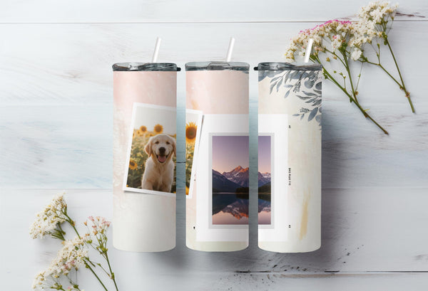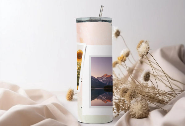 Experience the beauty of the Elegant Pastel Photo Tumbler. The pink and white gradient design with delicate floral elements adds a touch of sophistication. Keep your drink hot for up to 6 hours or cold for up to 24 hours. Personalize with a name and showcase 2 special photos. Indulge in a truly unique and practical product.