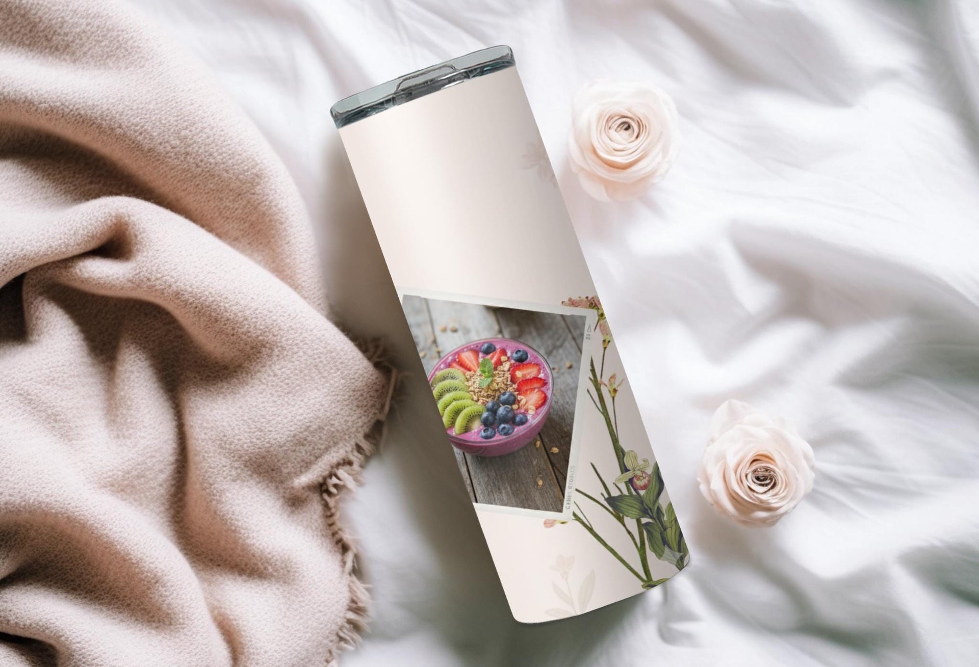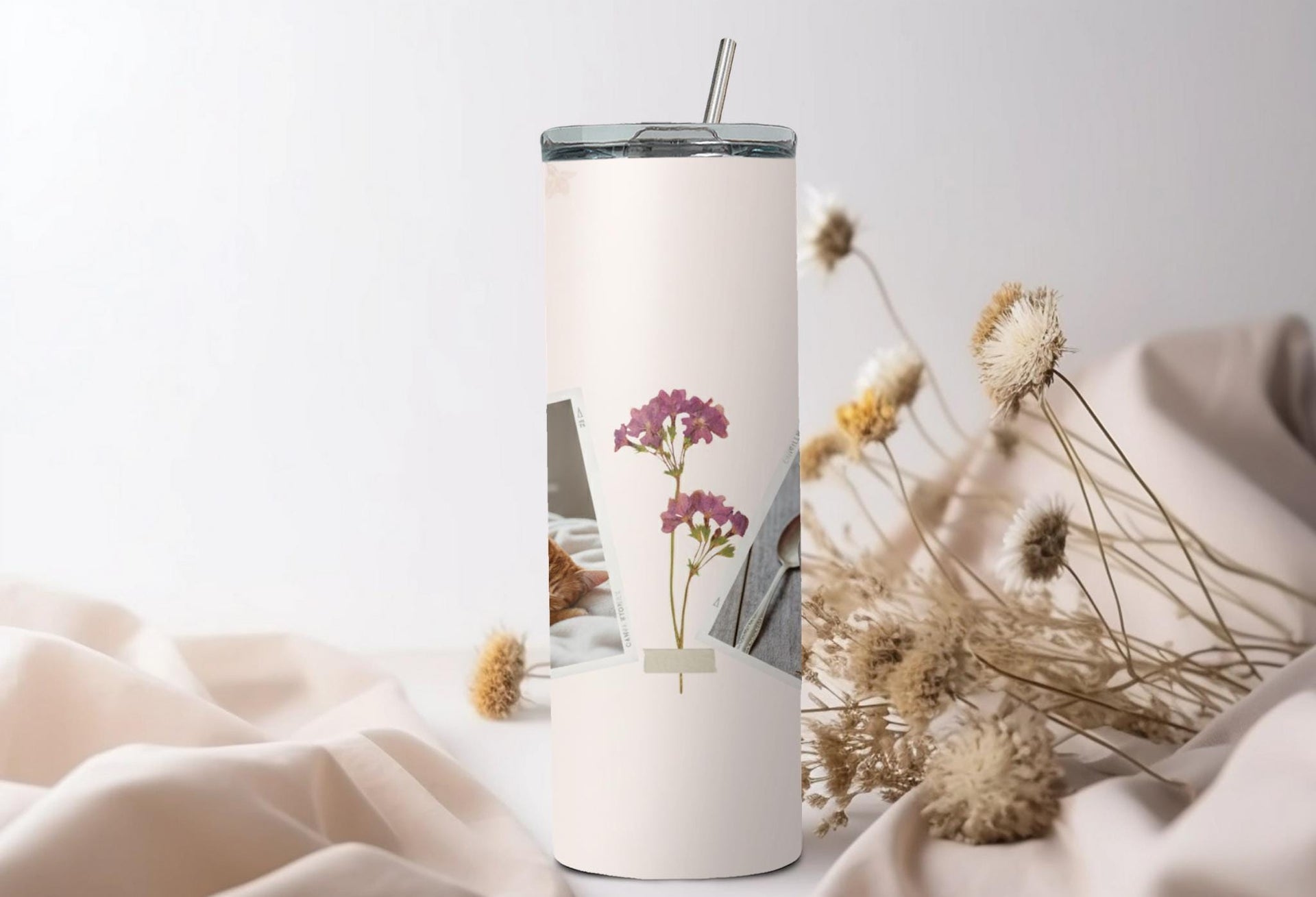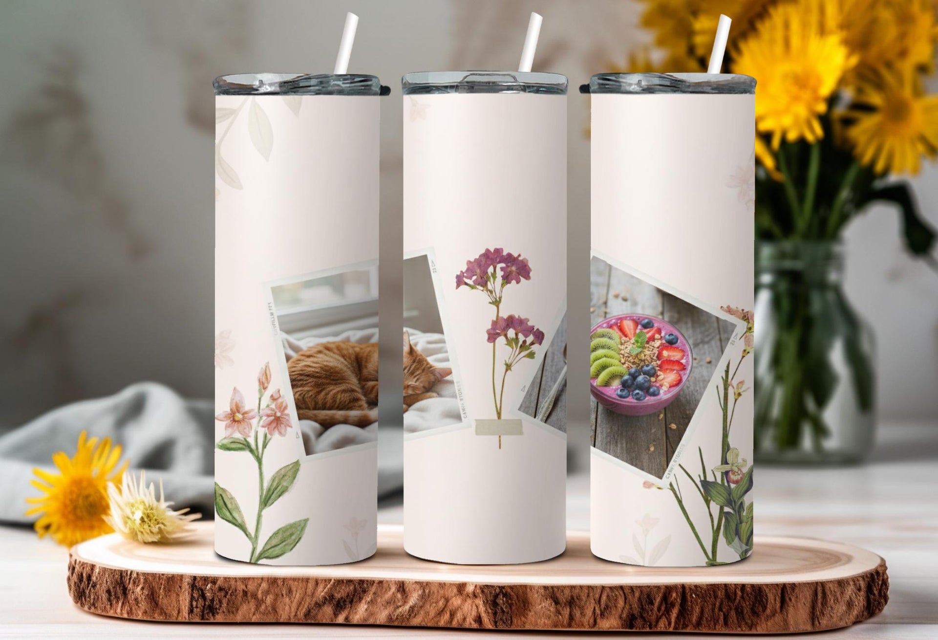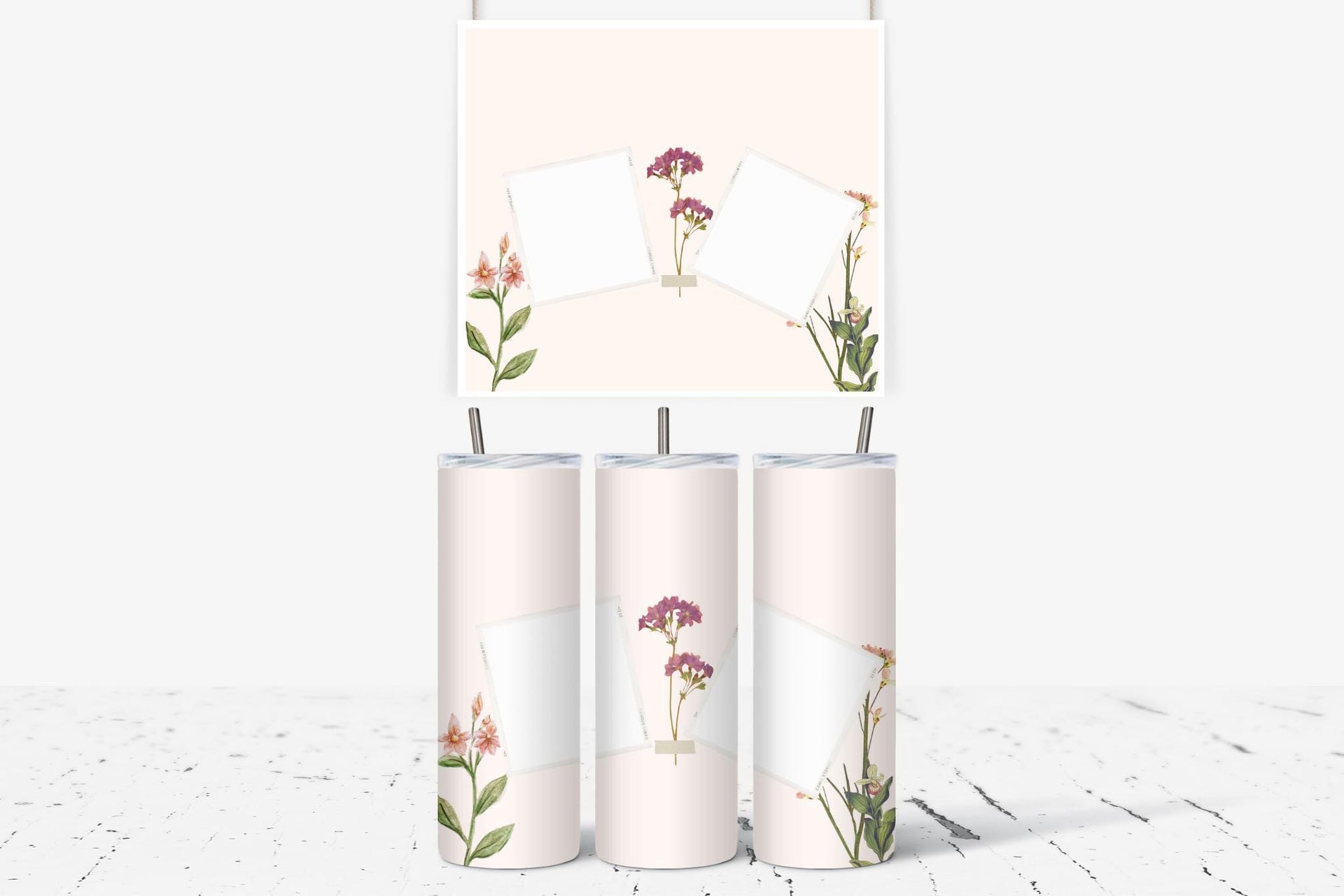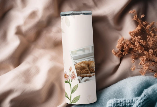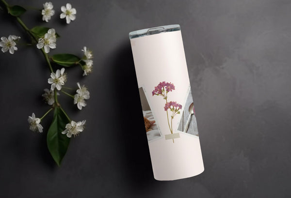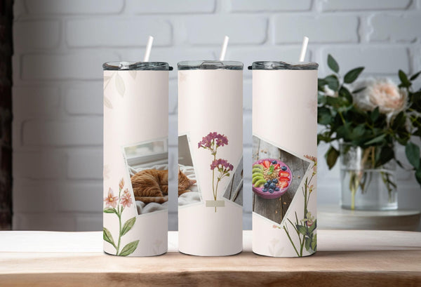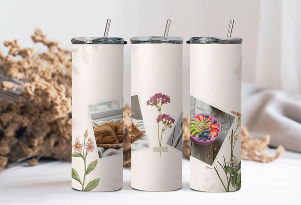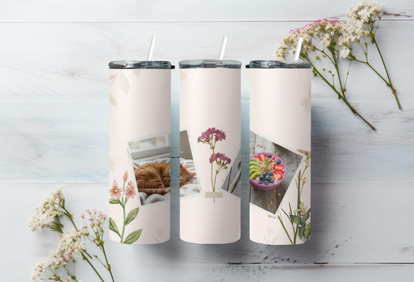 Elevate your daily routine with our elegant floral photo tumbler. This sleek and minimalist design features delicate floral illustrations and two white frames for your favorite photos. Keep your drinks hot for up to 6 hours or cold for up to 24 hours. Personalize with a name for a truly unique touch.