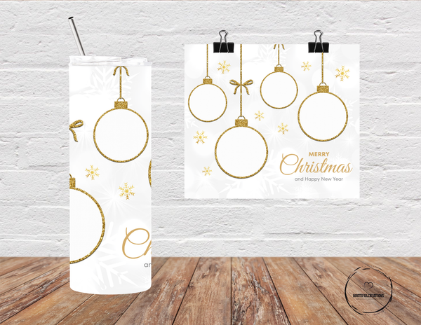 The Elegant Christmas Ornament Photo Tumbler is a festive addition to any holiday celebration. Its sleek white background is adorned with golden Christmas ornaments and delicate snowflakes, creating an elegant and cheerful design. With 4 white circles for personalized photos, and up to 6 hours of hot or 24 hours of cold insulation, it's the perfect gift for anyone on your list. Customize it with a name for an extra special touch.
