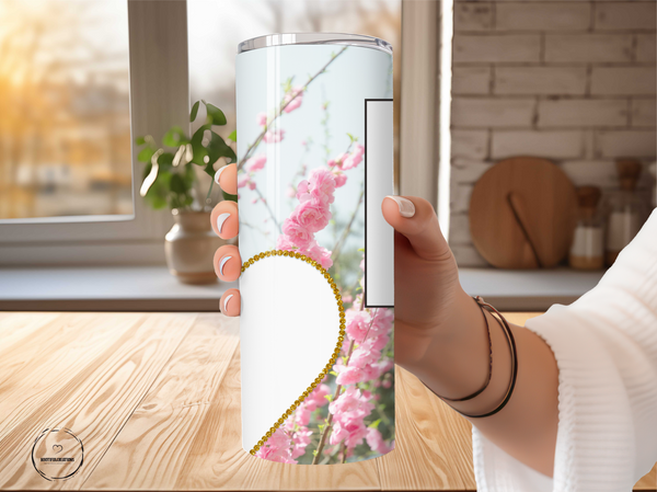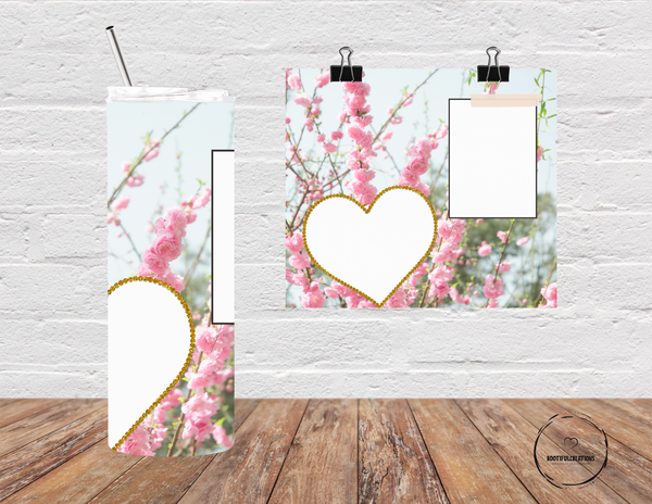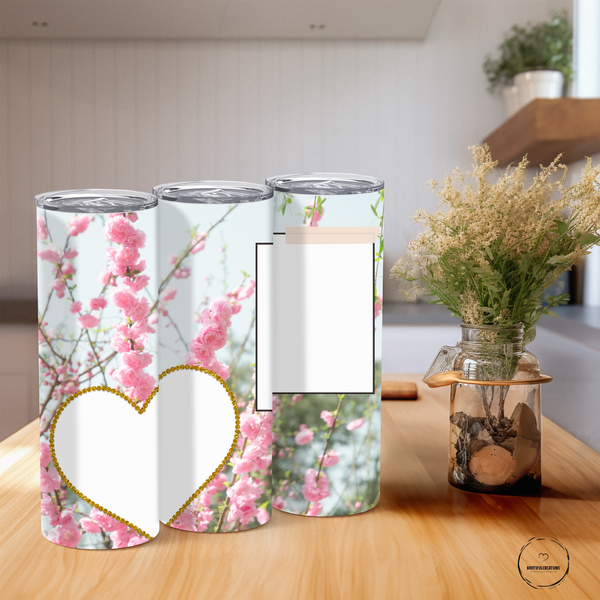 Capture precious moments and keep your drink at the perfect temperature with our Floral Heart Photo Tumbler. Adorned with delicate pink blossoms and a light blue sky, this tumbler features 2 photo spaces and keeps drinks hot for 6 hours and cold for 24. Personalize with a name for a truly unique touch.