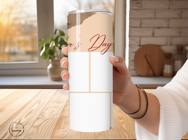 This customizable tumbler is adorned with a beautiful beige and brown color scheme, making it the perfect gift for Mother's Day. The elegant red cursive text adds a touch of sophistication. Keep drinks hot for up to 6 hours or cold for up to 24 hours. Personalize it with a name and showcase up to 5 photos.