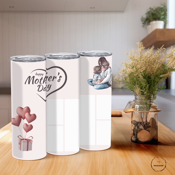 Show your mom how much she means to you with our Happy Mother's Day Photo Tumbler! This beautifully designed tumbler features a heartwarming "Happy Mother's Day" message, along with space for 5 photos, on a soft pink background. Keep drinks hot for 6 hours or cold for 24 hours and personalize it with her name. A perfect gift for the most important woman in your life!