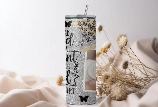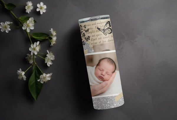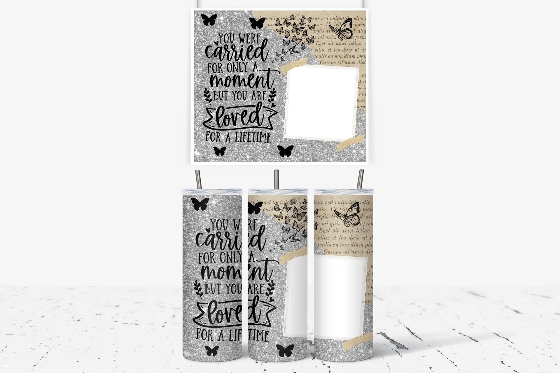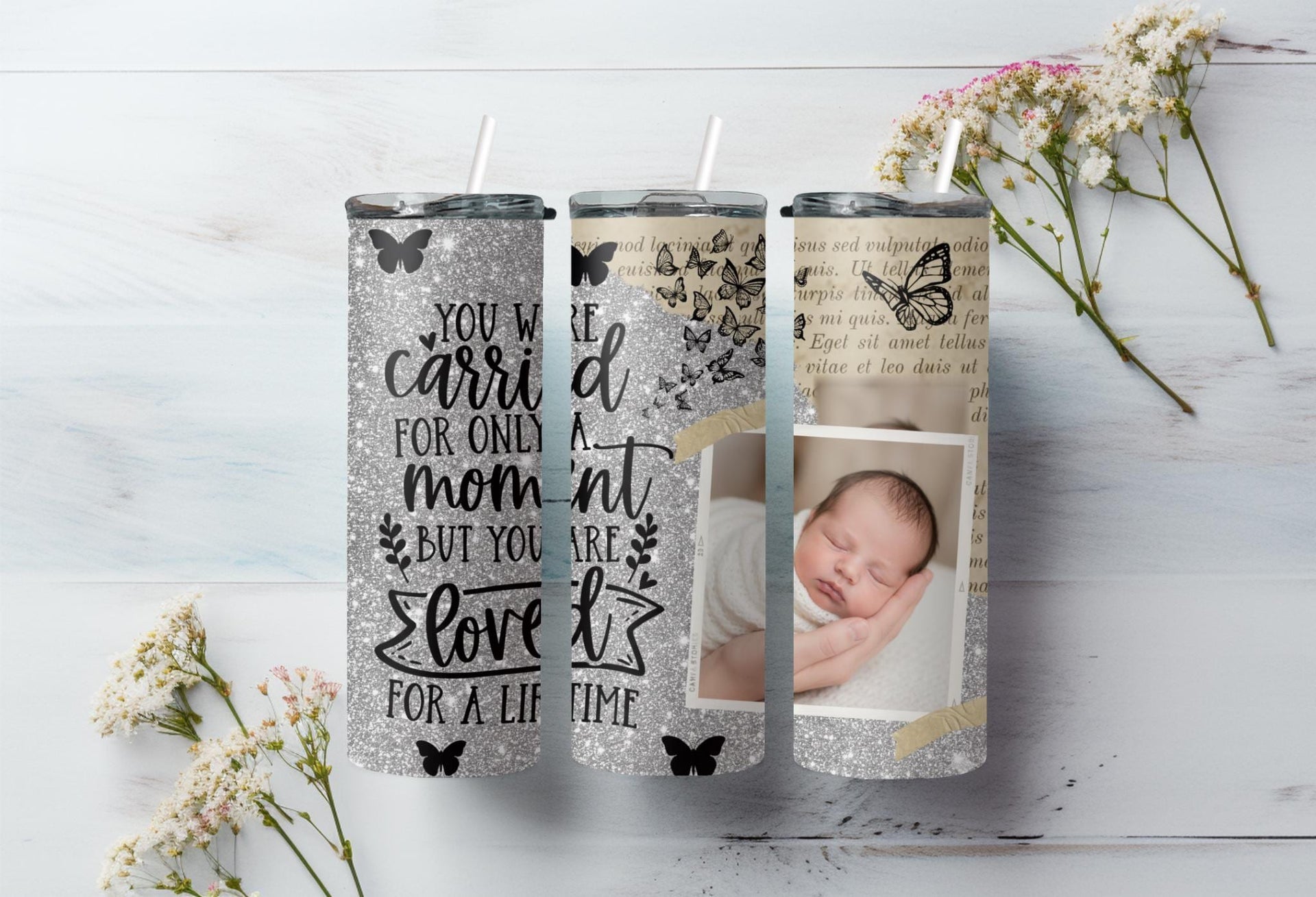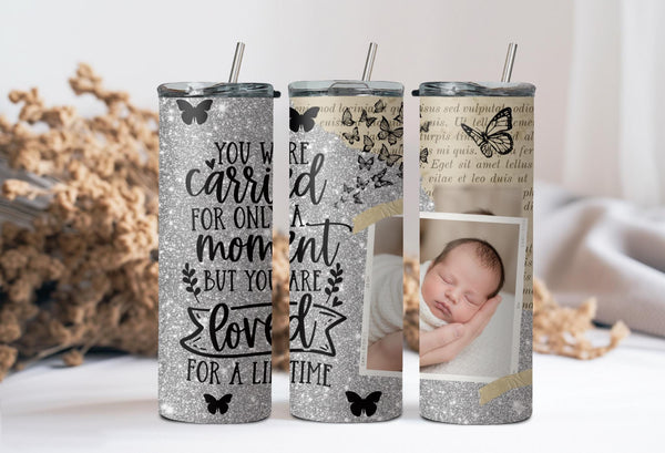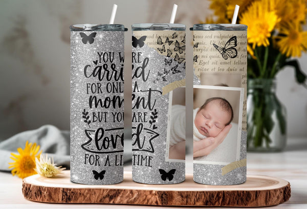 Capture and cherish your precious memories with our Carried for a Moment, Loved for a Lifetime Photo Tumbler. The heartfelt design features the phrase "You were carried for only a moment but you are loved for a lifetime" adorned with glittery silver and vintage text, butterflies, and floral accents. Keep your drinks hot for up to 6 hours or cold for up to 24 hours. Personalize it with your name for a truly special touch.