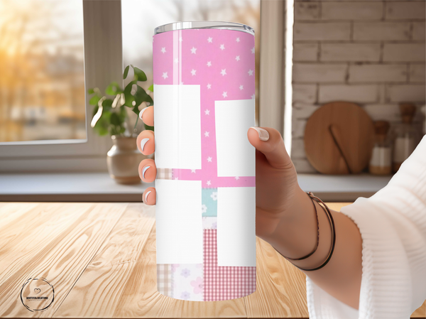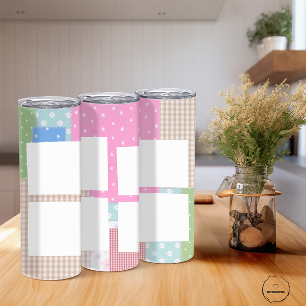 Treat yourself to the perfect blend of practicality and charm with our Patchwork Pattern Photo Tumbler. Adorned with a beautiful patchwork pattern of pastel colors and designs, including stars, polka dots, and gingham checks, this tumbler also features 4 white spaces for your favorite photos. Keep your drinks at the perfect temperature for up to 6 hours hot and 24 hours cold. Personalize it with a name for the perfect gift!