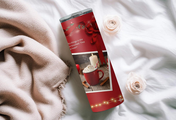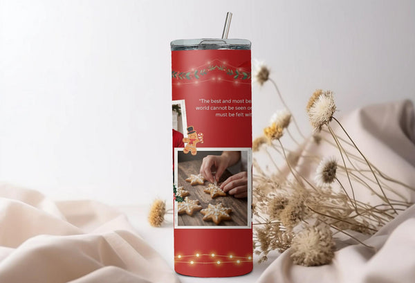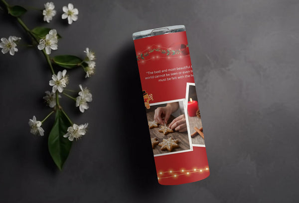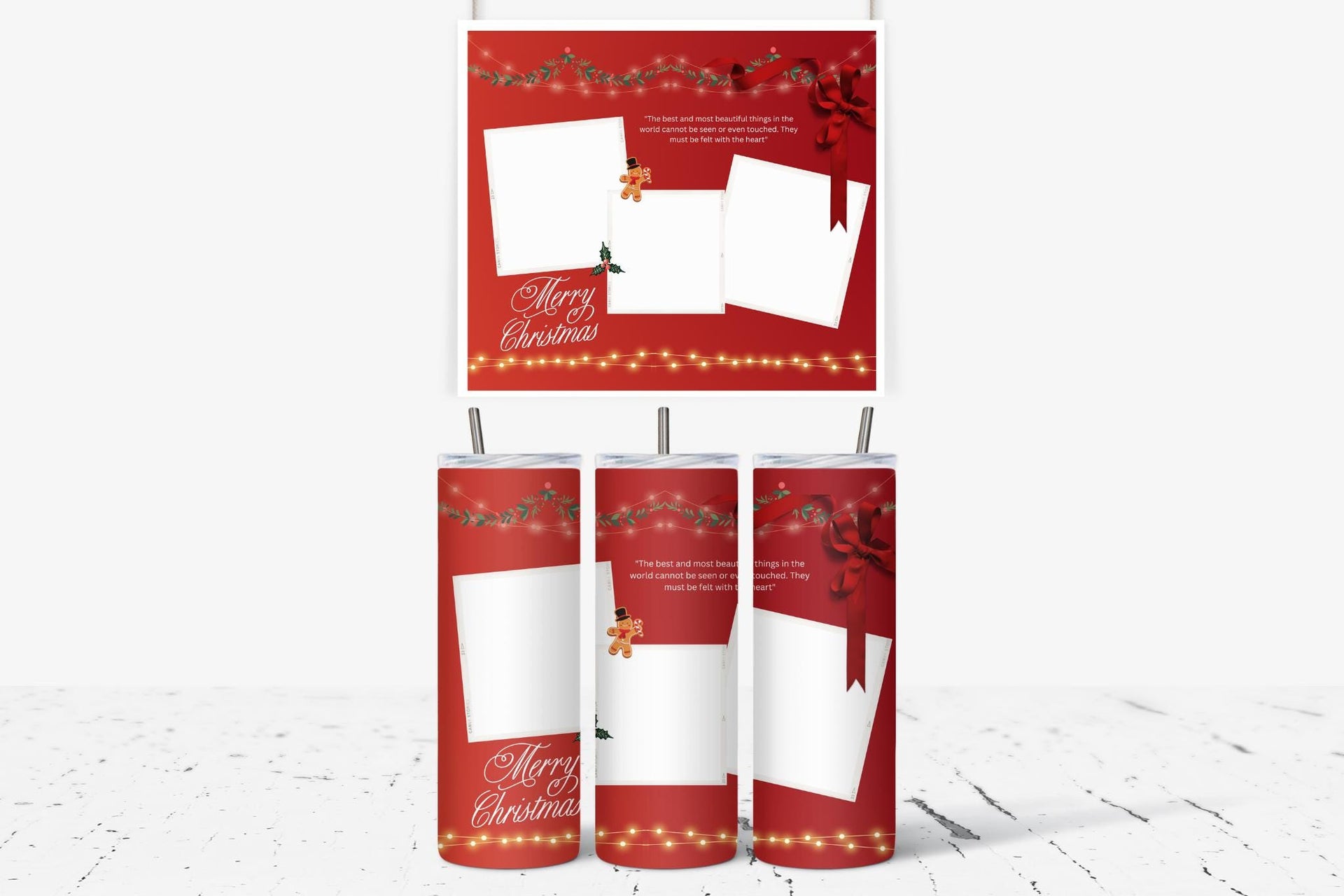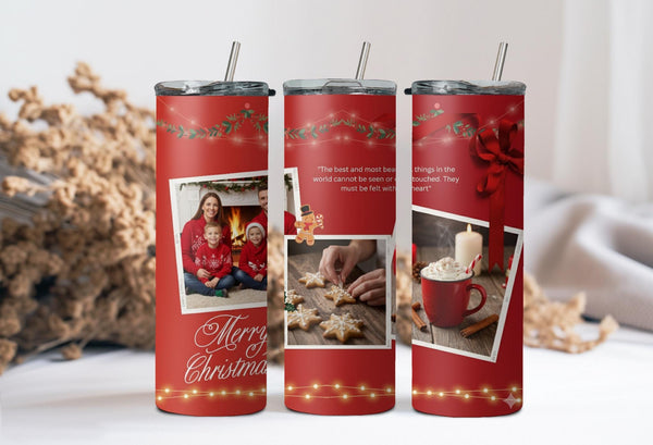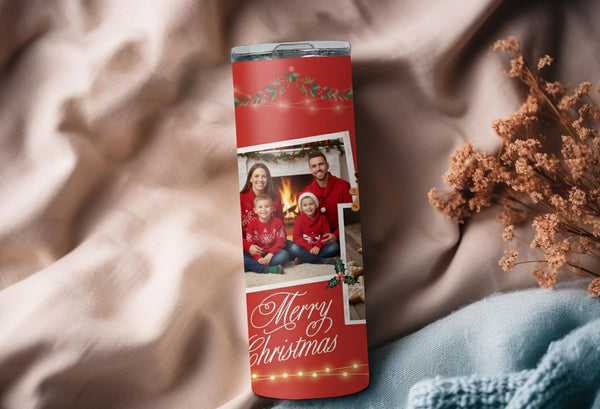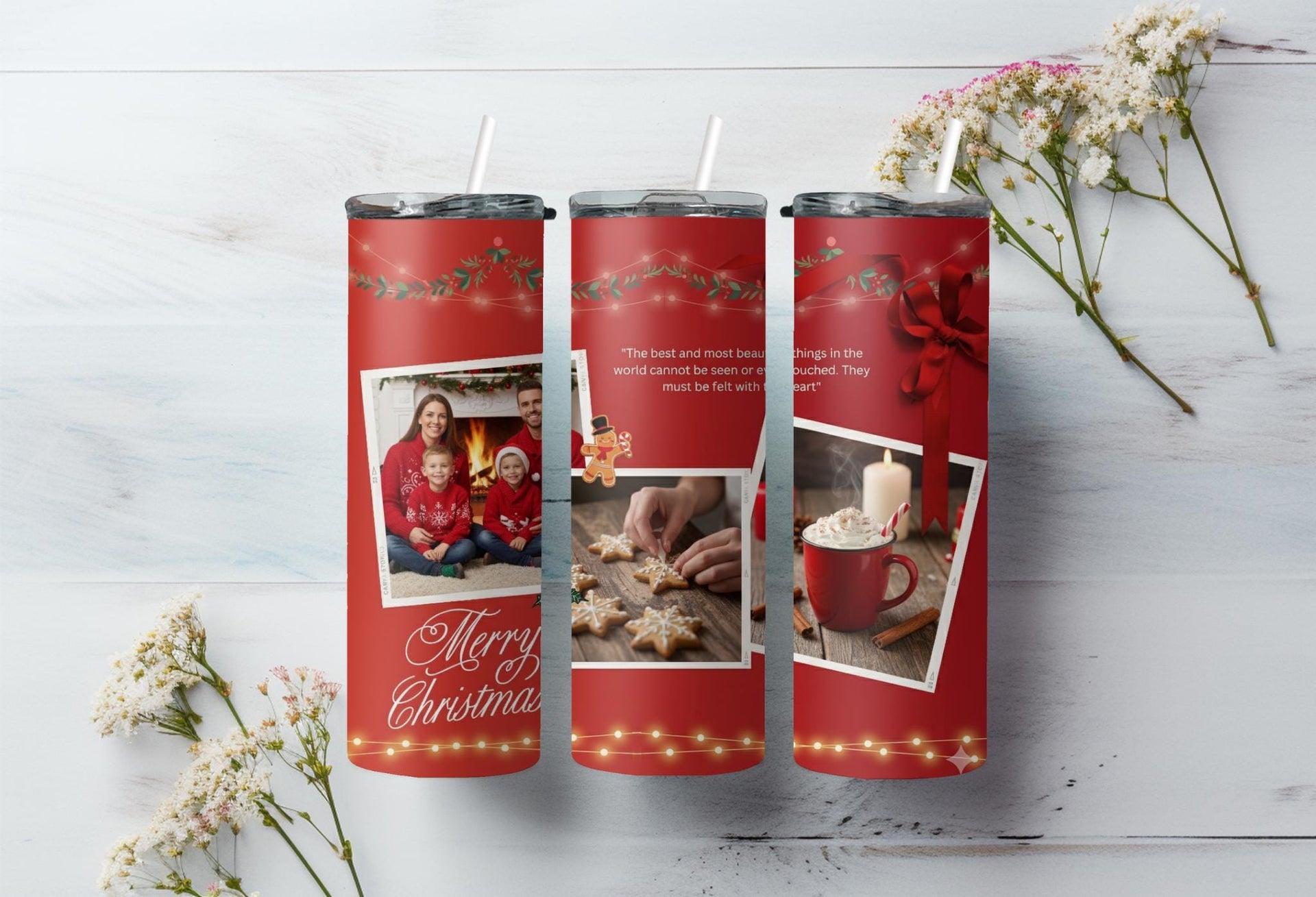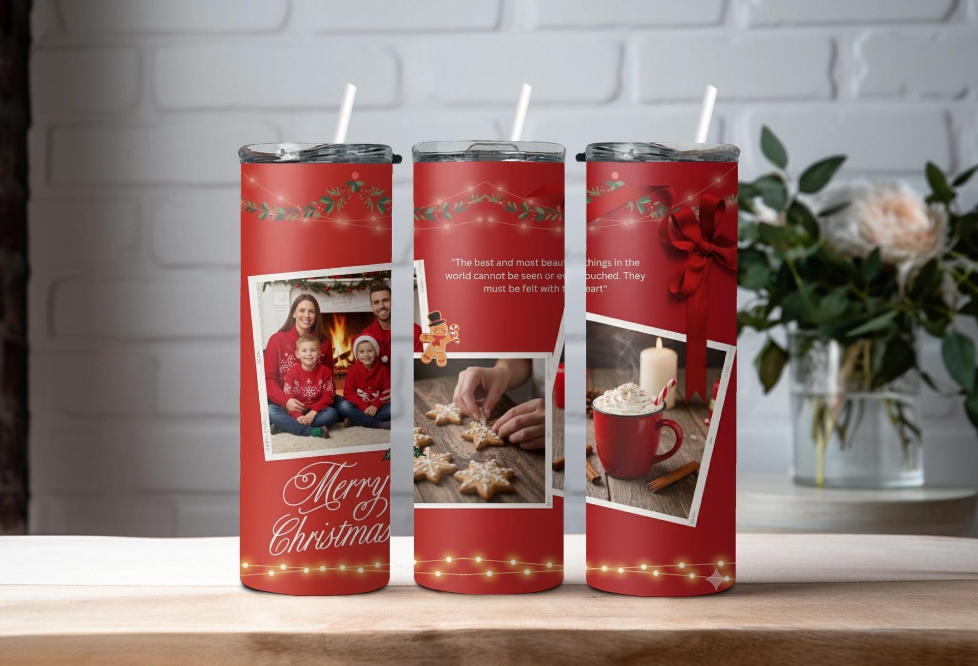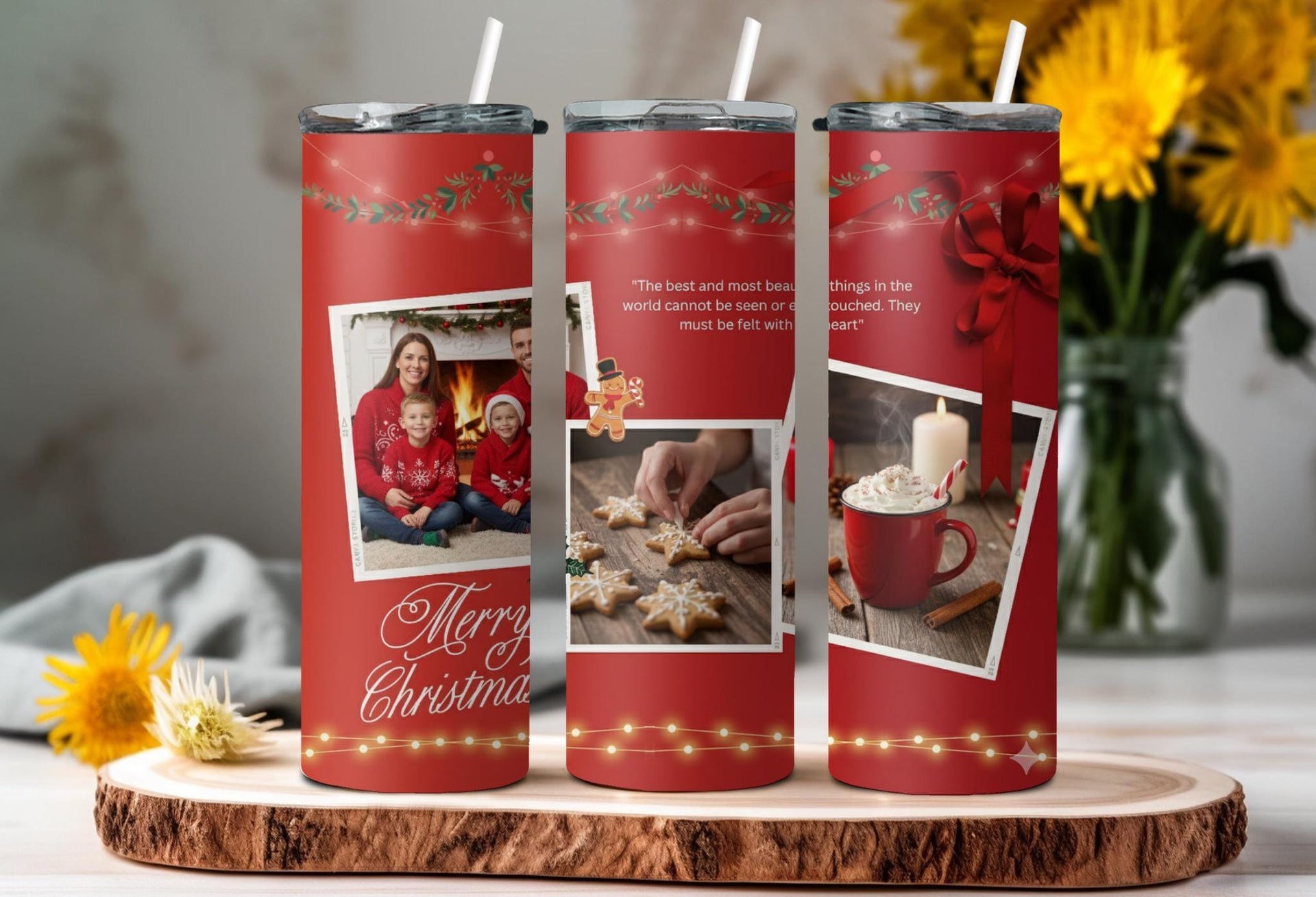 Get into the holiday spirit with our Holiday Cheer personalized Christmas photo tumbler! Adorned with festive decorations and a heartwarming quote, this tumbler also features 3 spaces for your favorite photos. Keep your drinks hot for up to 6 hours or cold for up to 24 hours and personalize it with a name. Spread joy and warmth this holiday season!