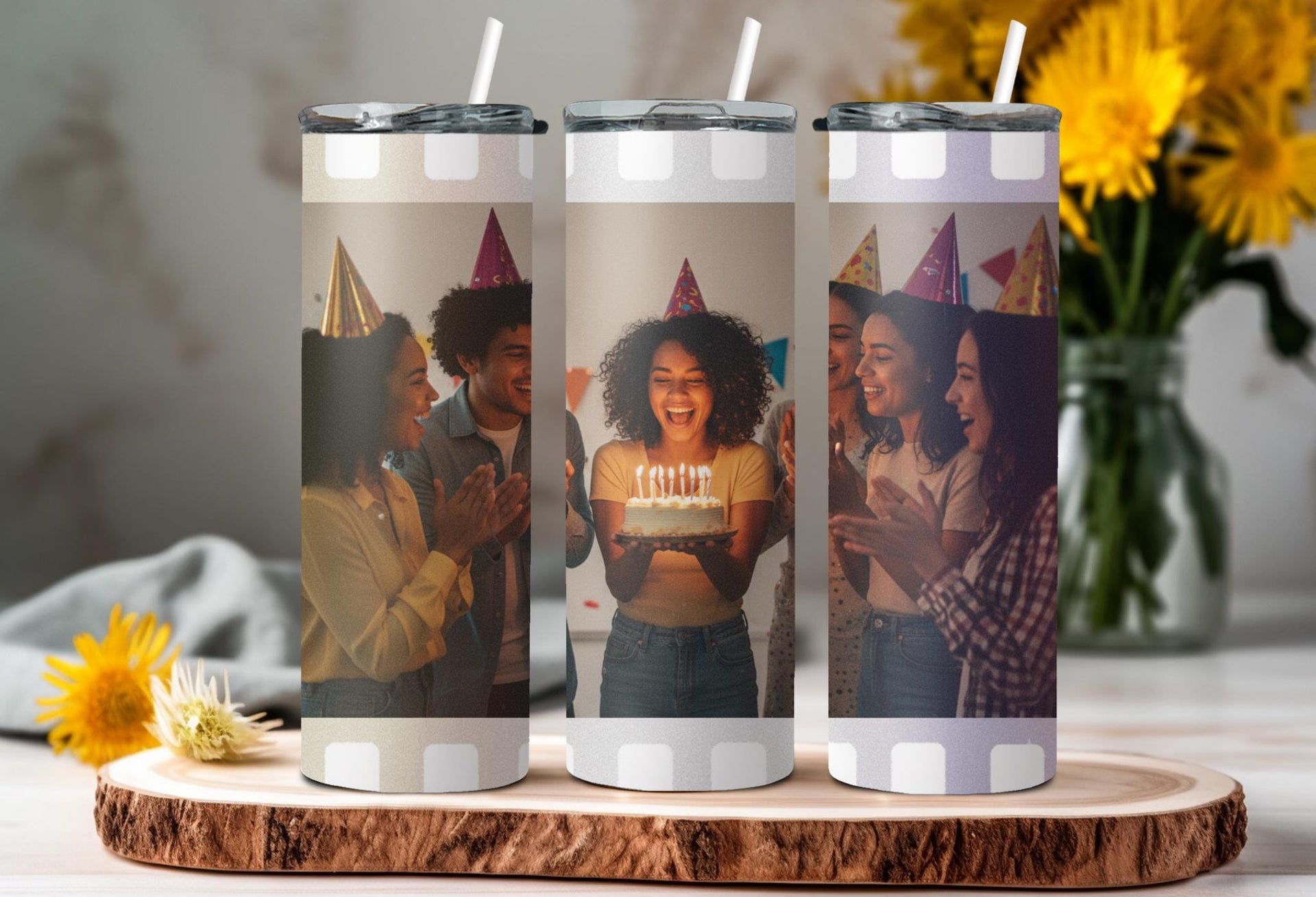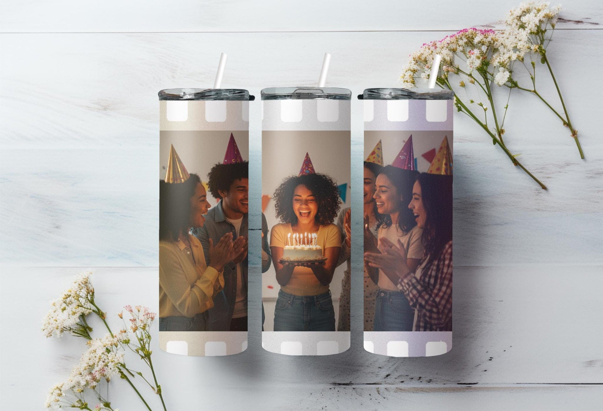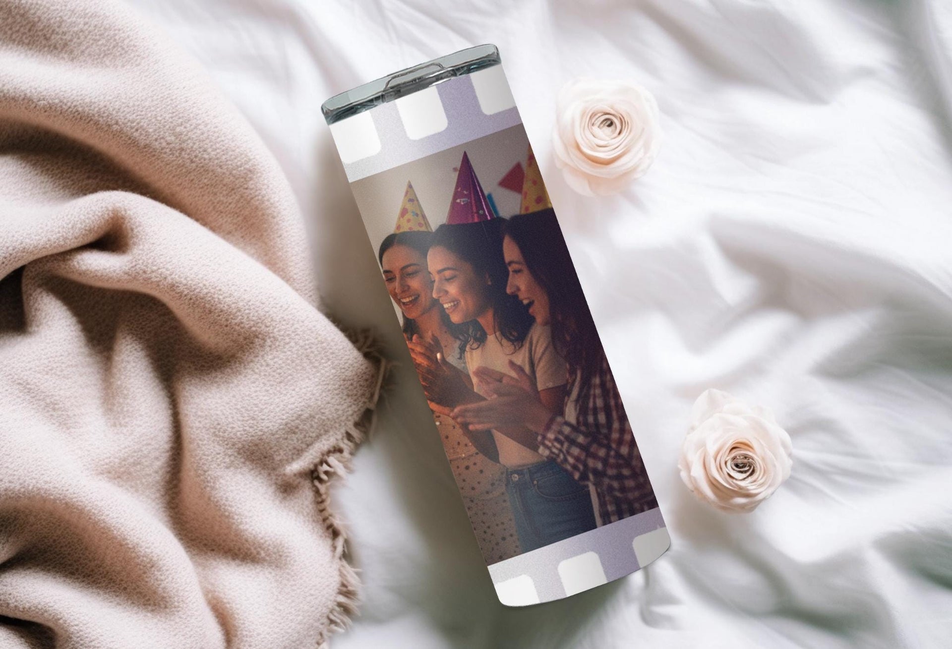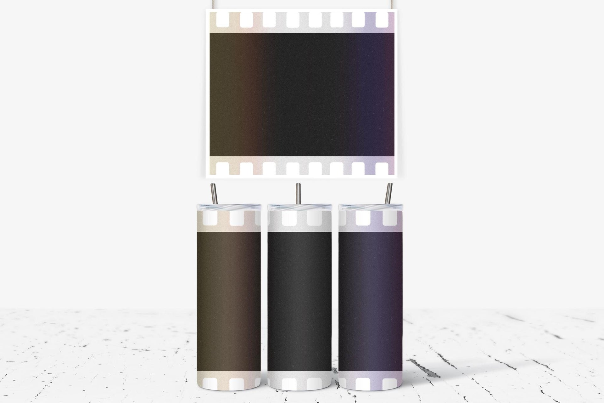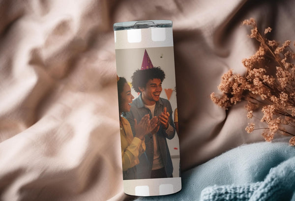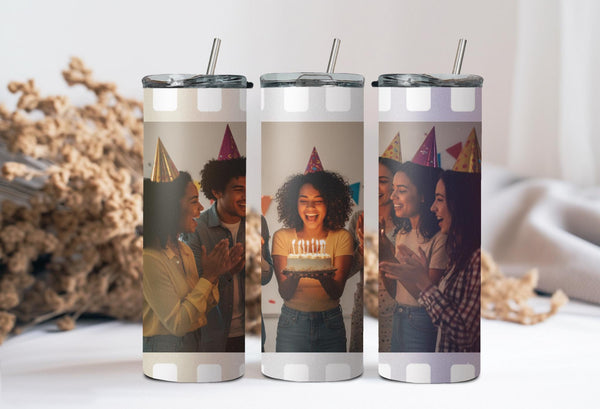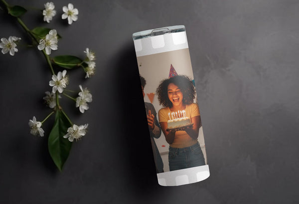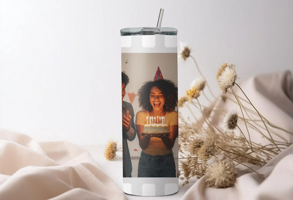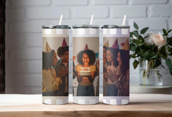 Experience the perfect blend of style and functionality with our Film Strip Photo Tumbler! Featuring a unique white film strip pattern and a customizable space for your photo, this tumbler keeps your drinks hot for up to 6 hours and cold for up to 24 hours. Don't settle for a boring tumbler - personalize it with your name today!