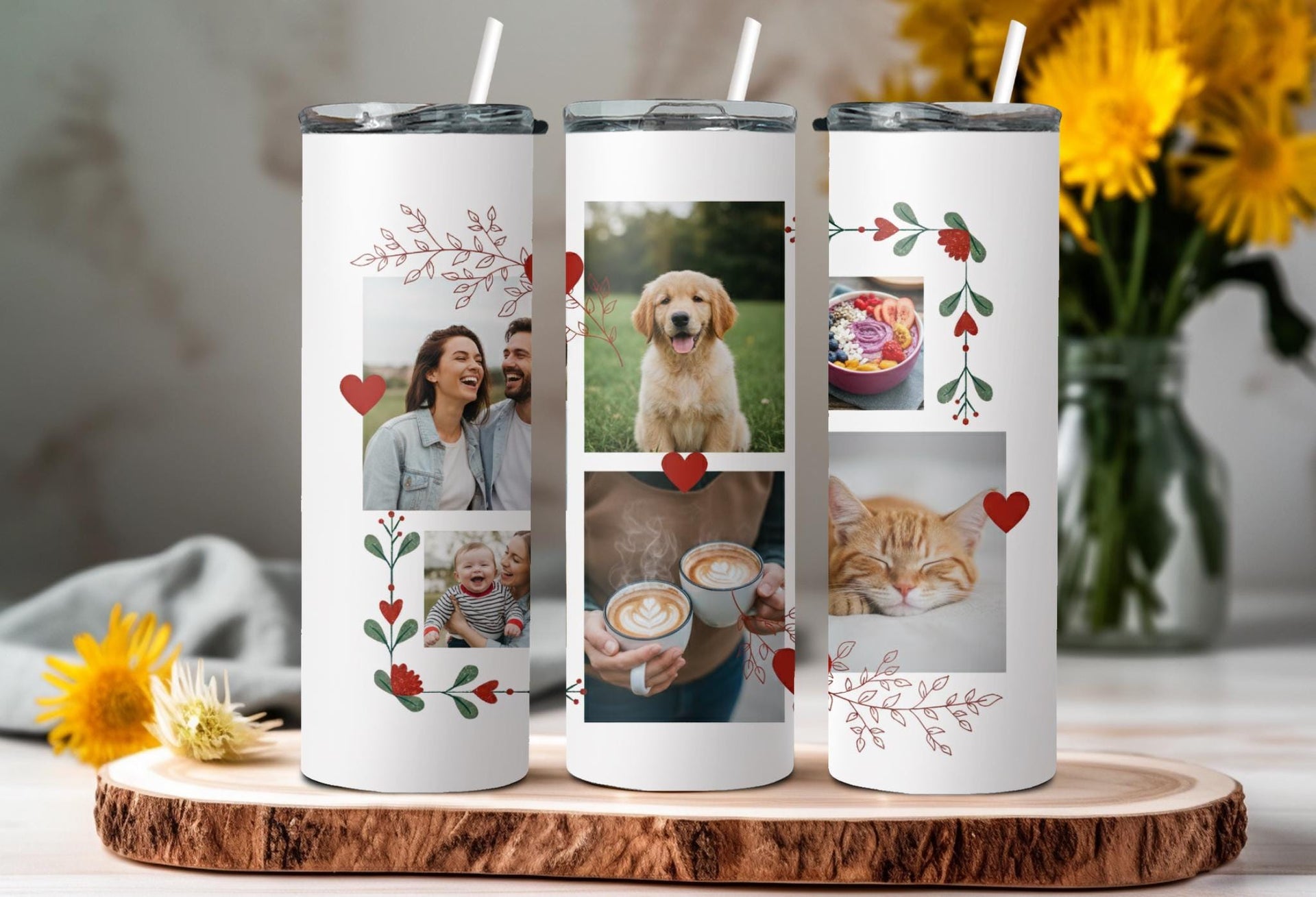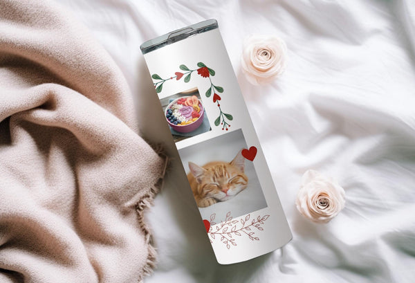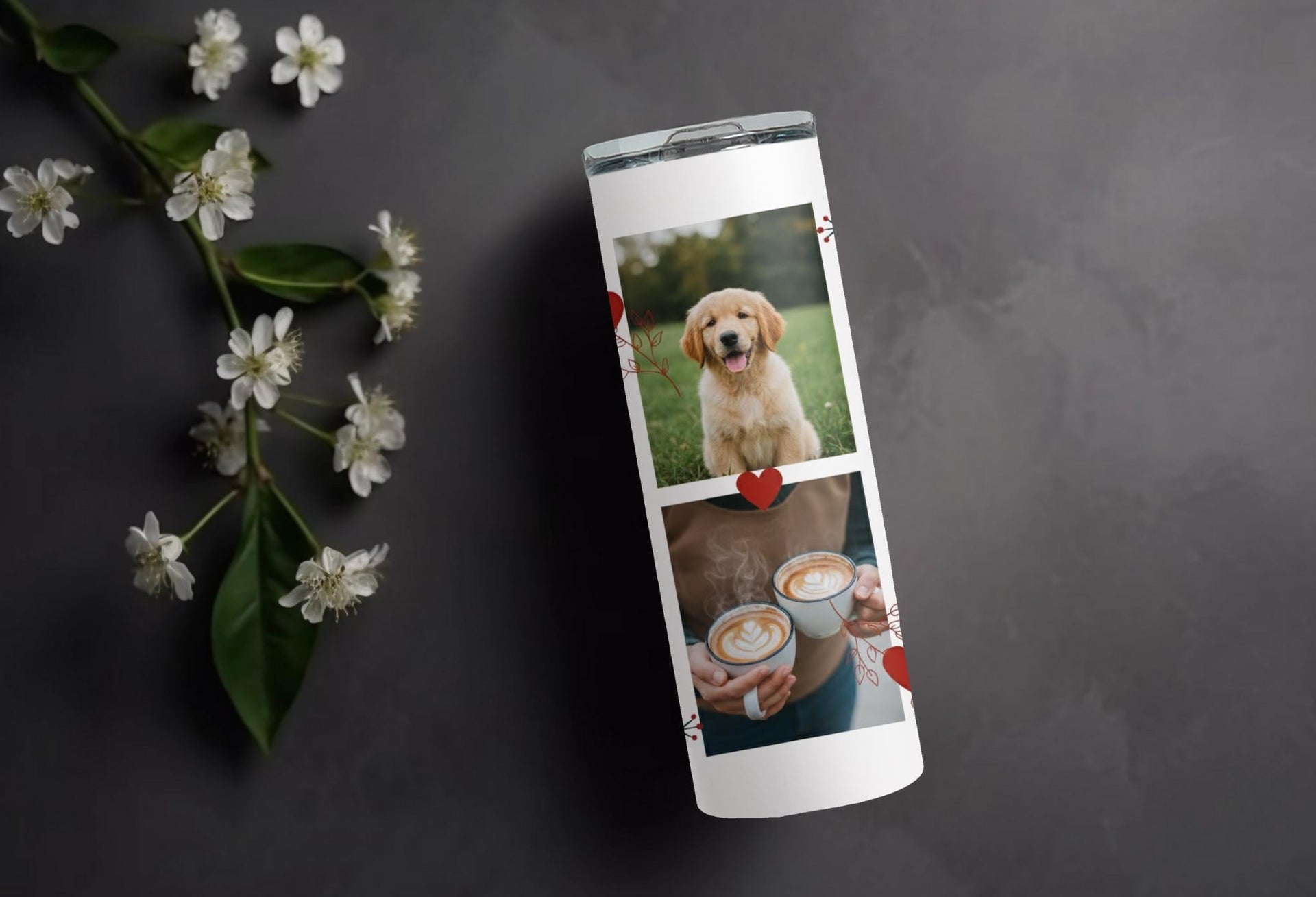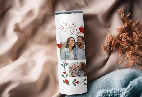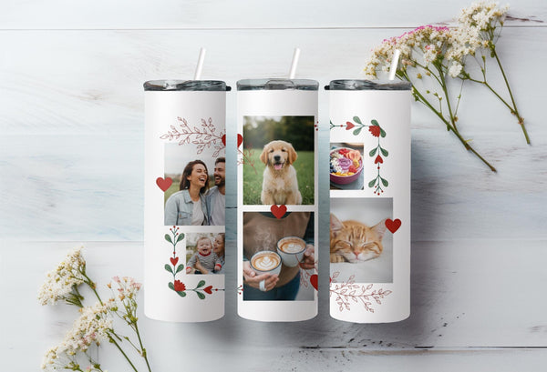 Indulge in romance with our Floral Heart Photo Tumbler. Adorned with soft pink panels, delicate hearts, and floral accents, this tumbler exudes elegance and charm. Keep drinks hot for up to 6 hours and cold for up to 24 hours. Personalize it with a name and add photos for a truly unique touch.