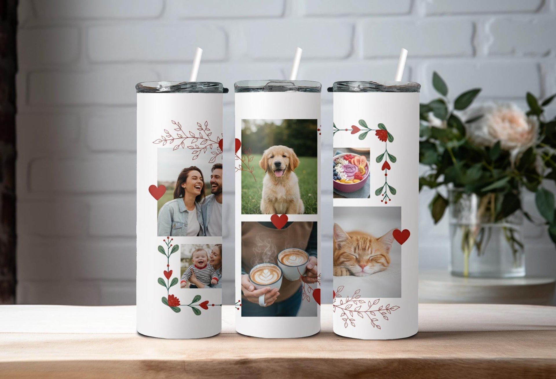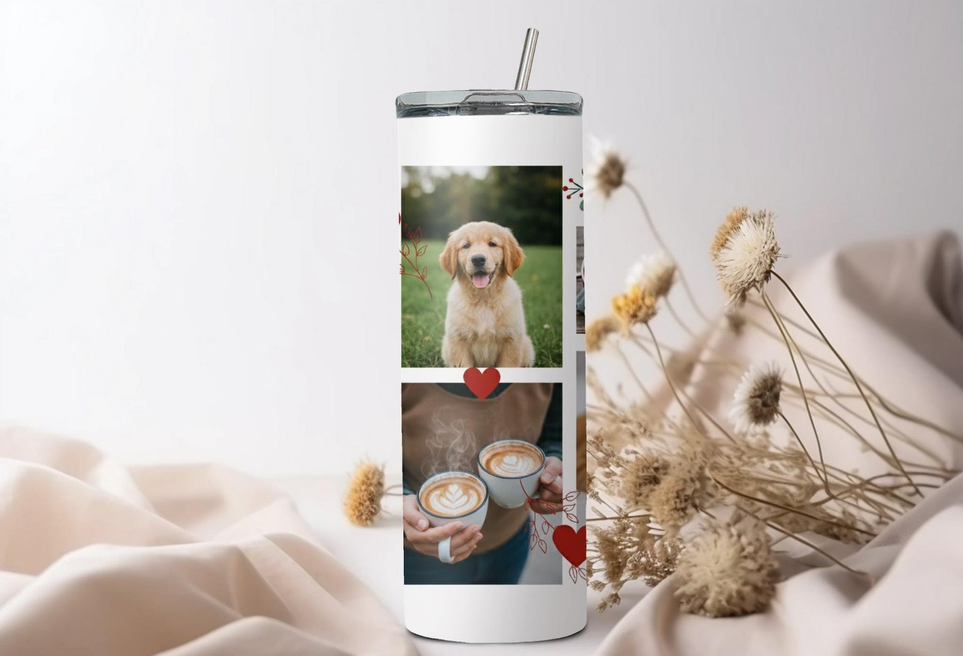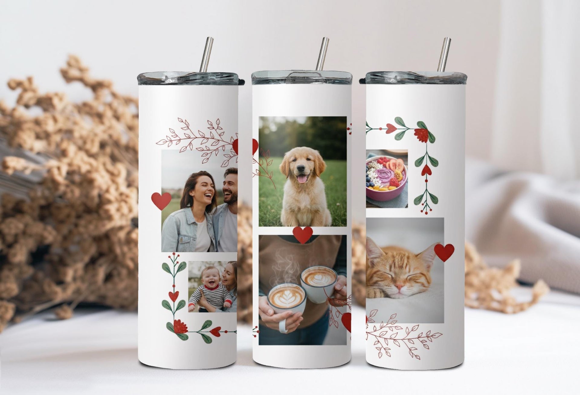 Indulge in romance with our Floral Heart Photo Tumbler. Adorned with soft pink panels, delicate hearts, and floral accents, this tumbler exudes elegance and charm. Keep drinks hot for up to 6 hours and cold for up to 24 hours. Personalize it with a name and add photos for a truly unique touch.