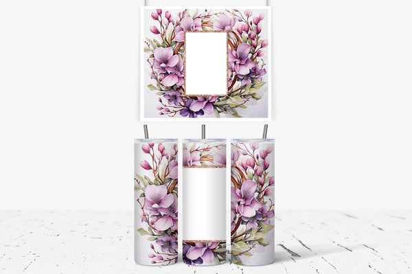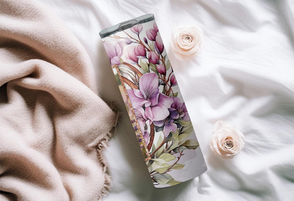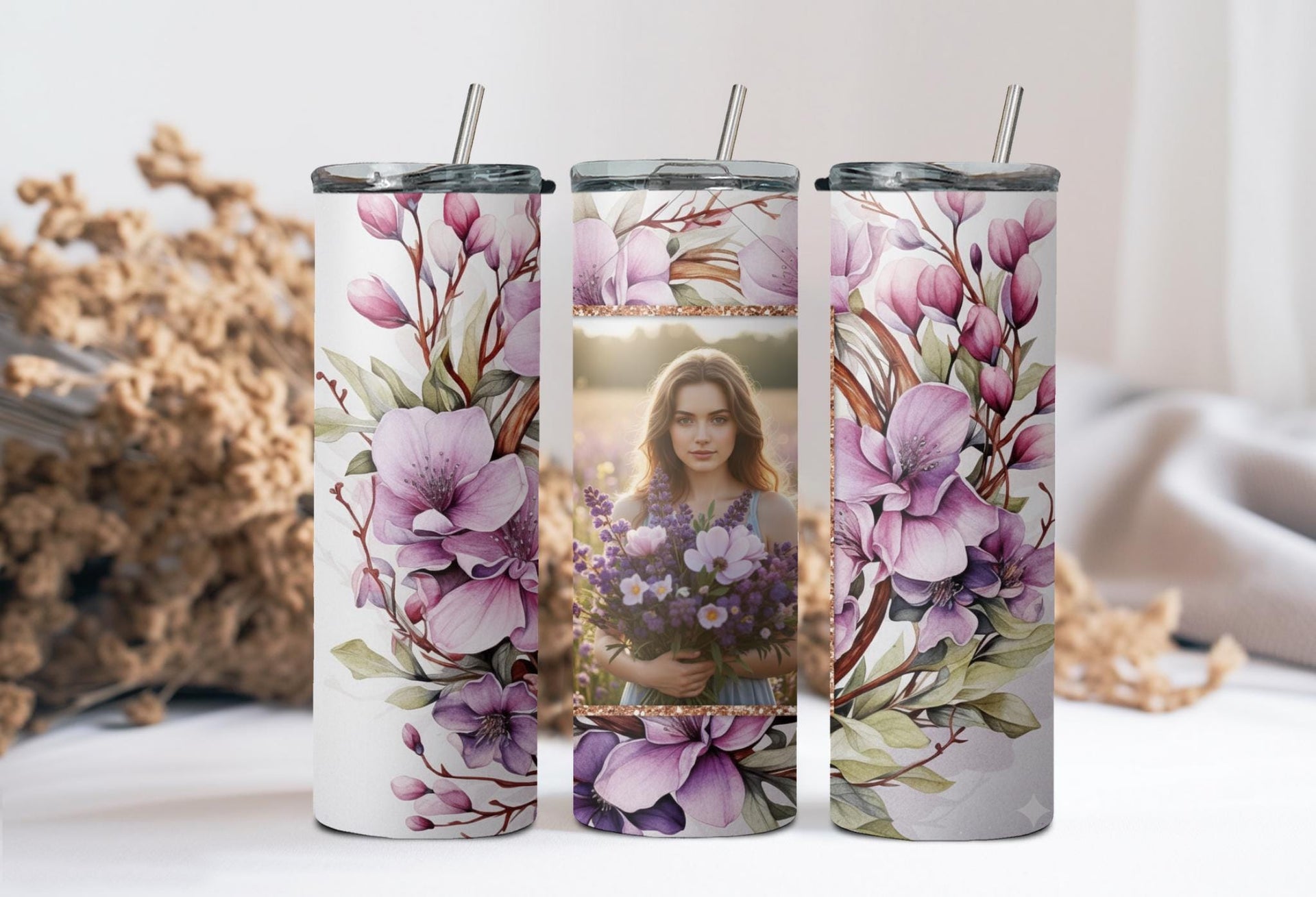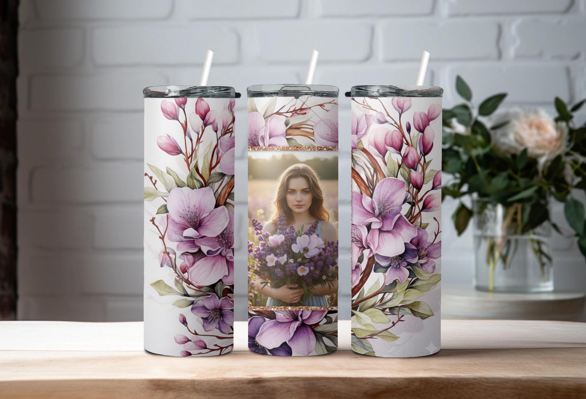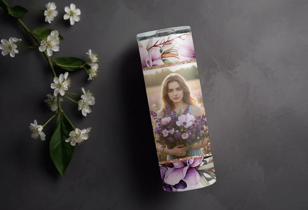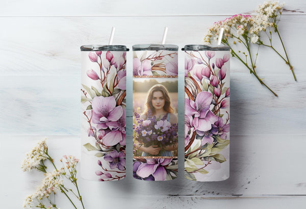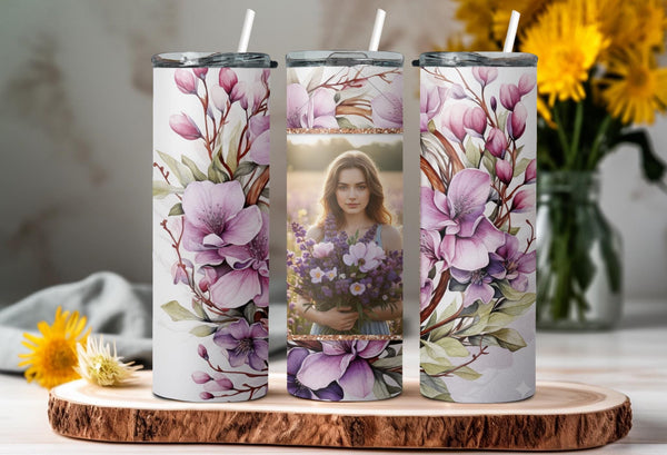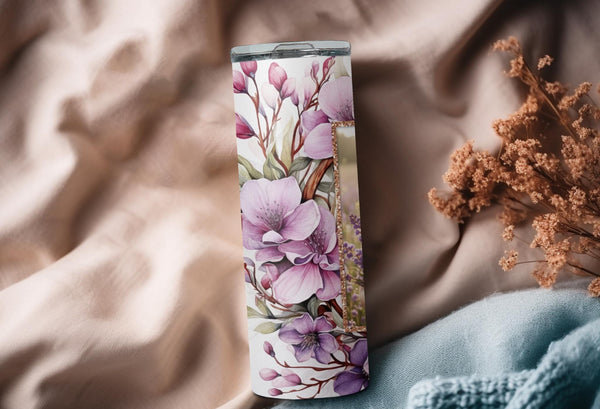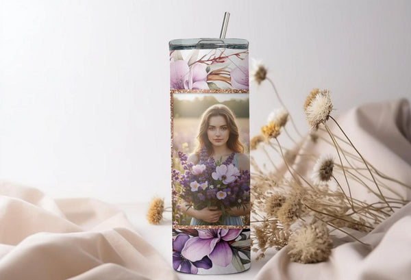 Personalized Floral Photo Tumbler: Glitter Purple Flowers, 20oz Skinny Tumbler